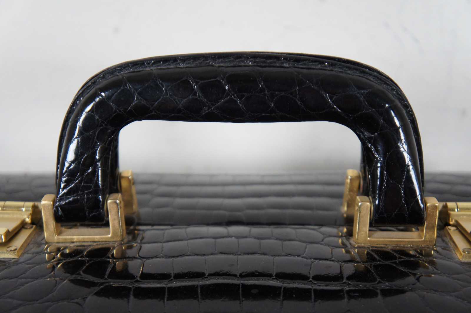 Rare vintage Creazioni Parapini for Antonio da Pescara, made in Italy, black alligator skin leather train, beauty / cosmetics / jewelry / doctor travel case or luggage with combination lock clasps, split center lid, and tan interior.