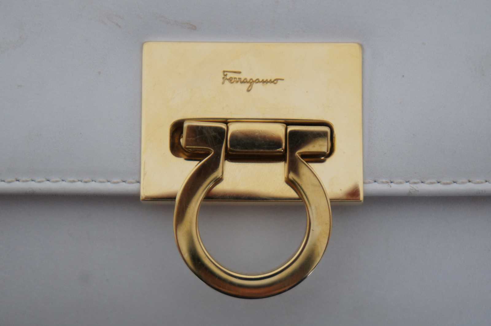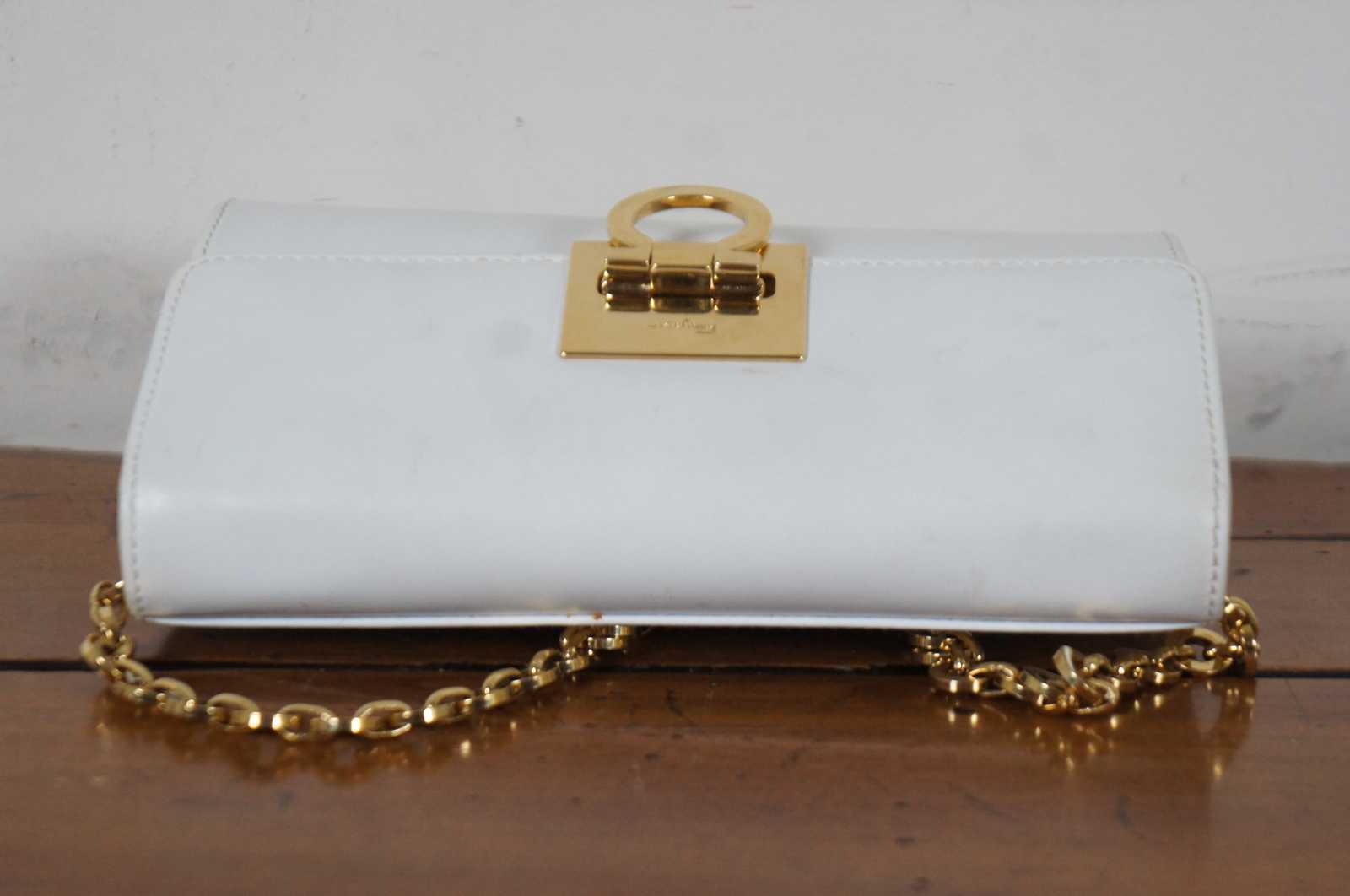 Vintage Salvatore Ferragamo, white Epsom leather crossbody purse or clutch on a gold tone chain, number AQ-21 8752, made in Italy with buckle closure, and black interior subtly patterned with the Gancini monogram.