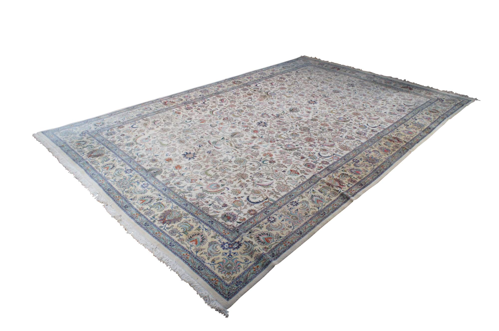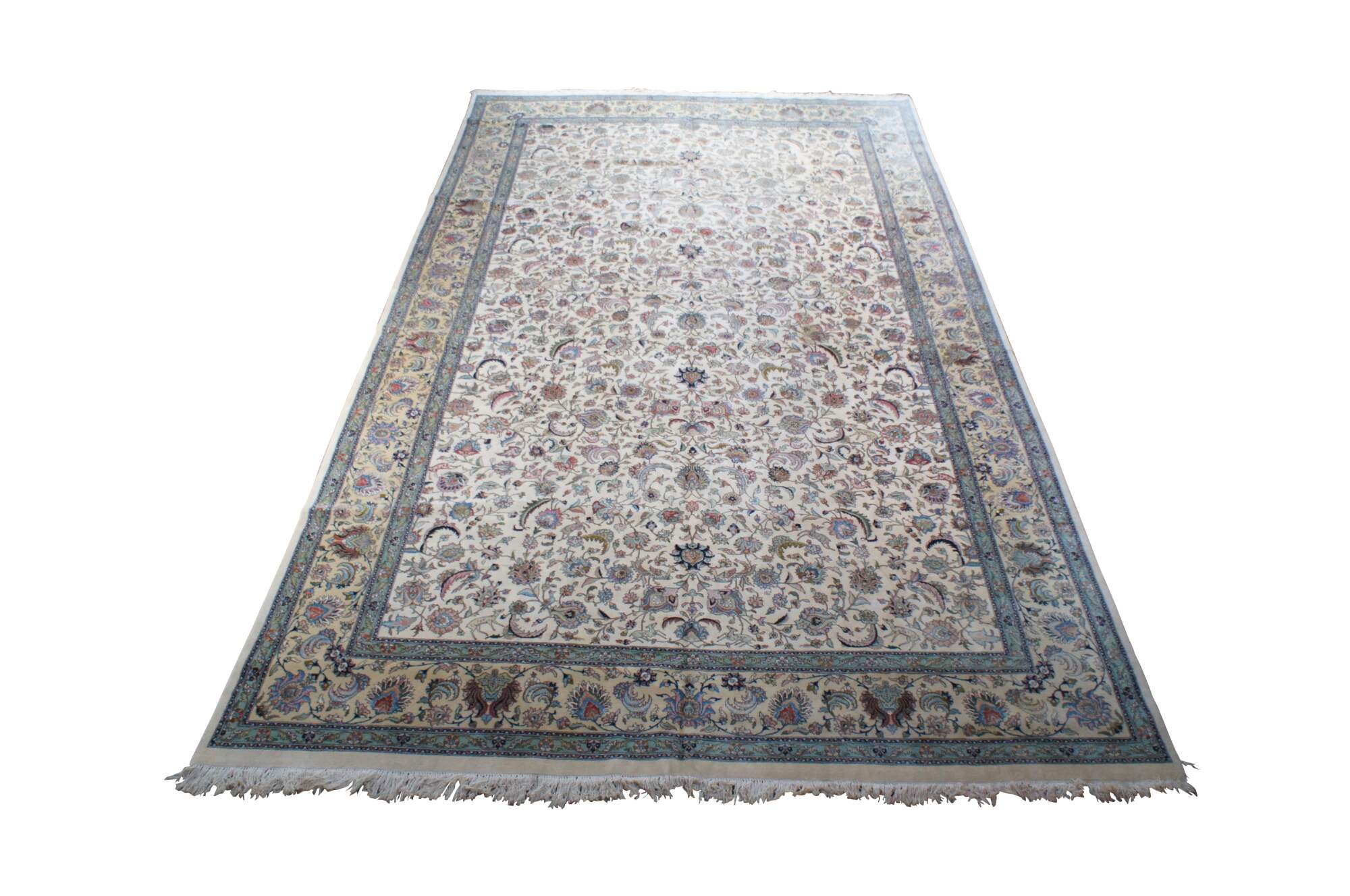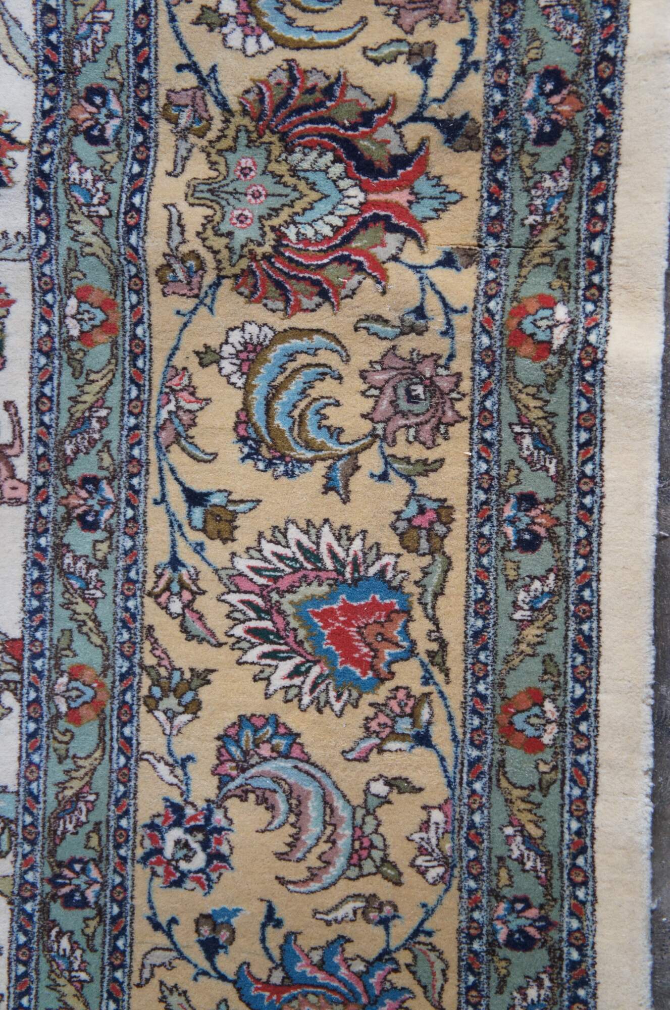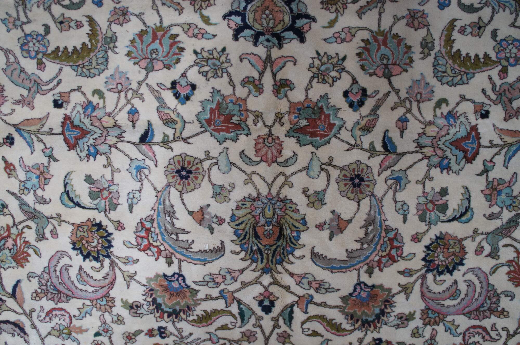 A large and impressive 100% wool pile area rug featuring a floral scene with animals (Deer, Birds) on a beige field with pinks, greens, browns, reds, tans, blues and greens.