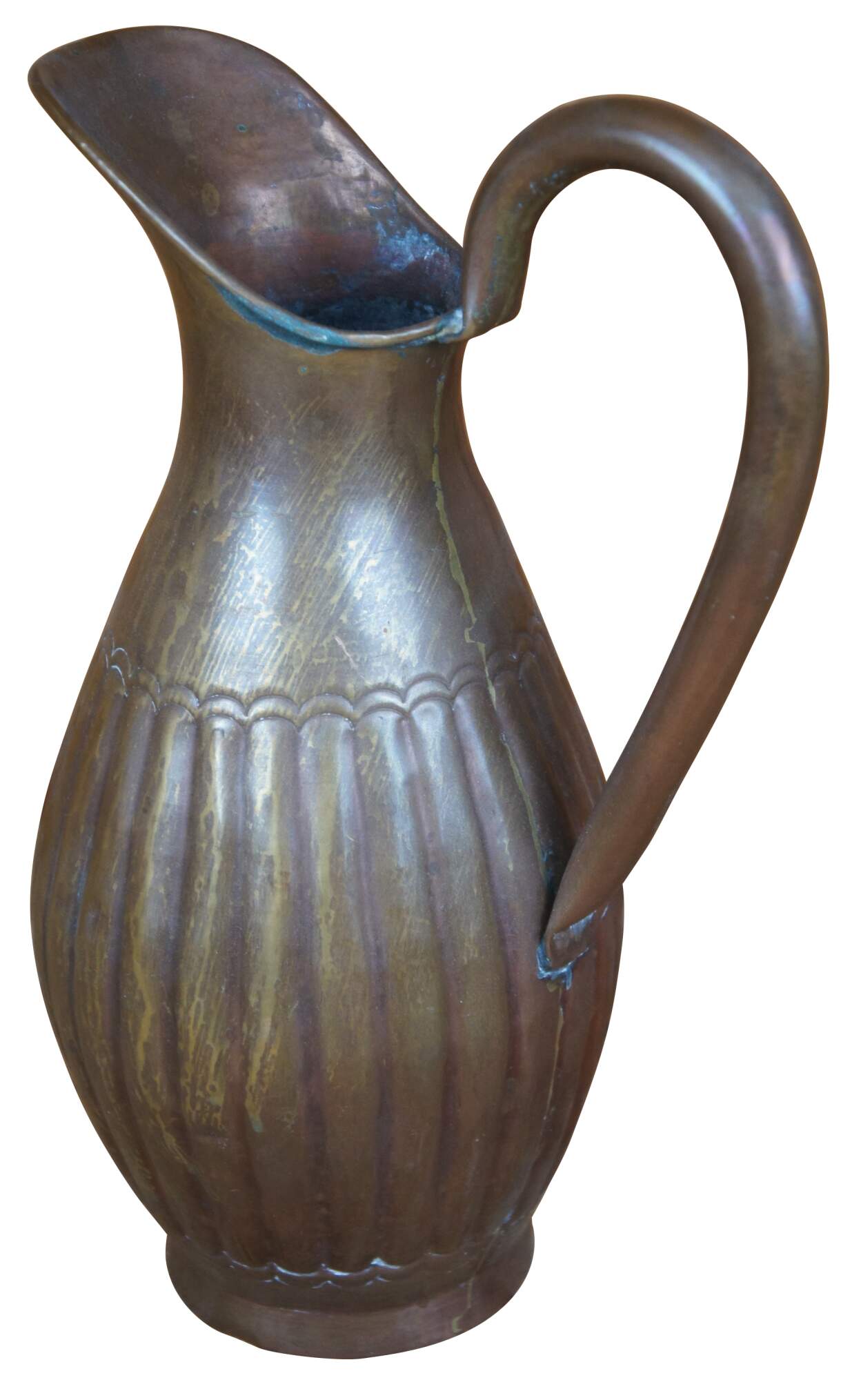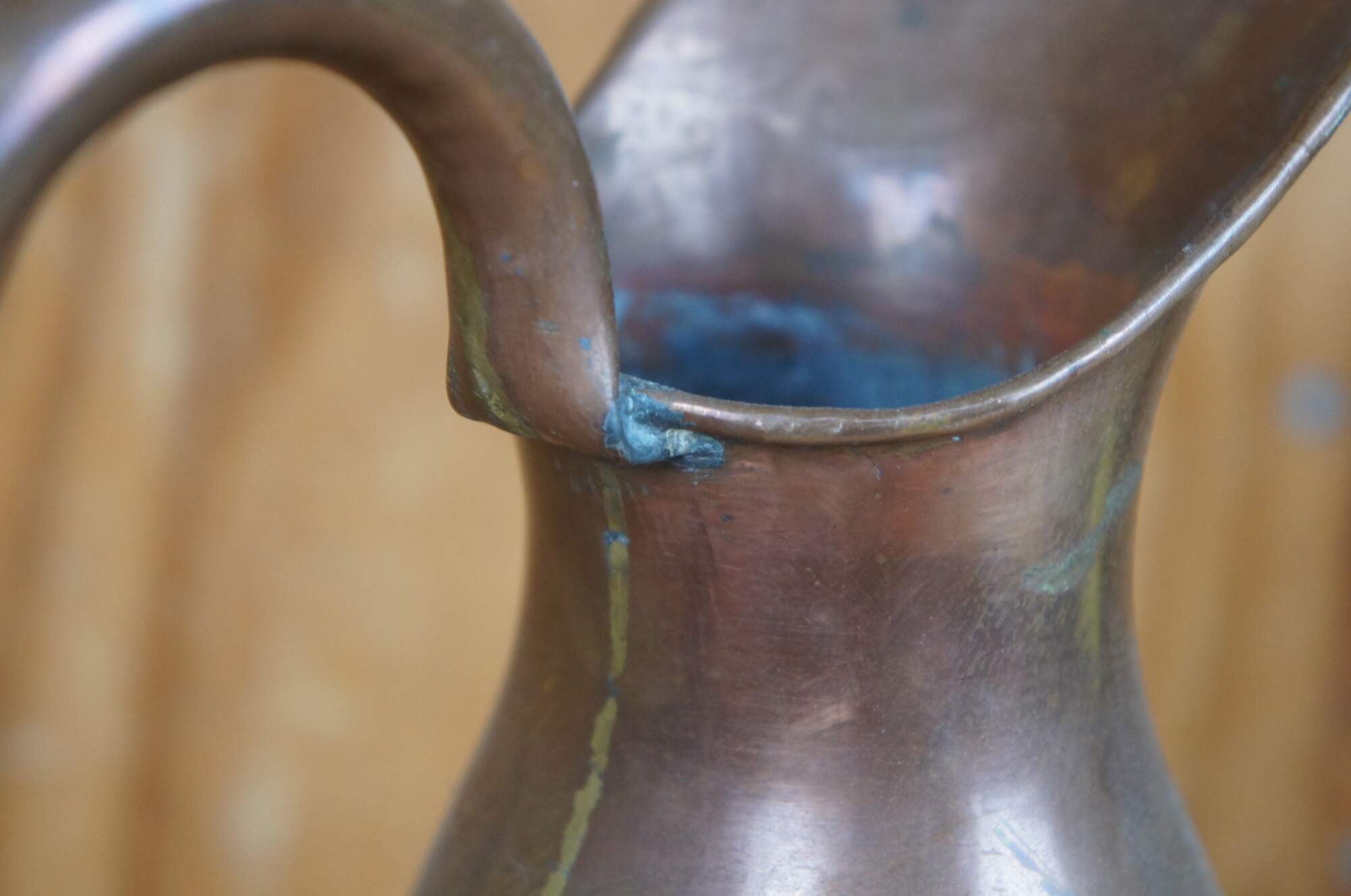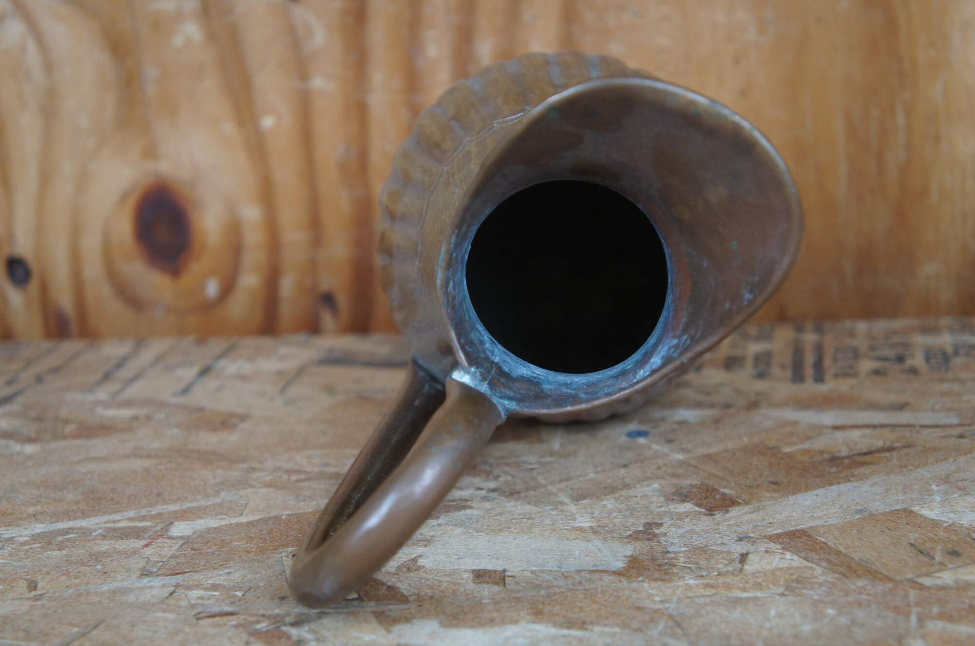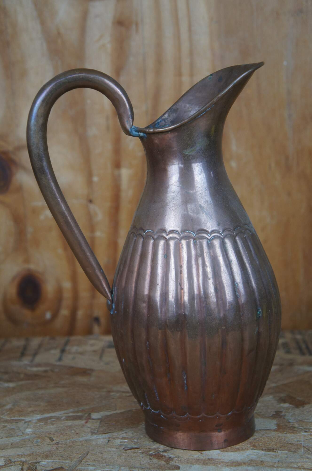 Antique hammered dovetailed copper pitcher featuring a large handle and sloped spout.