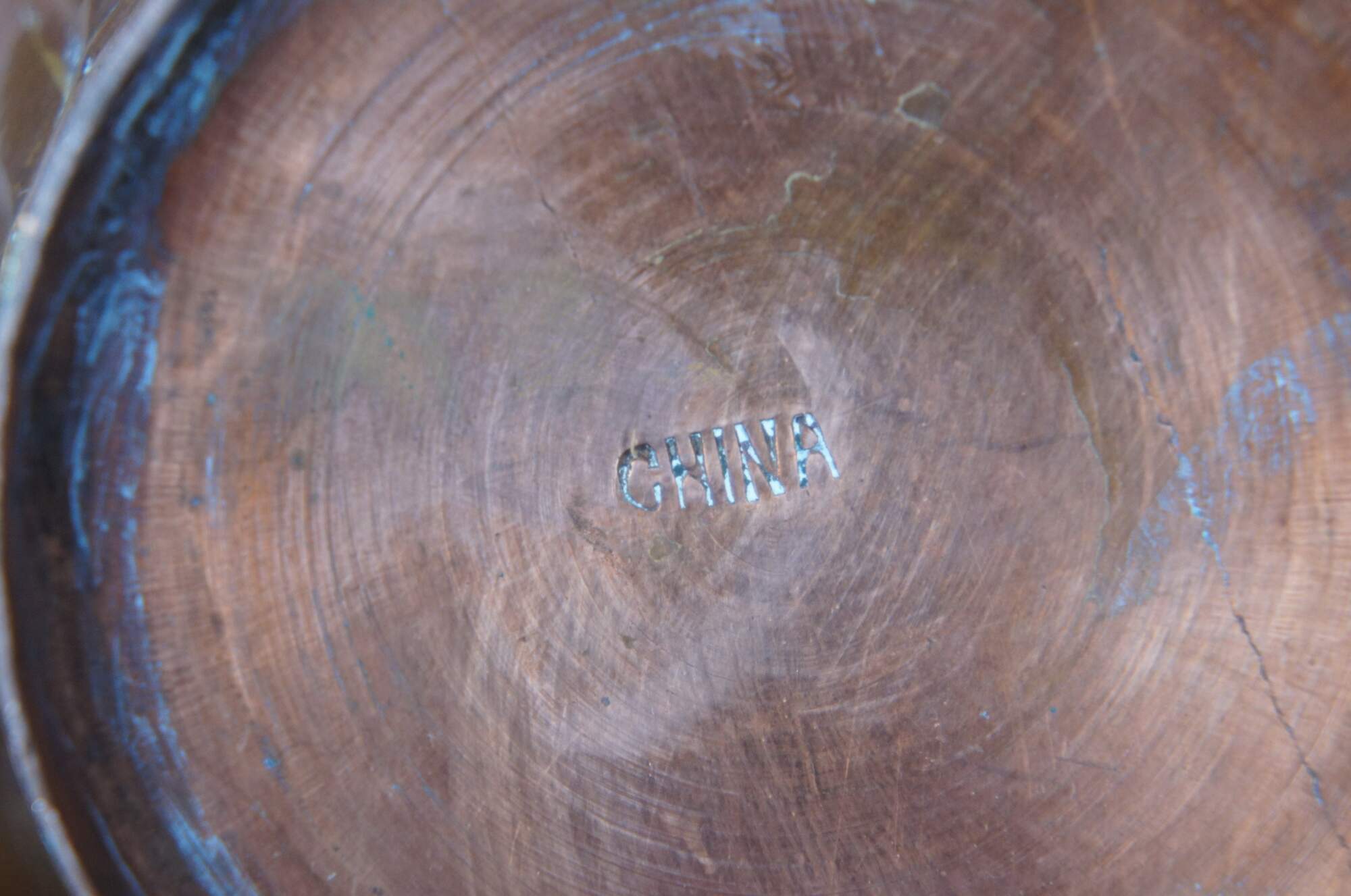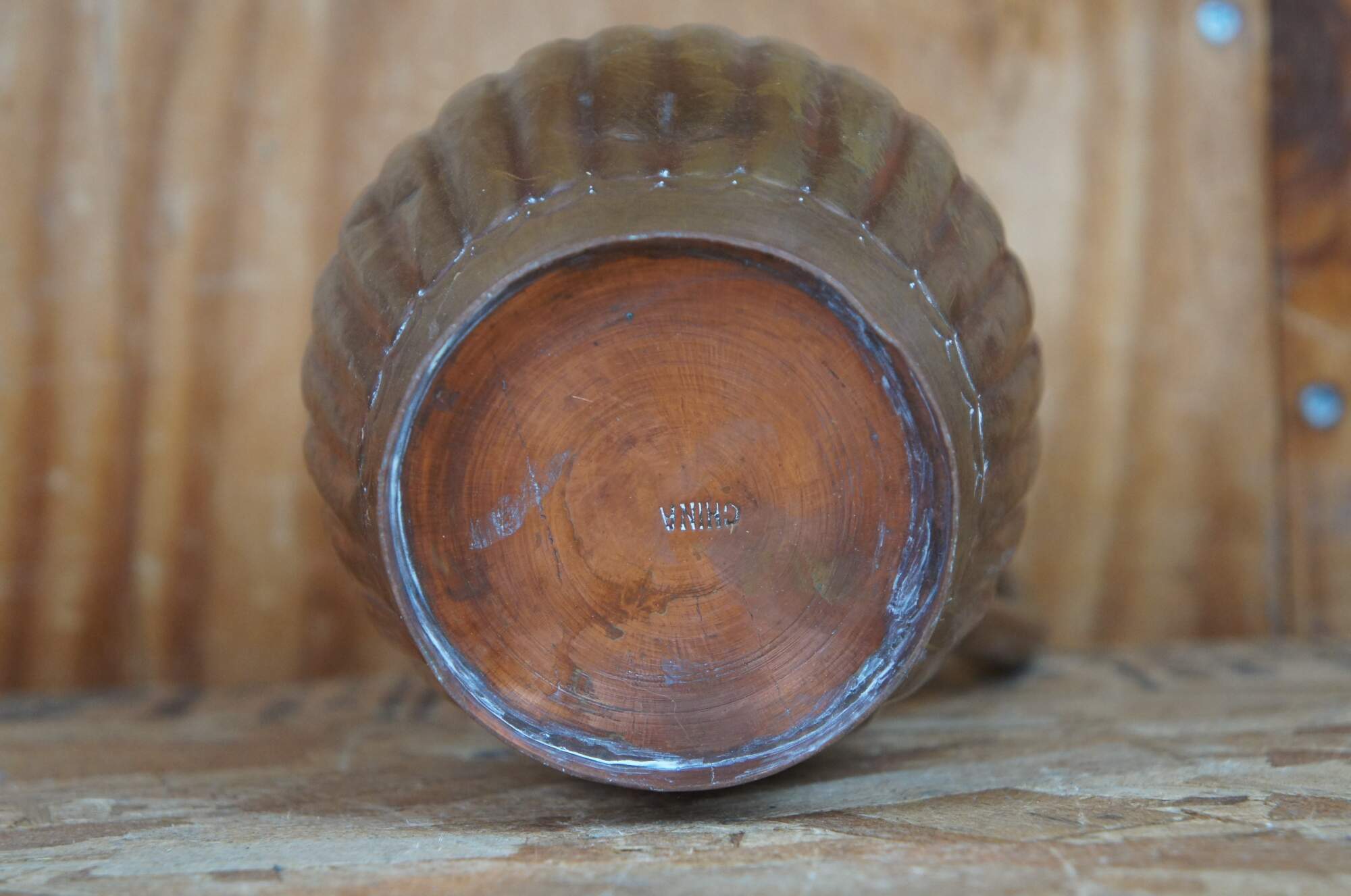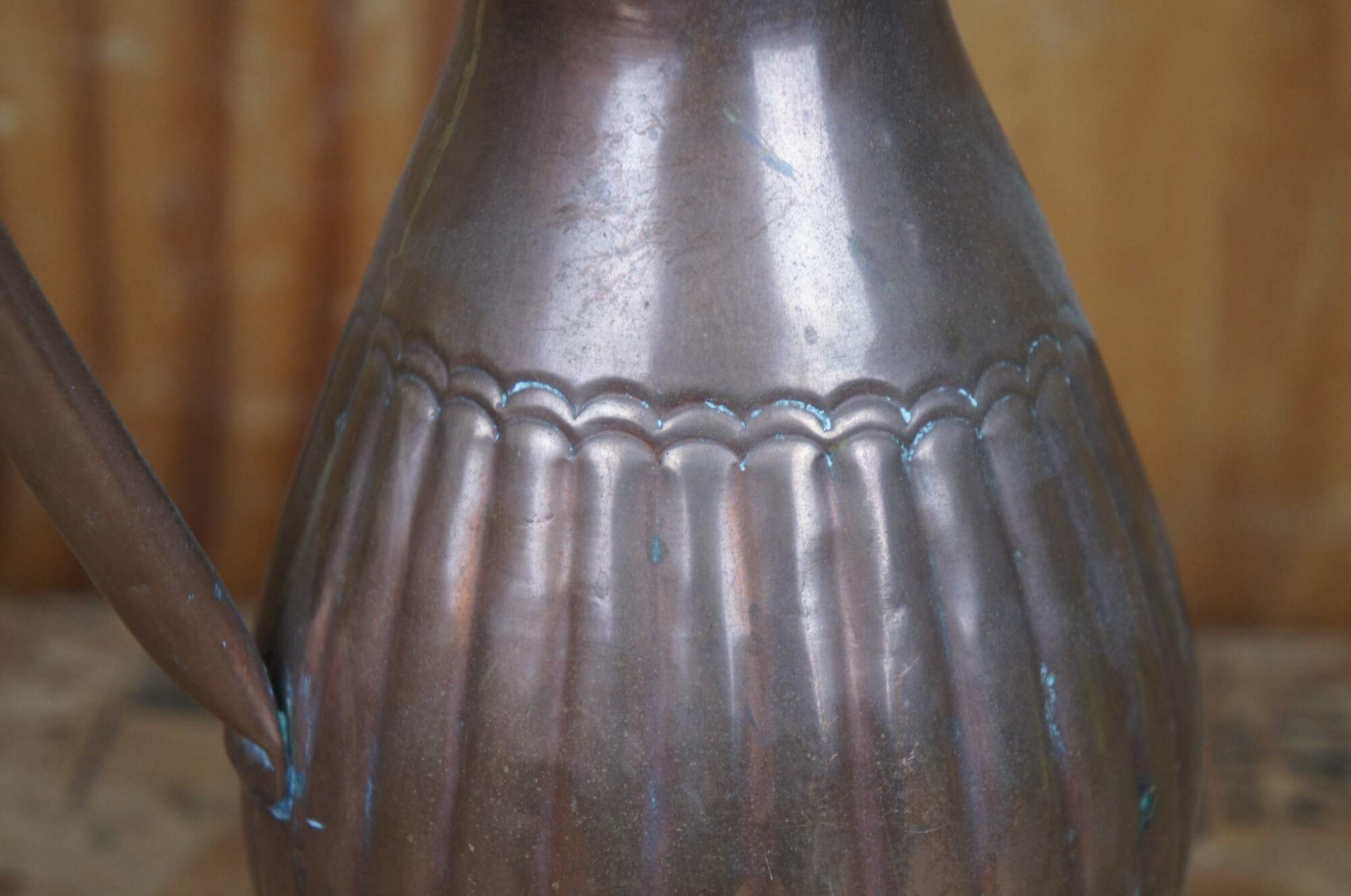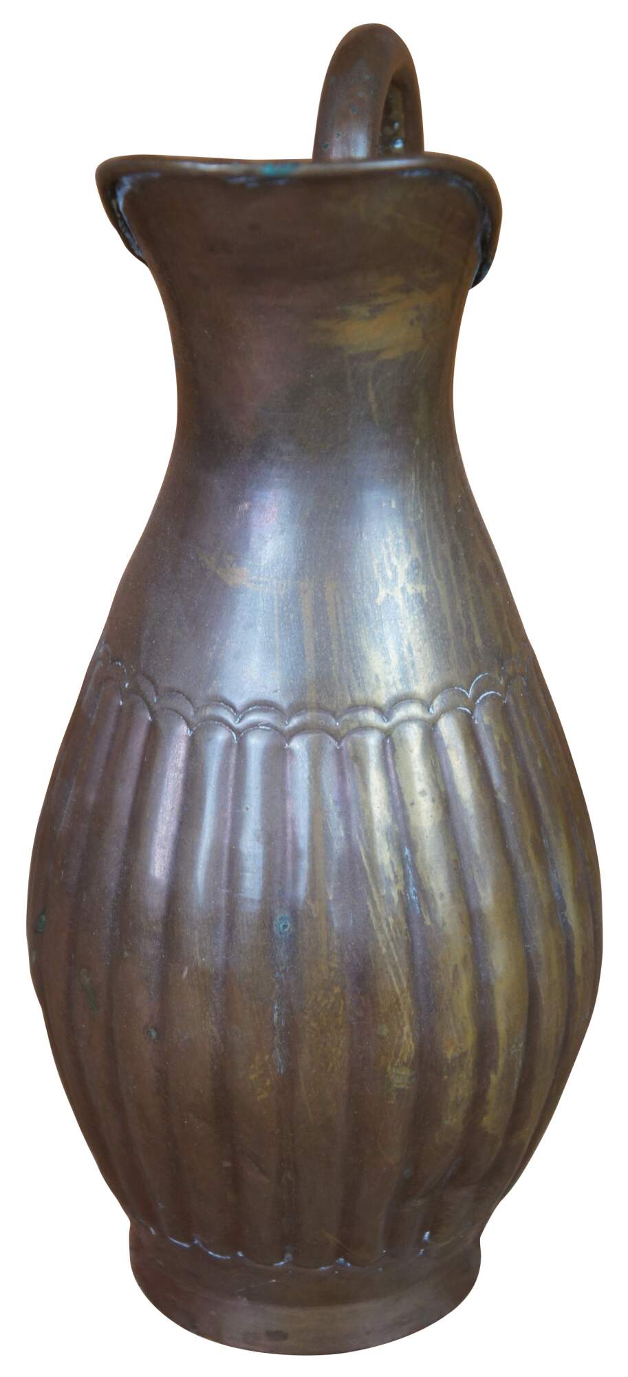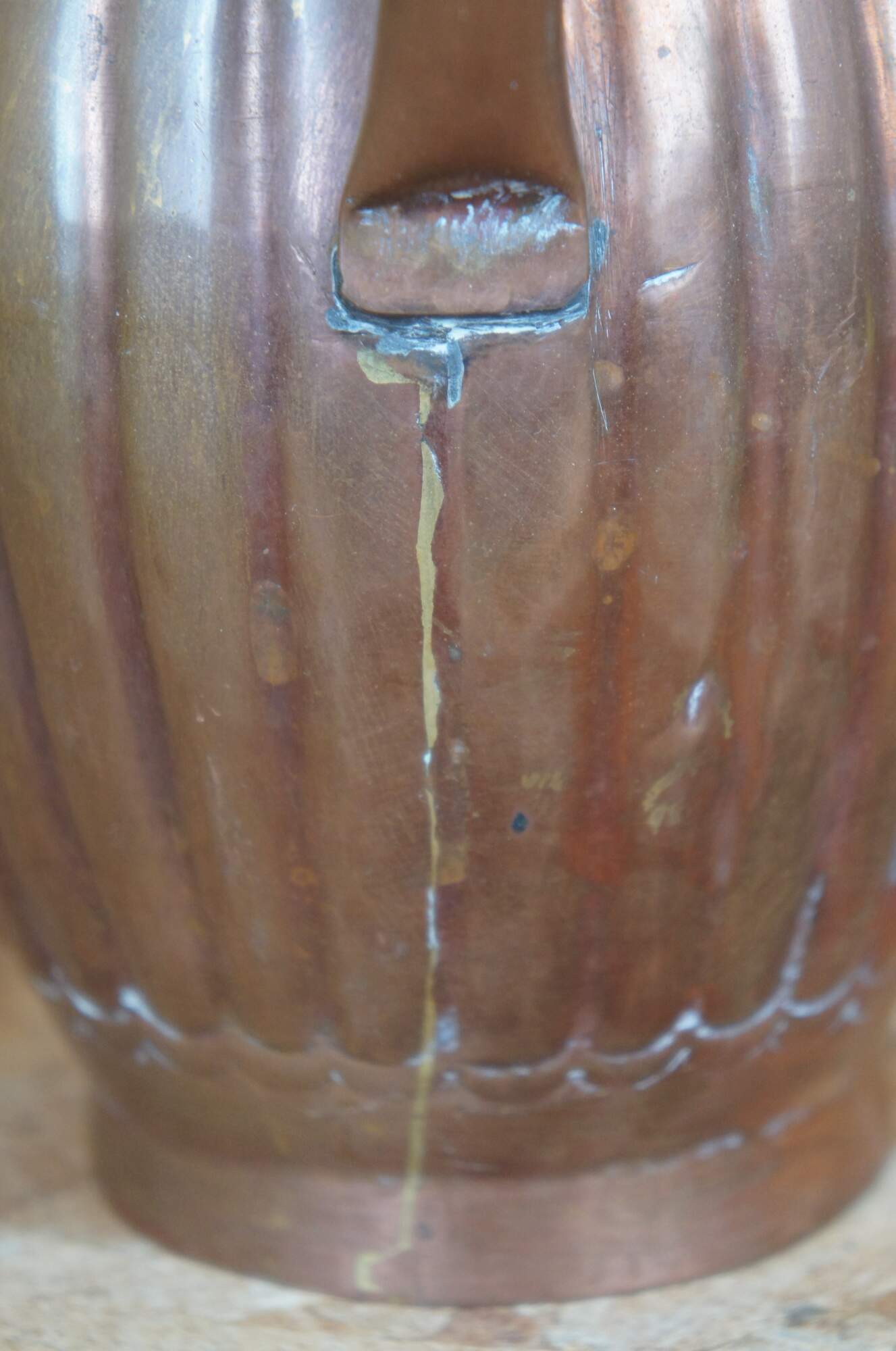Antique hammered dovetailed copper pitcher featuring a large handle and sloped spout.