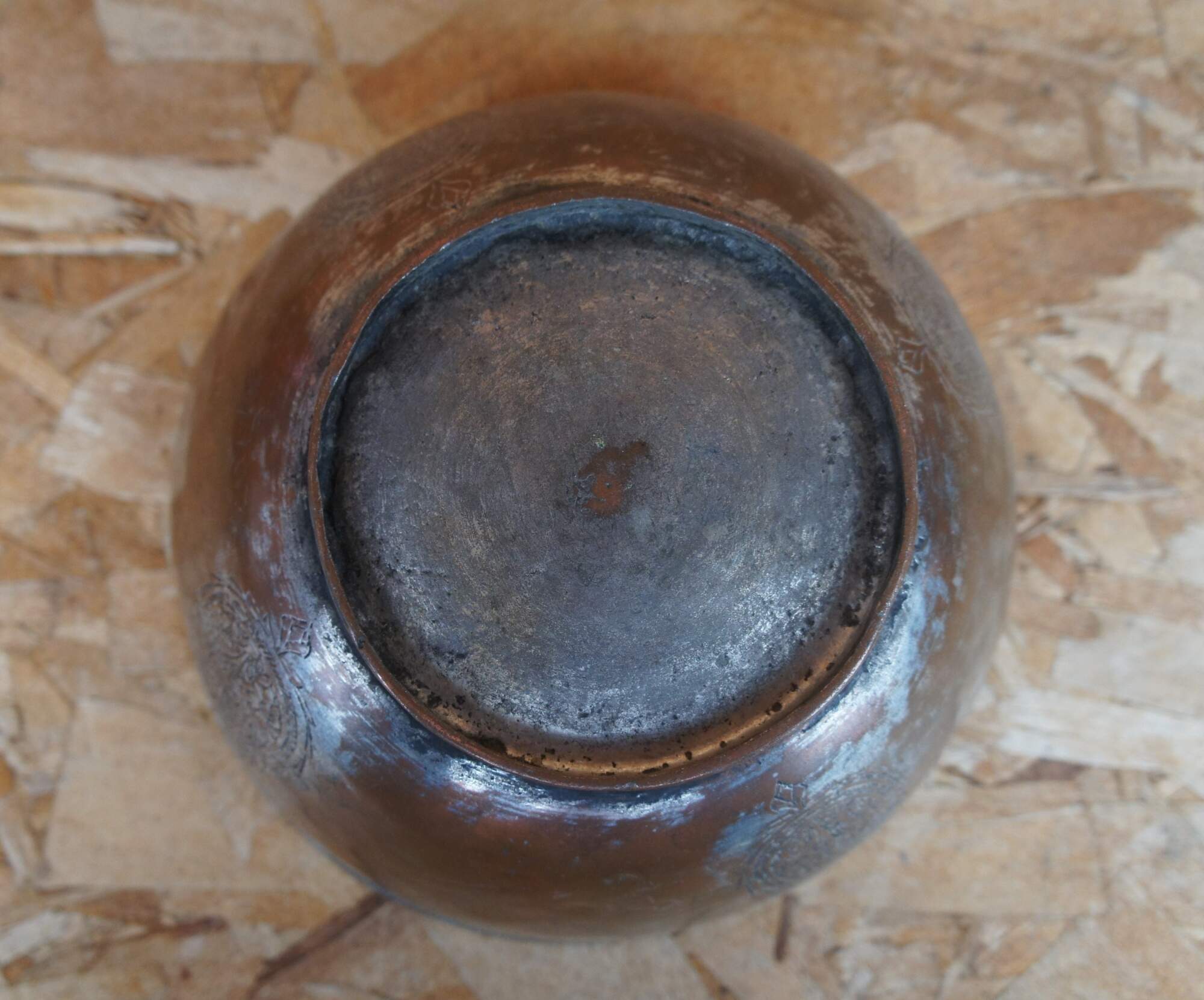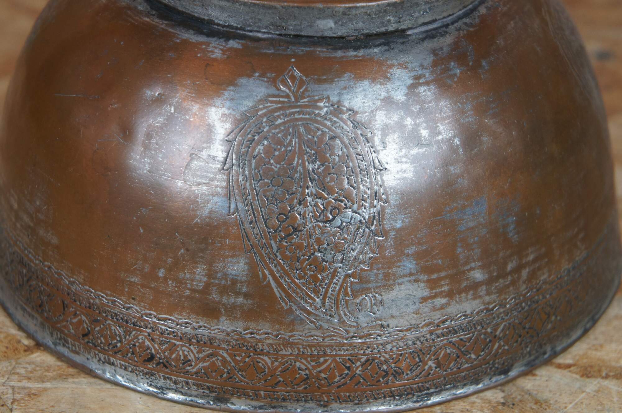 Vintage Egyptian copper bowl or dish with embossed paisley and banded design.