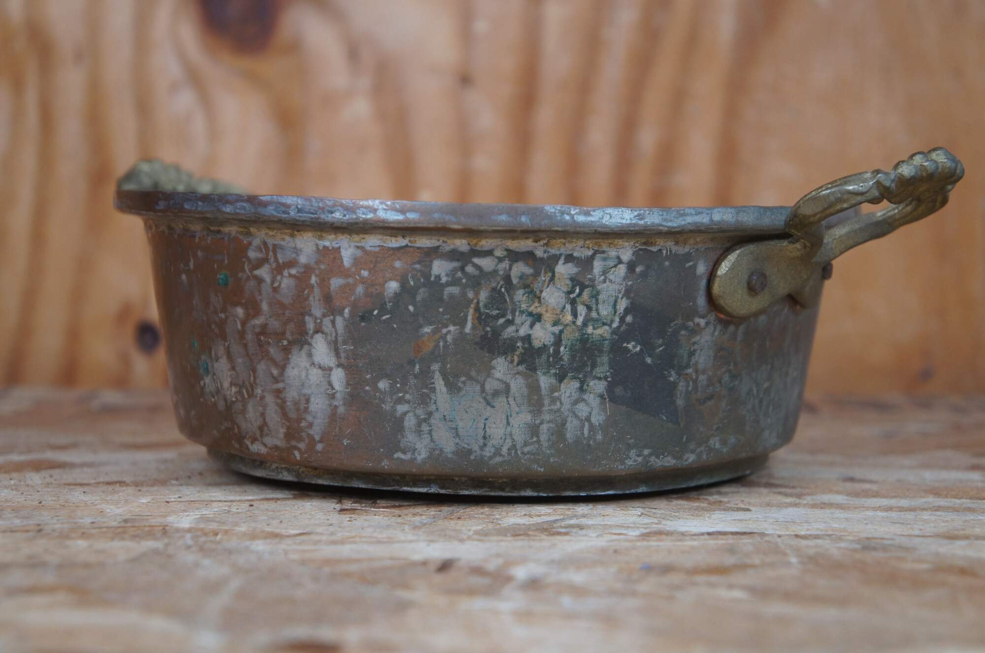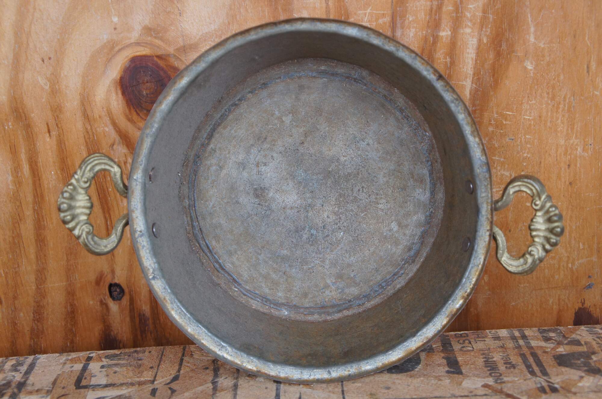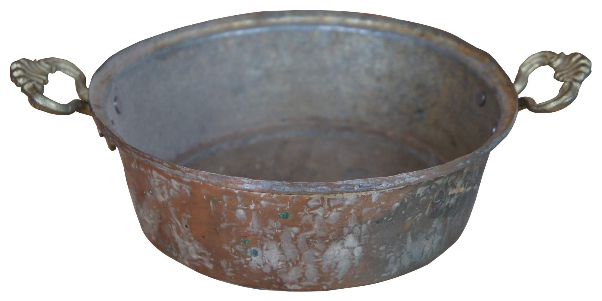 Antique French hammered copper cook pot or sauce pan / bowl featuring ornate brass handles.