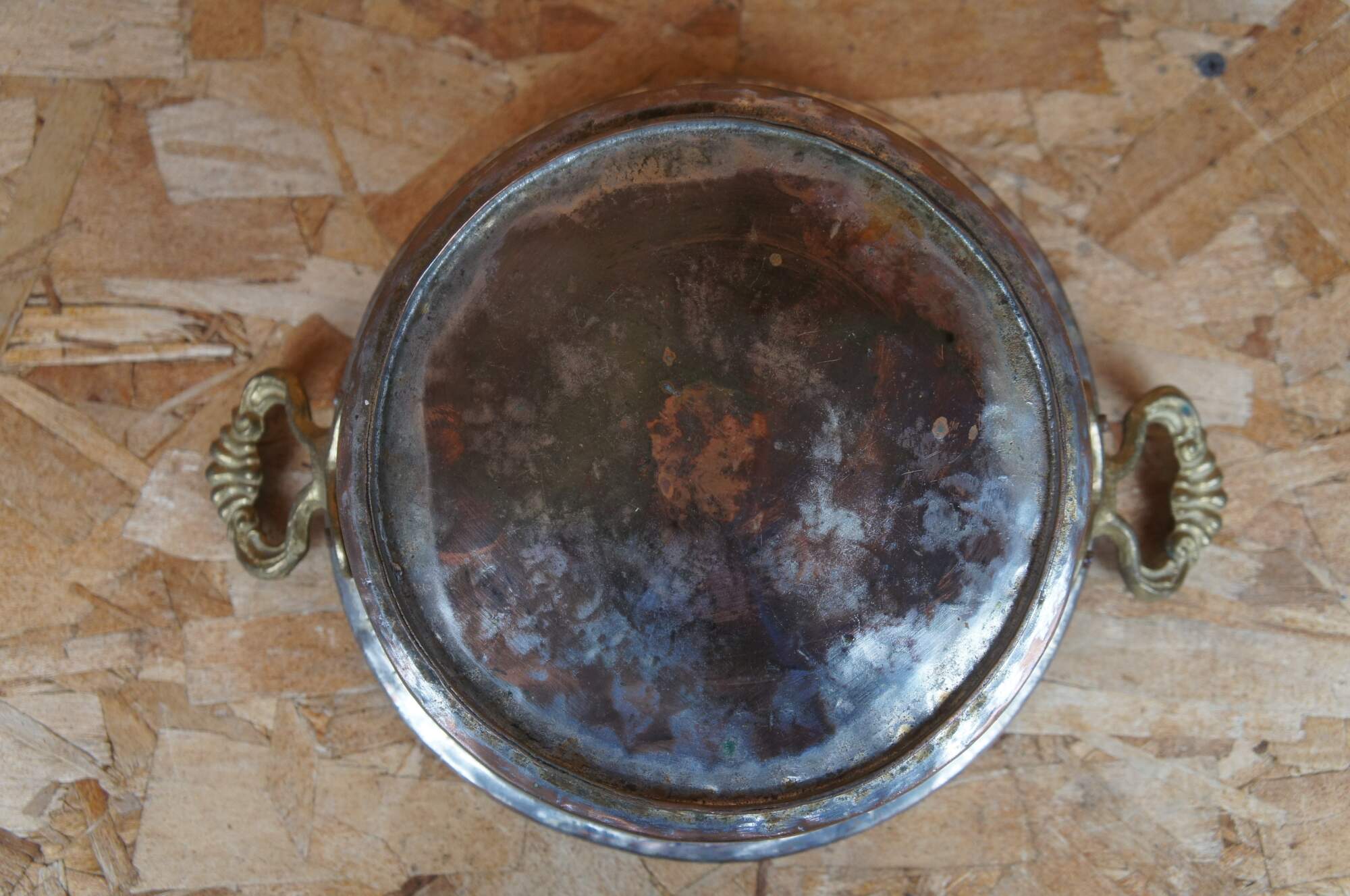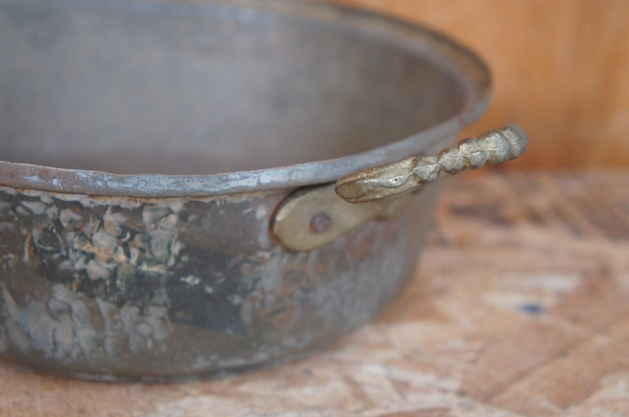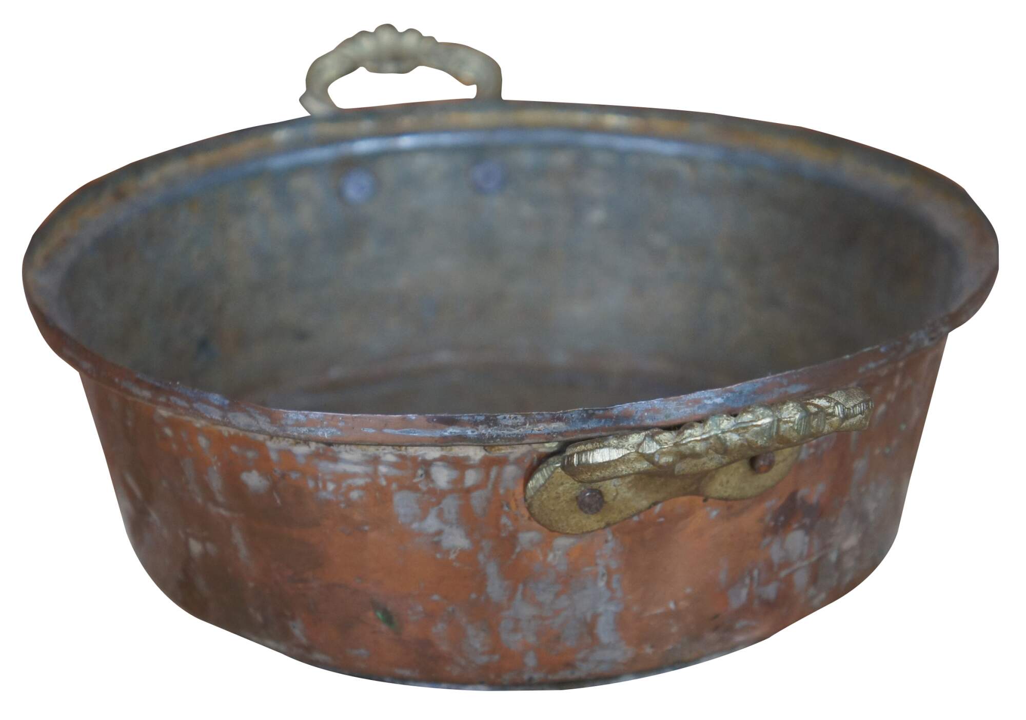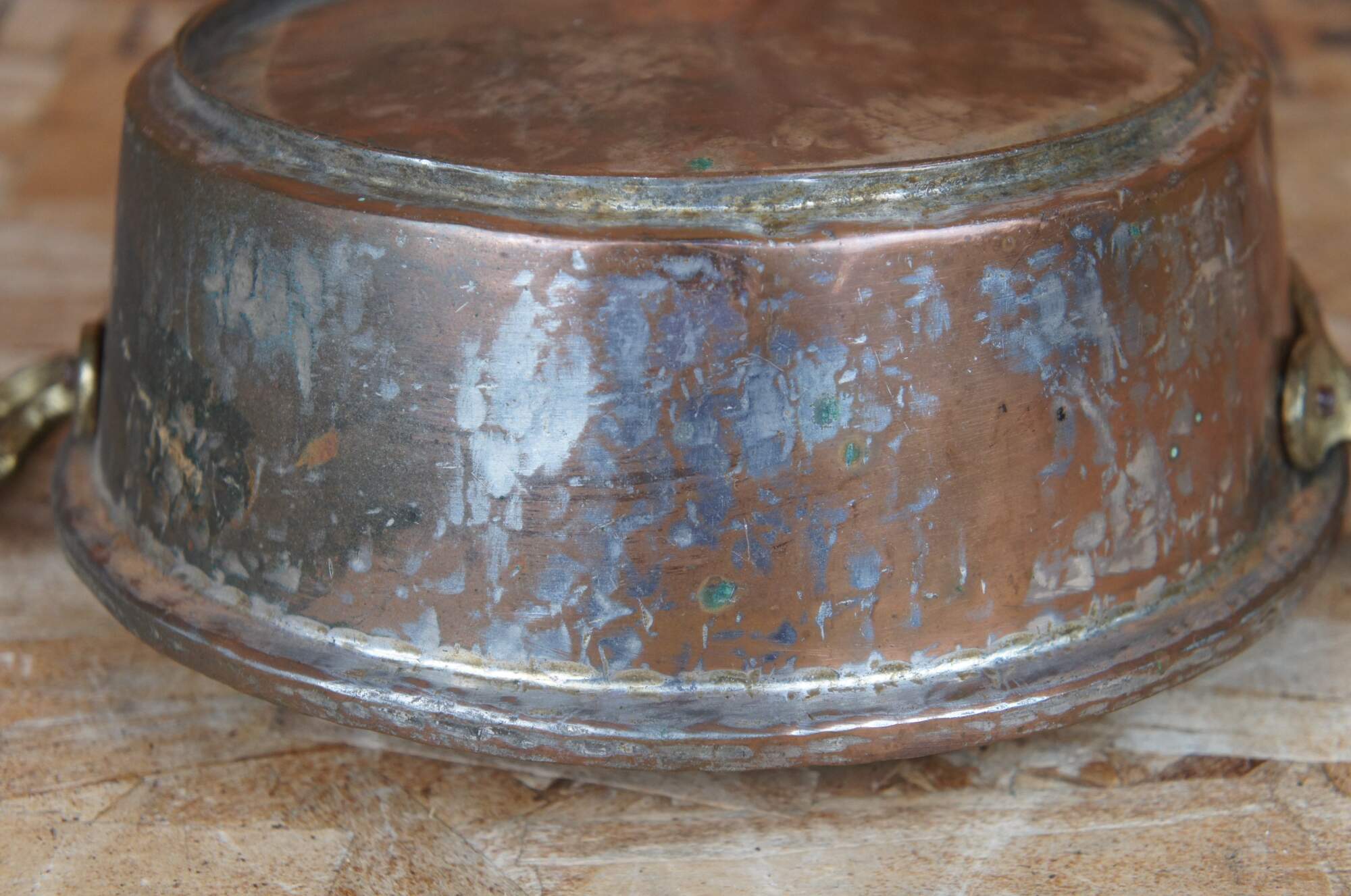 Antique French hammered copper cook pot or sauce pan / bowl featuring ornate brass handles.