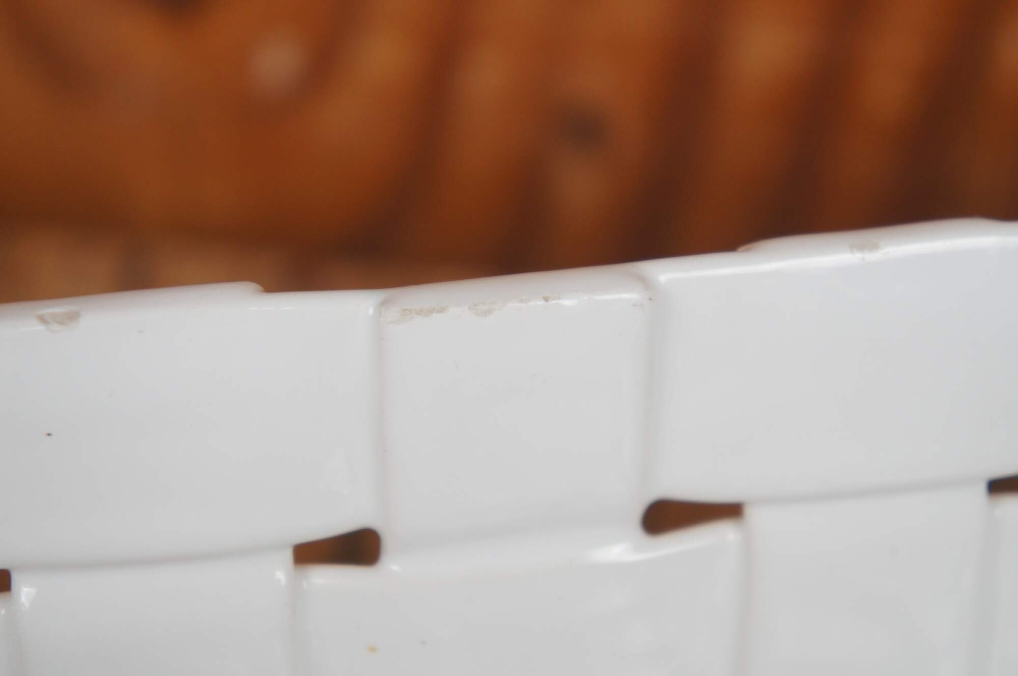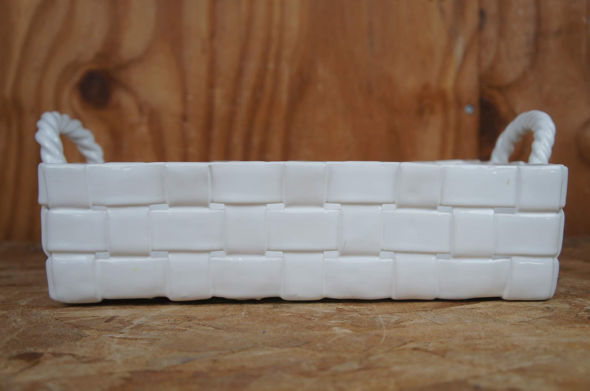Vintage large woven ceramic / porcelain centerpiece serving basket / tray or dish featuring a basket weave pattern with handles. Attributed to Unica, Made in Italy, circa 1970s.