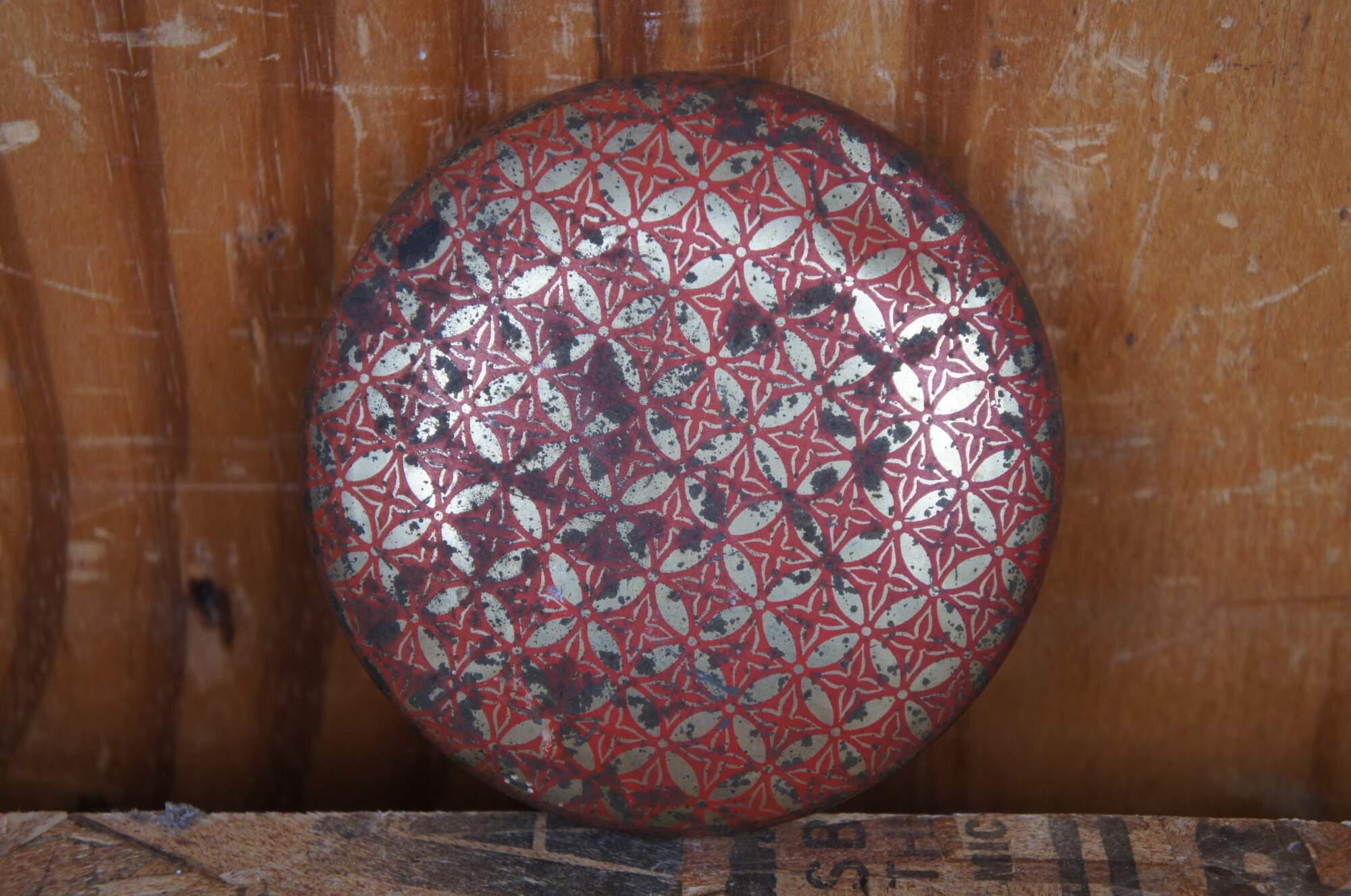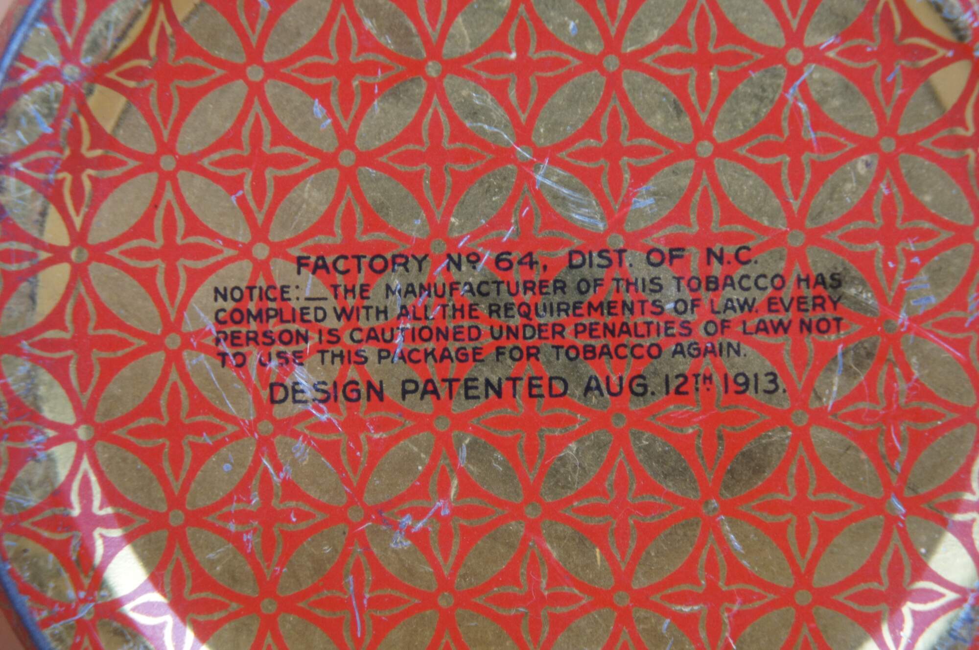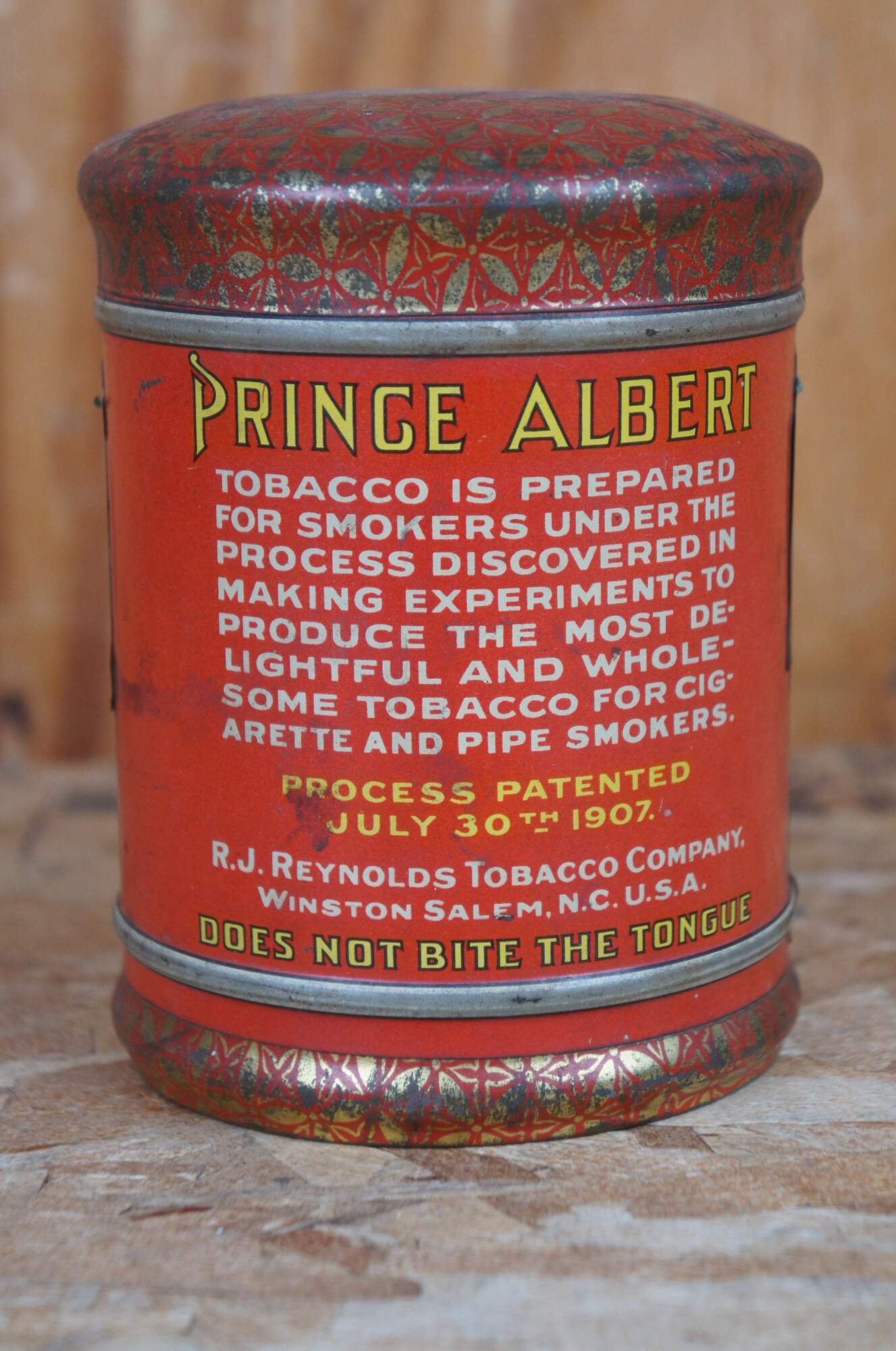 Antique Prince Albert ad can, made of tin, featuring a domed top with the slogan Crimp Cut Long Burning Pipe and Cigarette Tobacco.