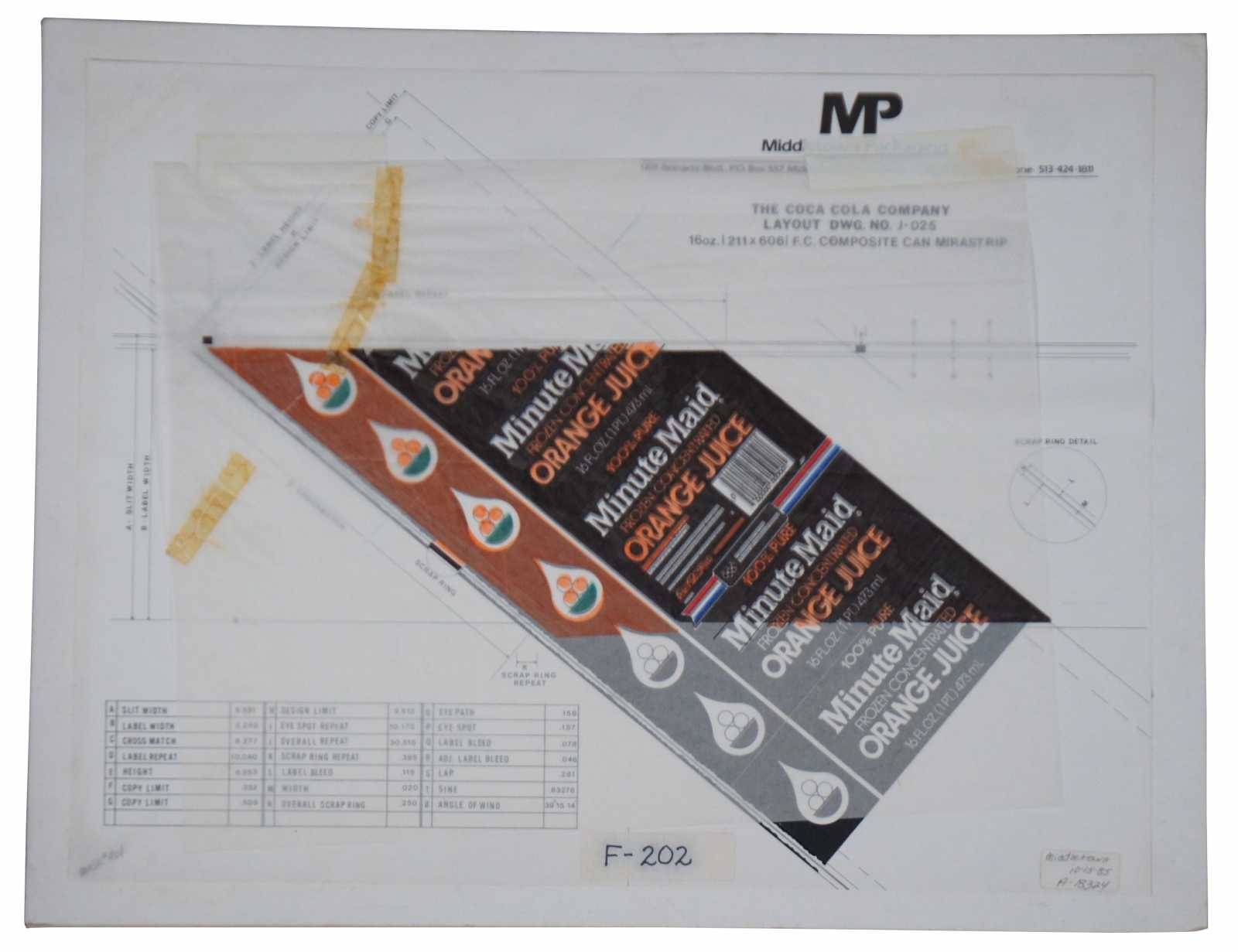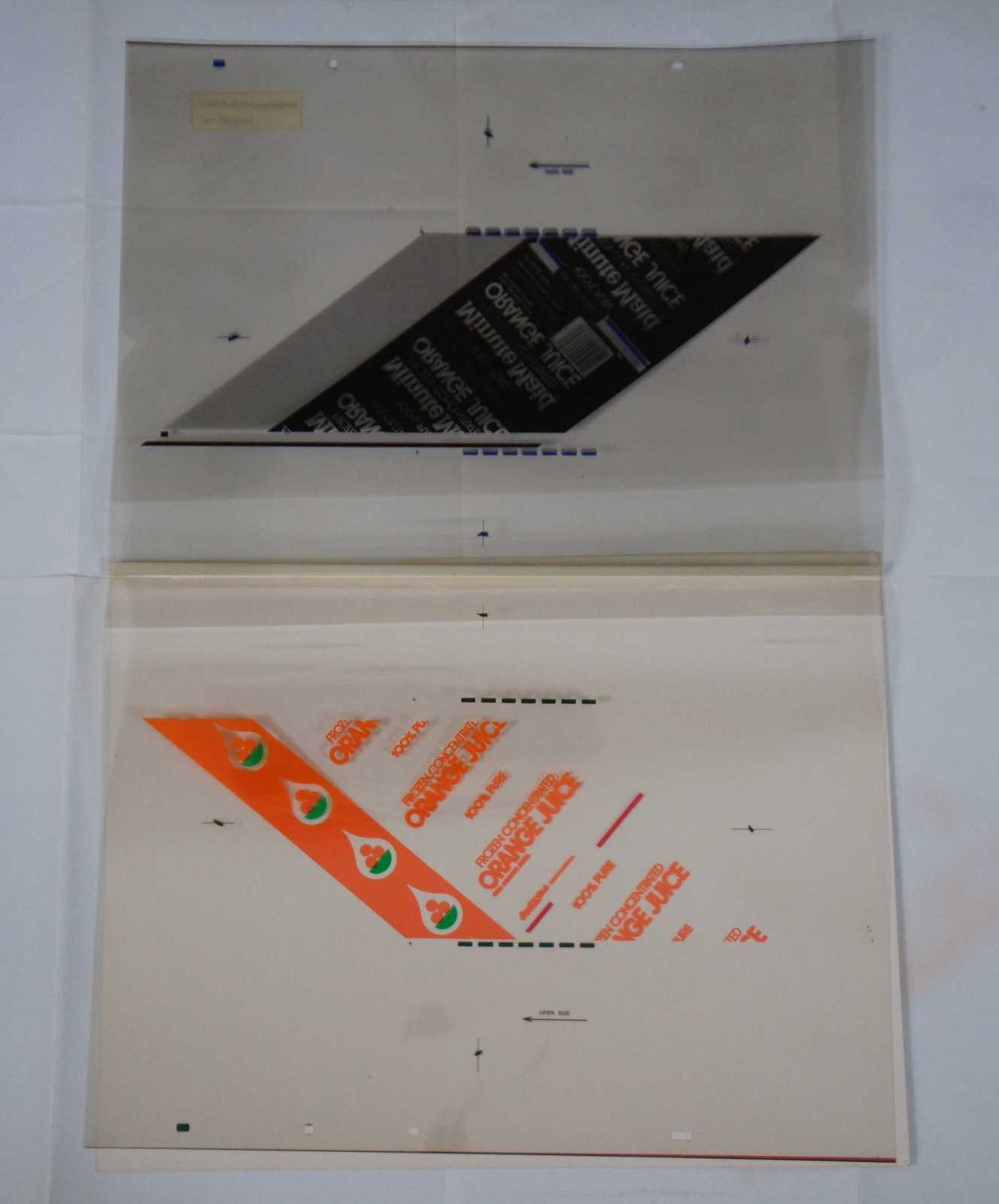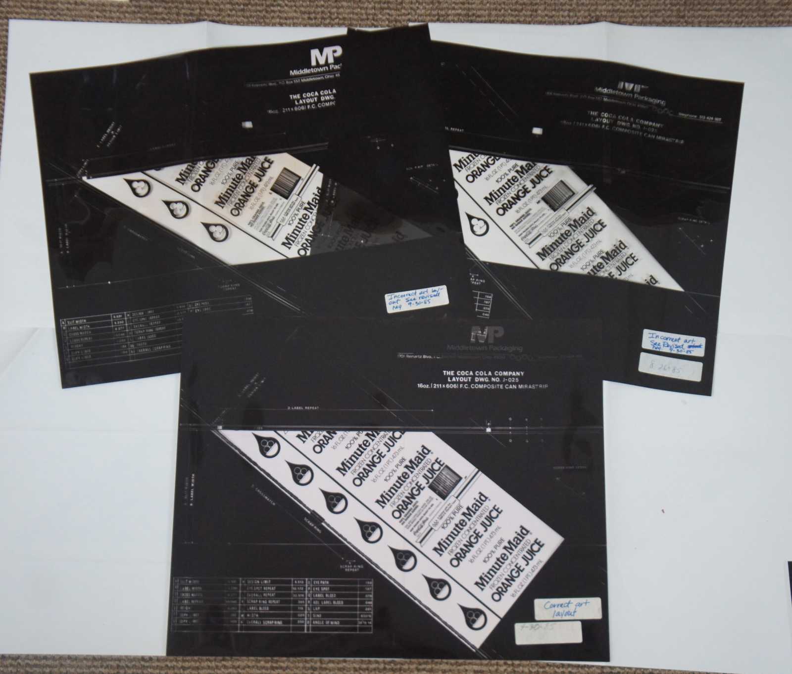 Rare vintage mid-1980s label ad mock up / multi layer layout transparency sheets for Welch’s Cranberry Raspberry Juice Cocktail (Sonoco Products Company) and Minute Maid Frozen Concentrated Orange Juice (The Coca Cola Company), designed at Middletown Packaging. A fascinating peek into the product label design process and how colors get layered in printing to produce the final design.