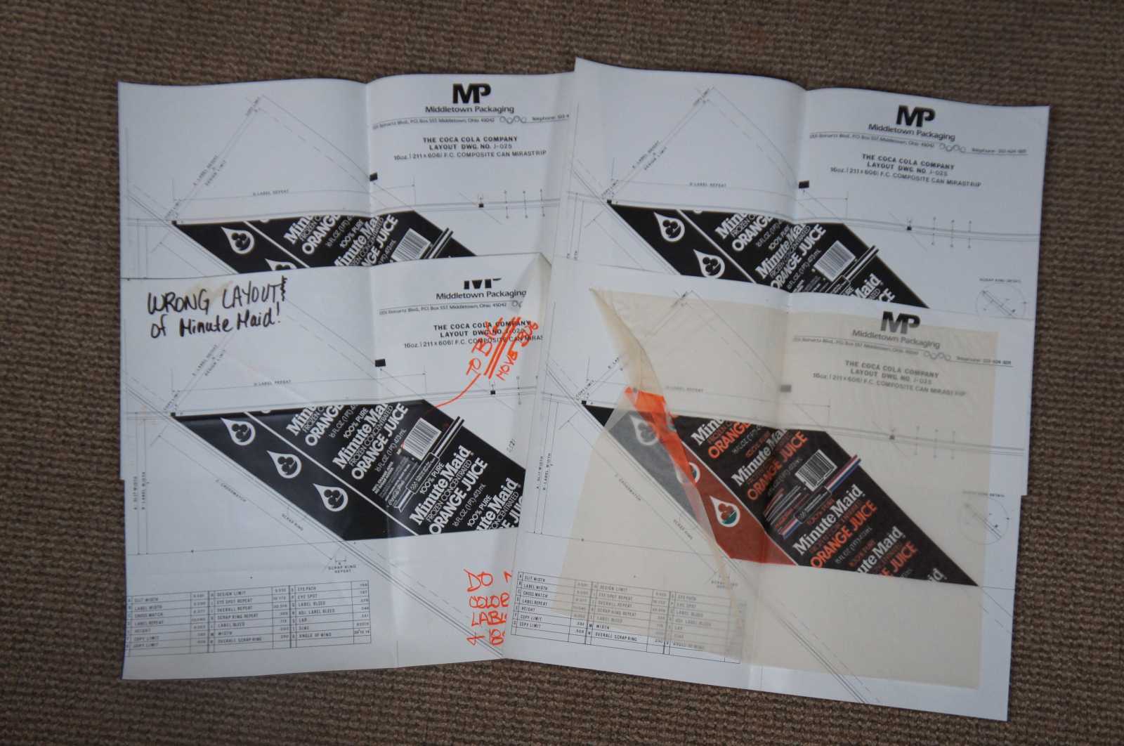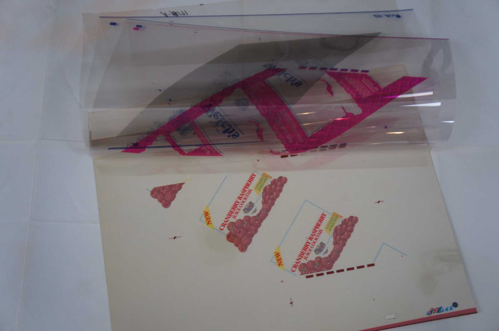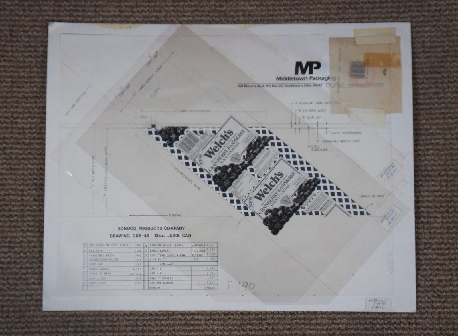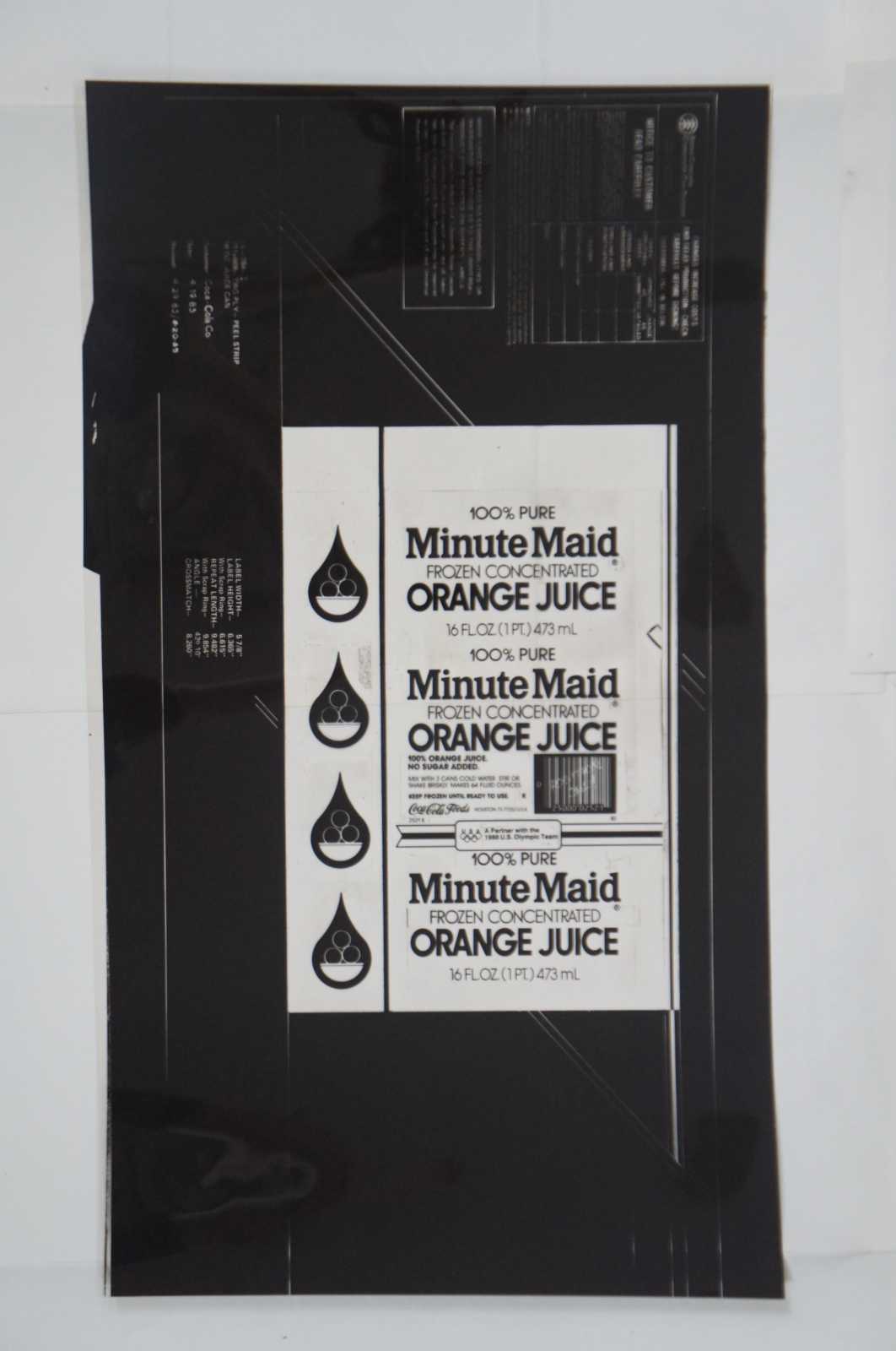 Rare vintage mid-1980s label ad mock up / multi layer layout transparency sheets for Welch’s Cranberry Raspberry Juice Cocktail (Sonoco Products Company) and Minute Maid Frozen Concentrated Orange Juice (The Coca Cola Company), designed at Middletown Packaging. A fascinating peek into the product label design process and how colors get layered in printing to produce the final design.