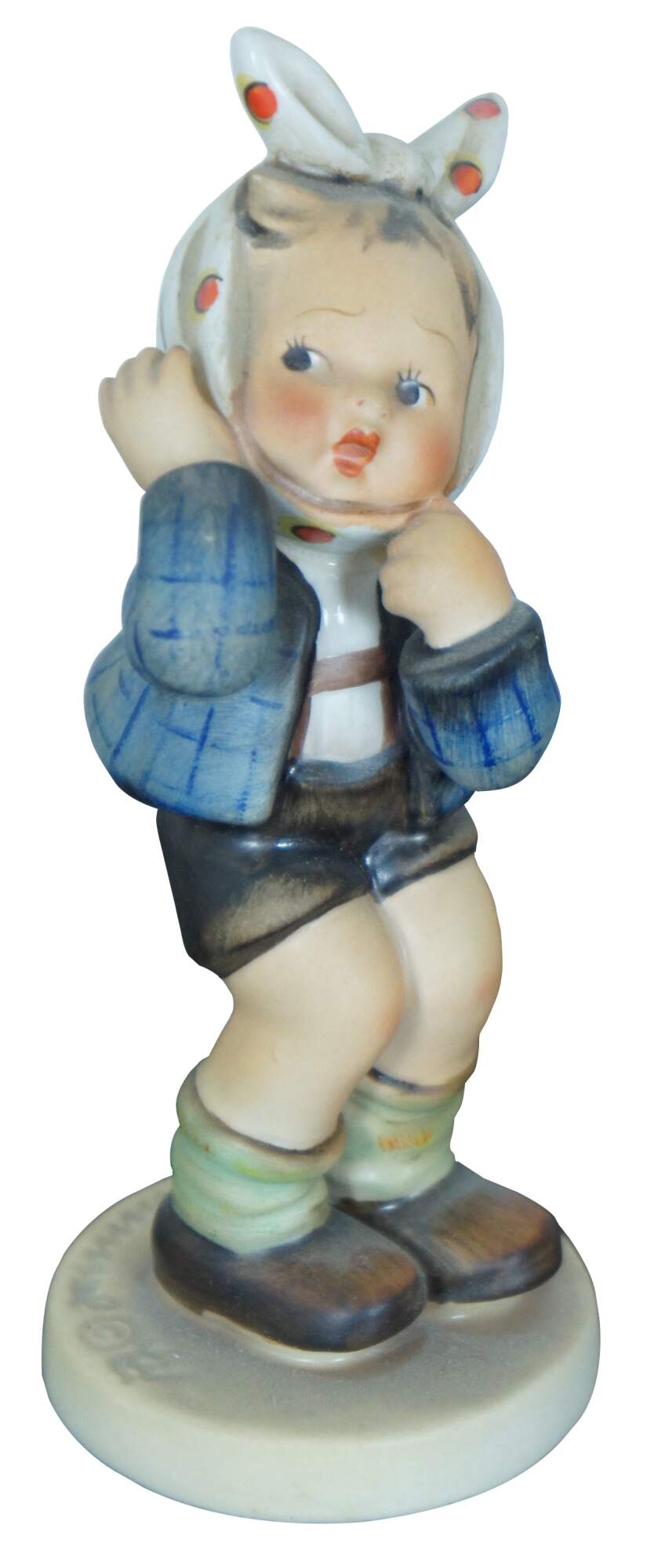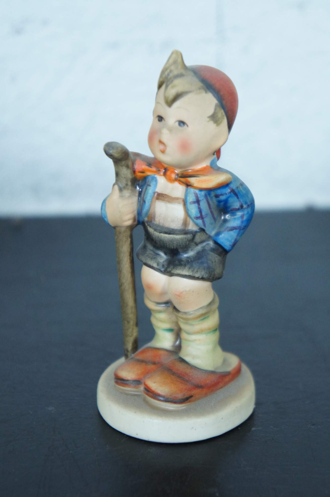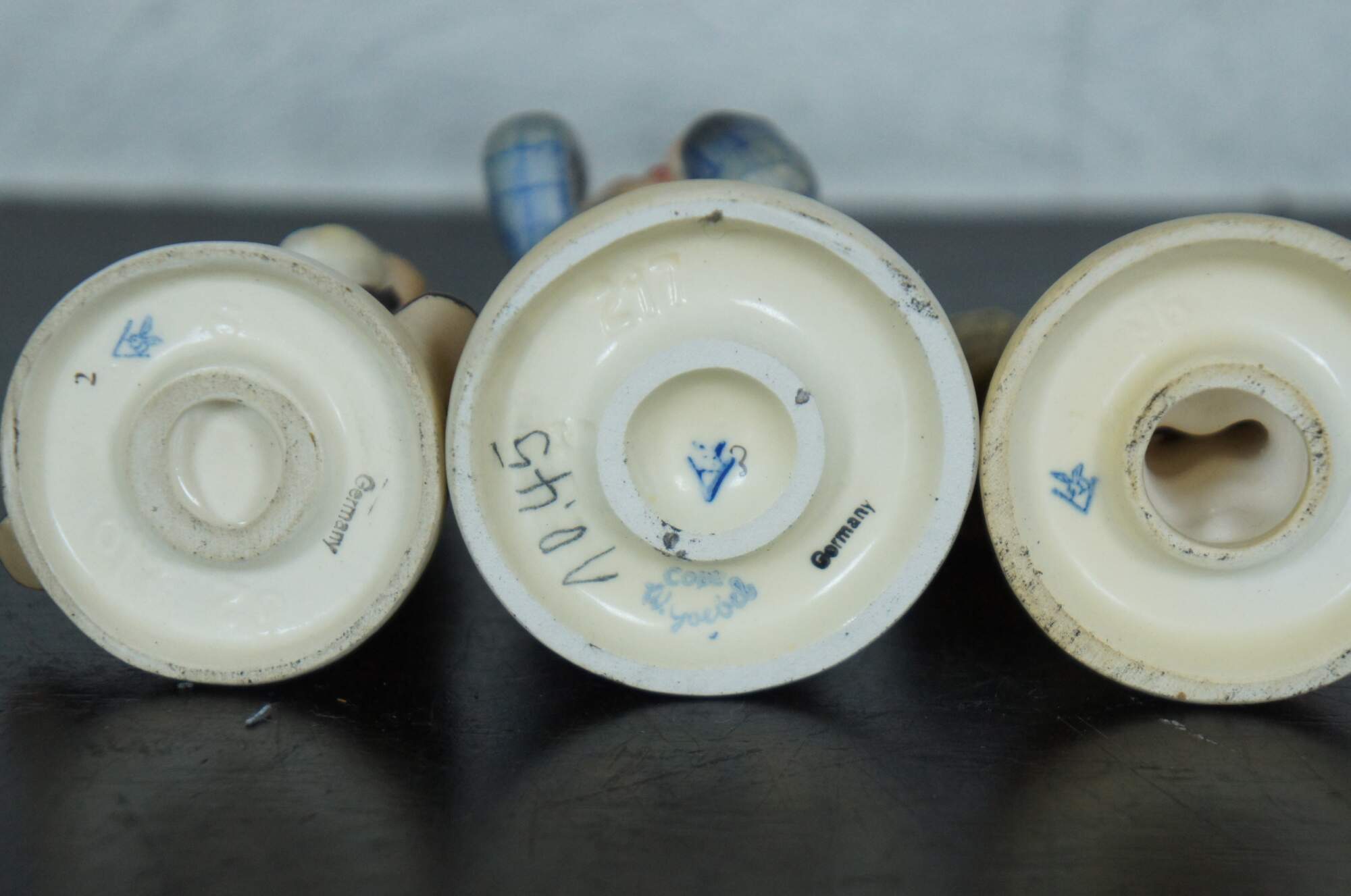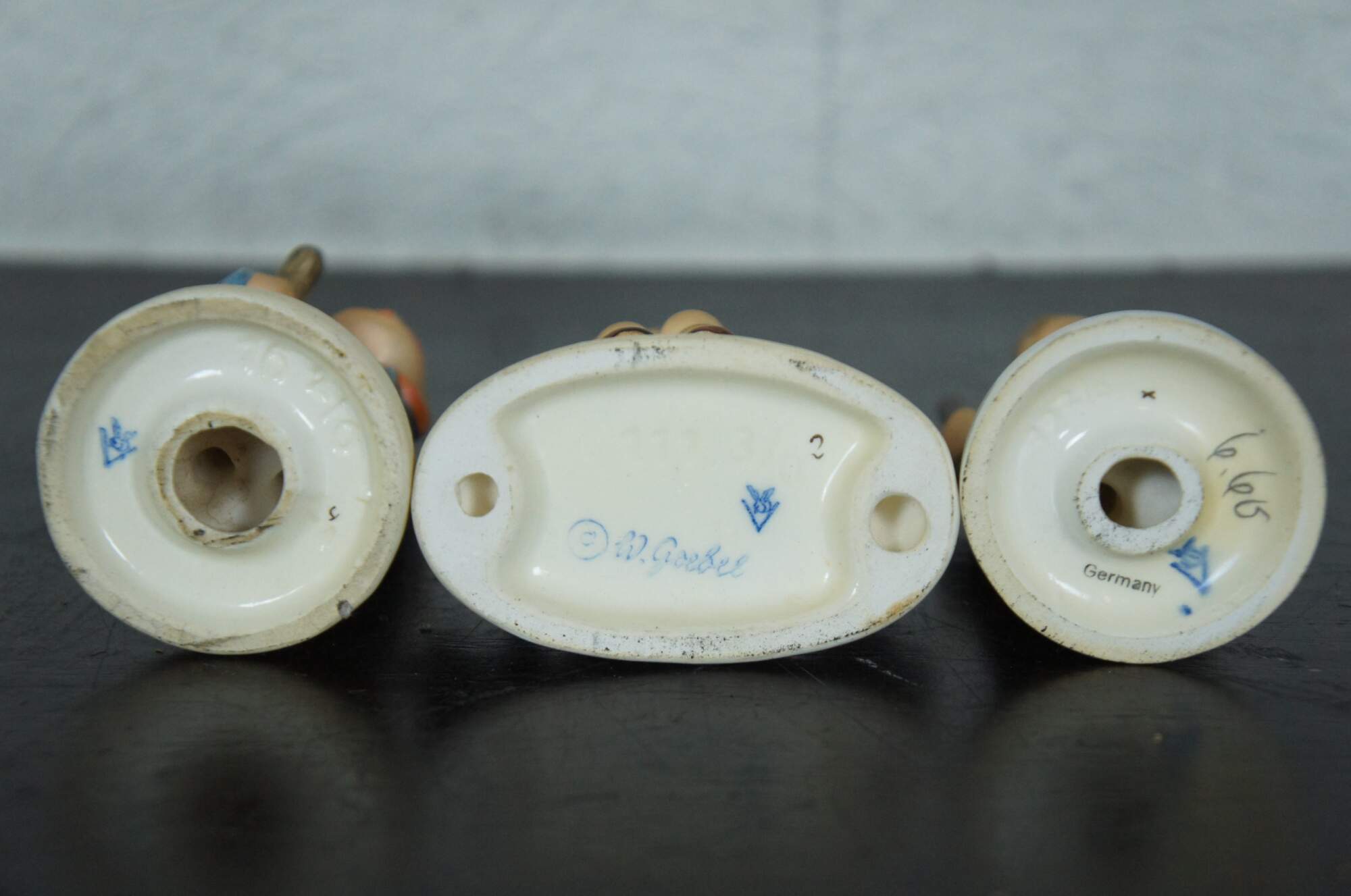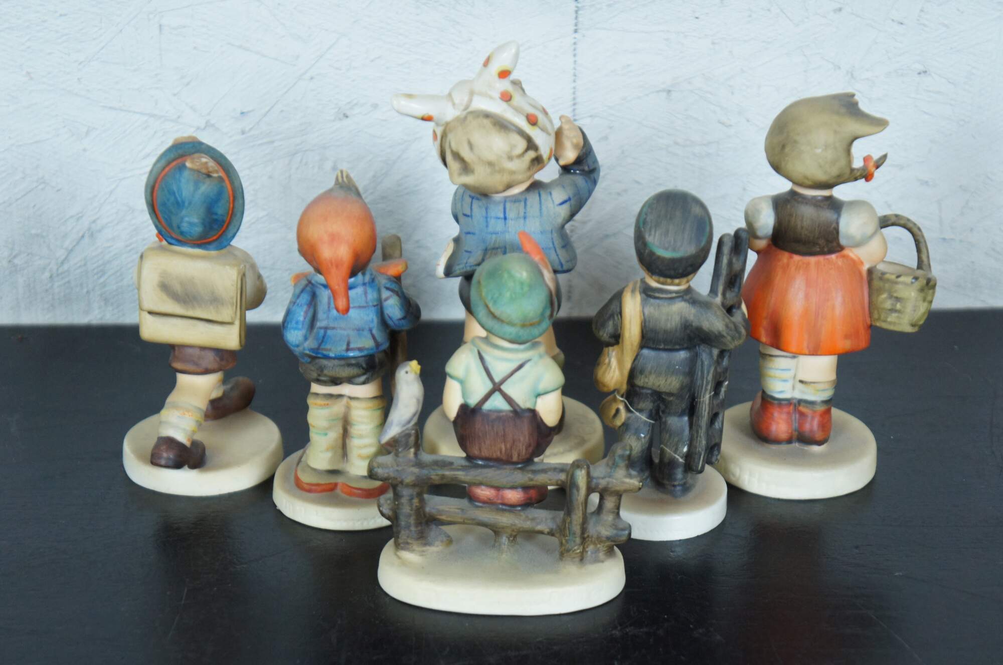Set of six vintage Goebel M.I. Hummel figurines, all featuring the TMK-2 Full Bee mark circa 1950-1955. Set includes #217 Boy with Toothache, #111 Wayside Harmony, #82 School Boy, #96 Little Shopper, #16 Little Hiker, and #12 Chimney Sweep.