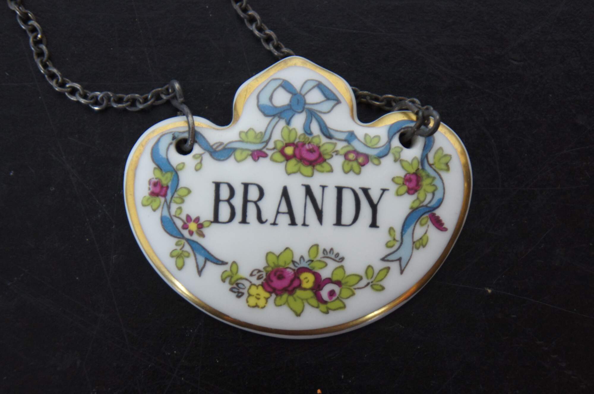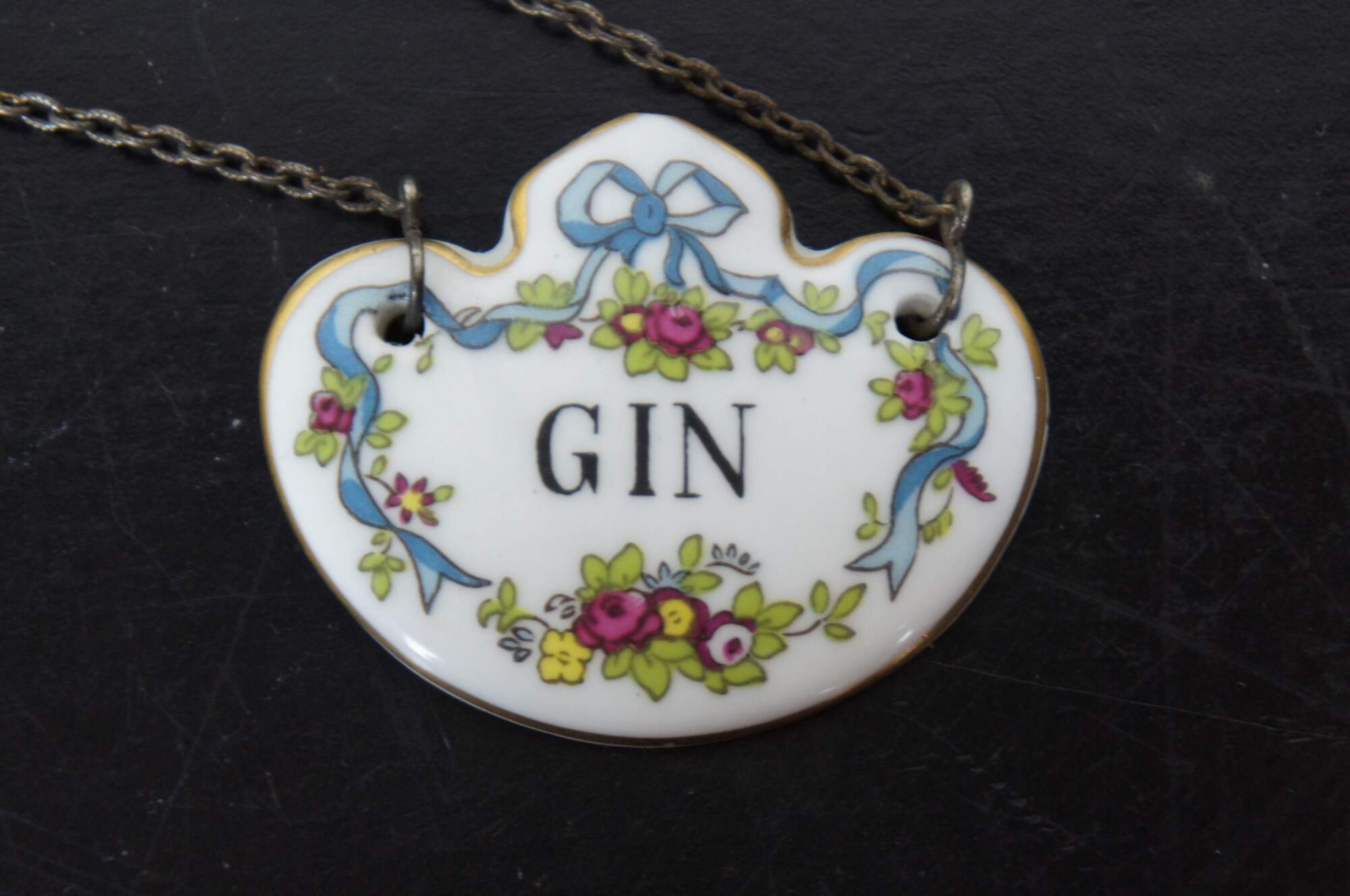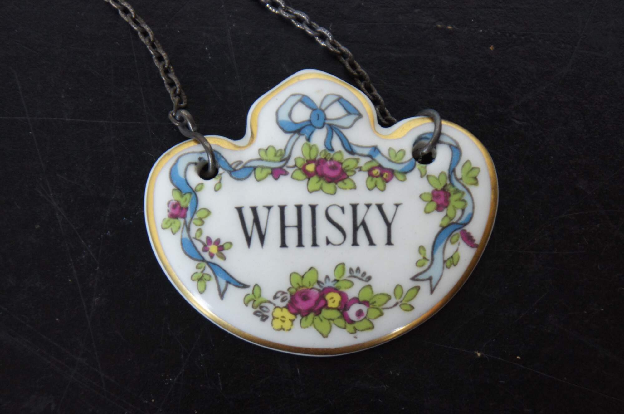 Set of six vintage Crown Staffordshire, fine bone china liquor bottle labels, including Whiskey, Brandy, Scotch, Vodka, Rum and Gin.