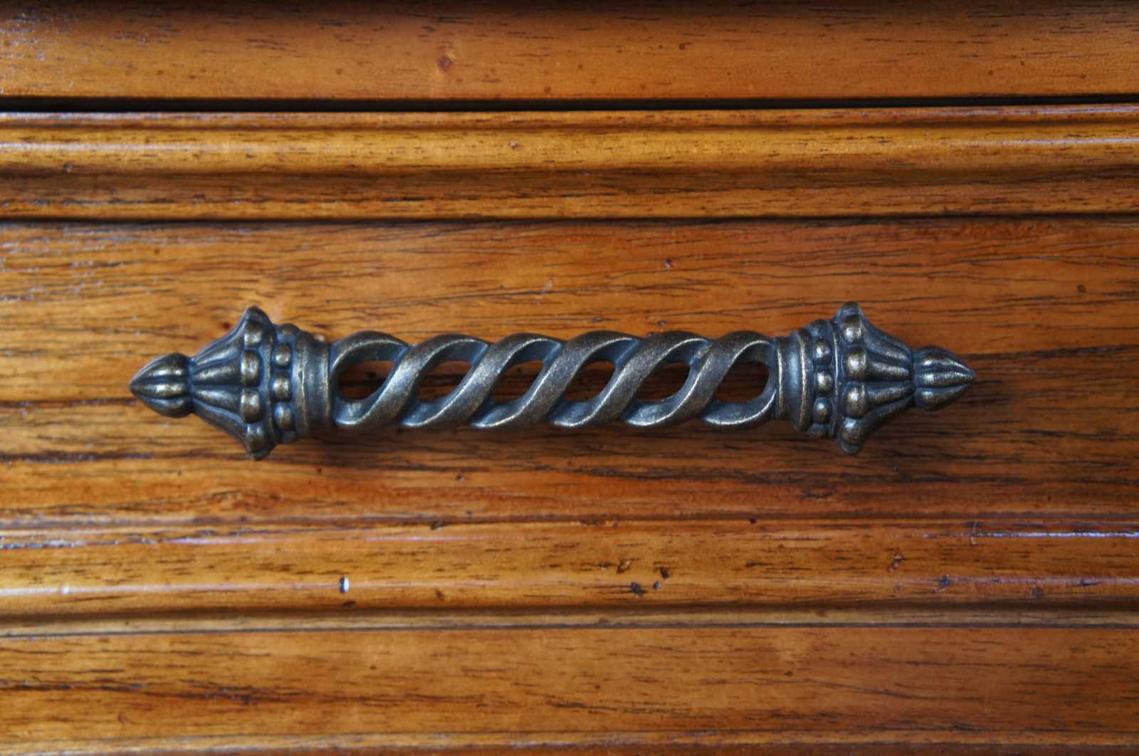 Hekman oak executive office desk. Features a brown and gold tooled leather top 5 drawers and barley twisted hardware. Includes large deepwell drawers with file storage below and a central lockable keyboard drawer.