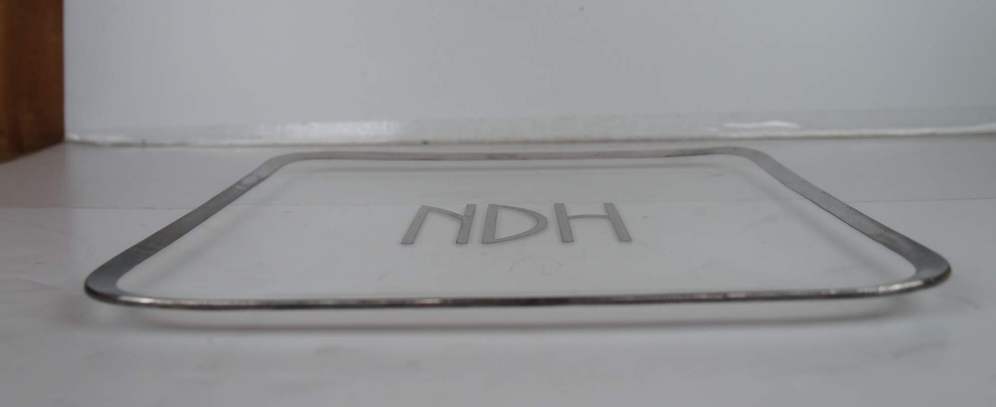 Vintage rectangular barware or serving tray with silver overlay rim and the initials "NDH" along the center.