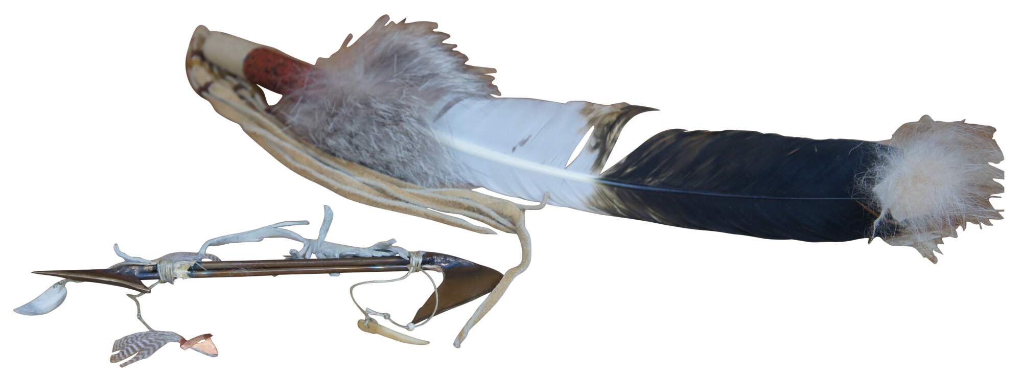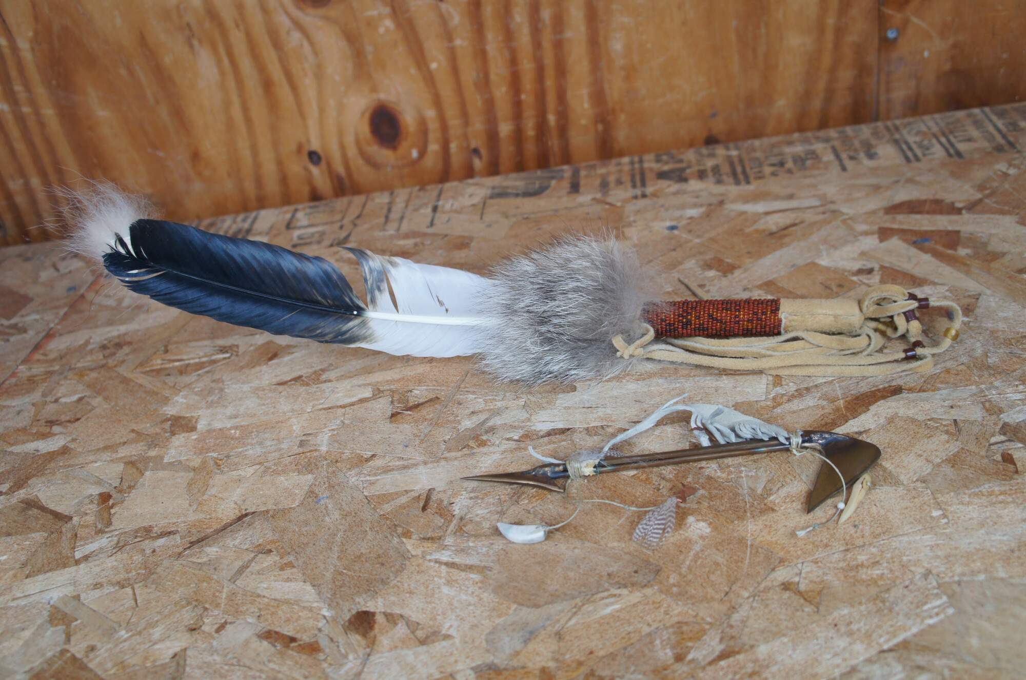 Naitive american amudging feather with beaded handle and fur paired with a copper spear barb.