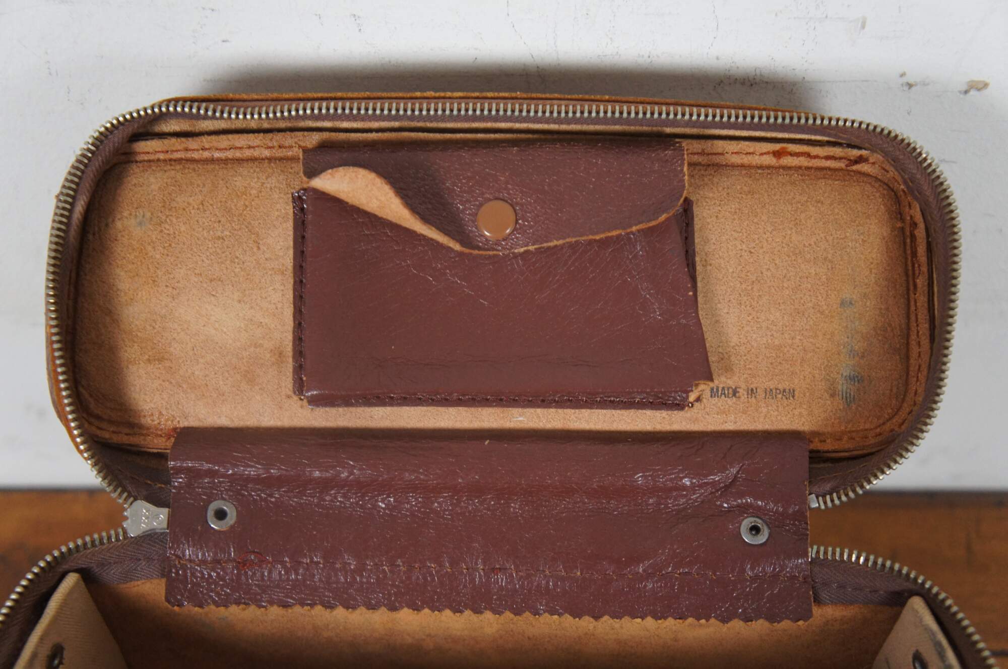 Mid century brown leather camera / accessory bag, made in Japan, with one small interior zip pocket, zippered and slide latch top, a slide latch front pocket, and two buckled straps near the base for tripod or other long accessory.