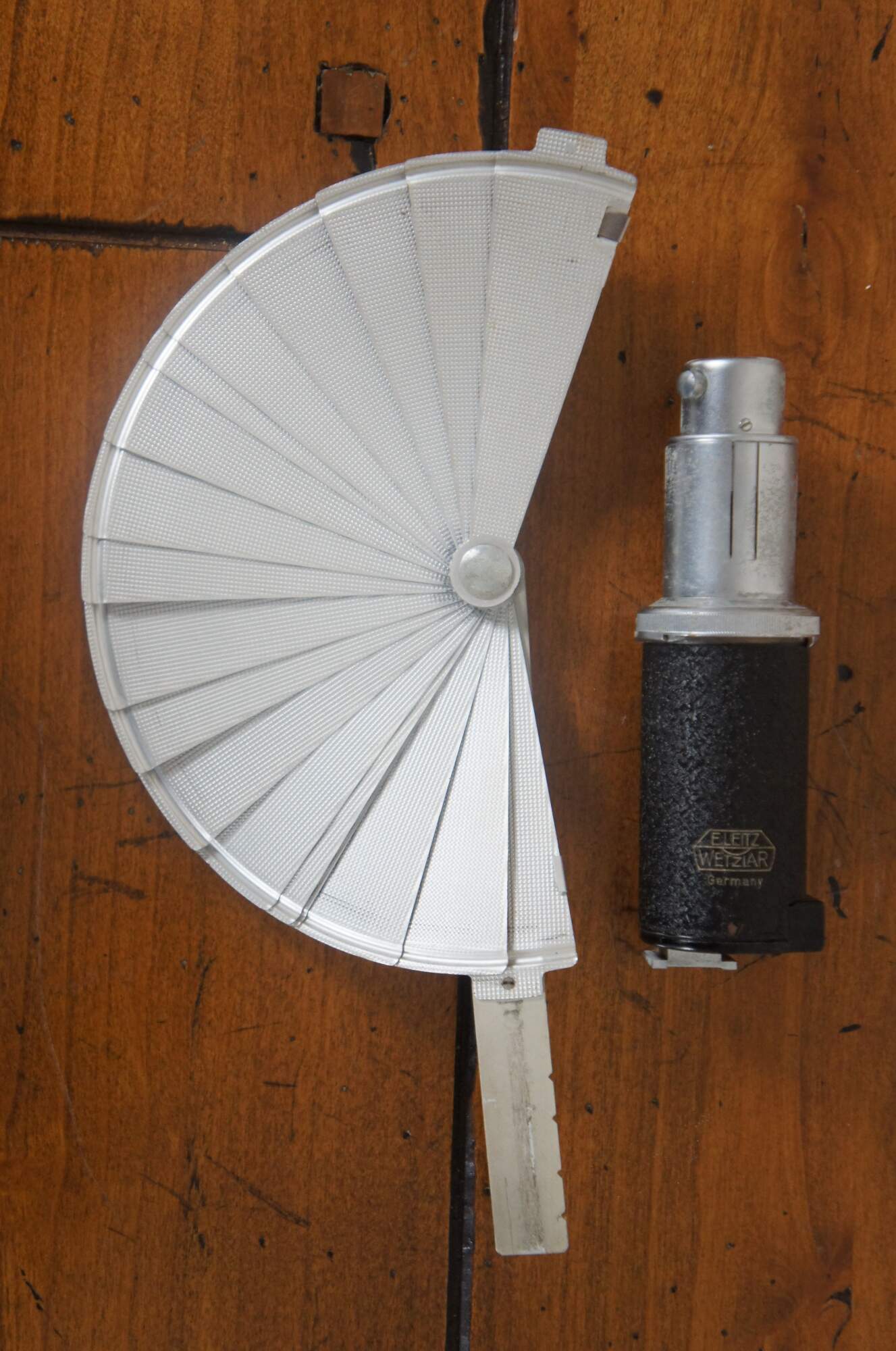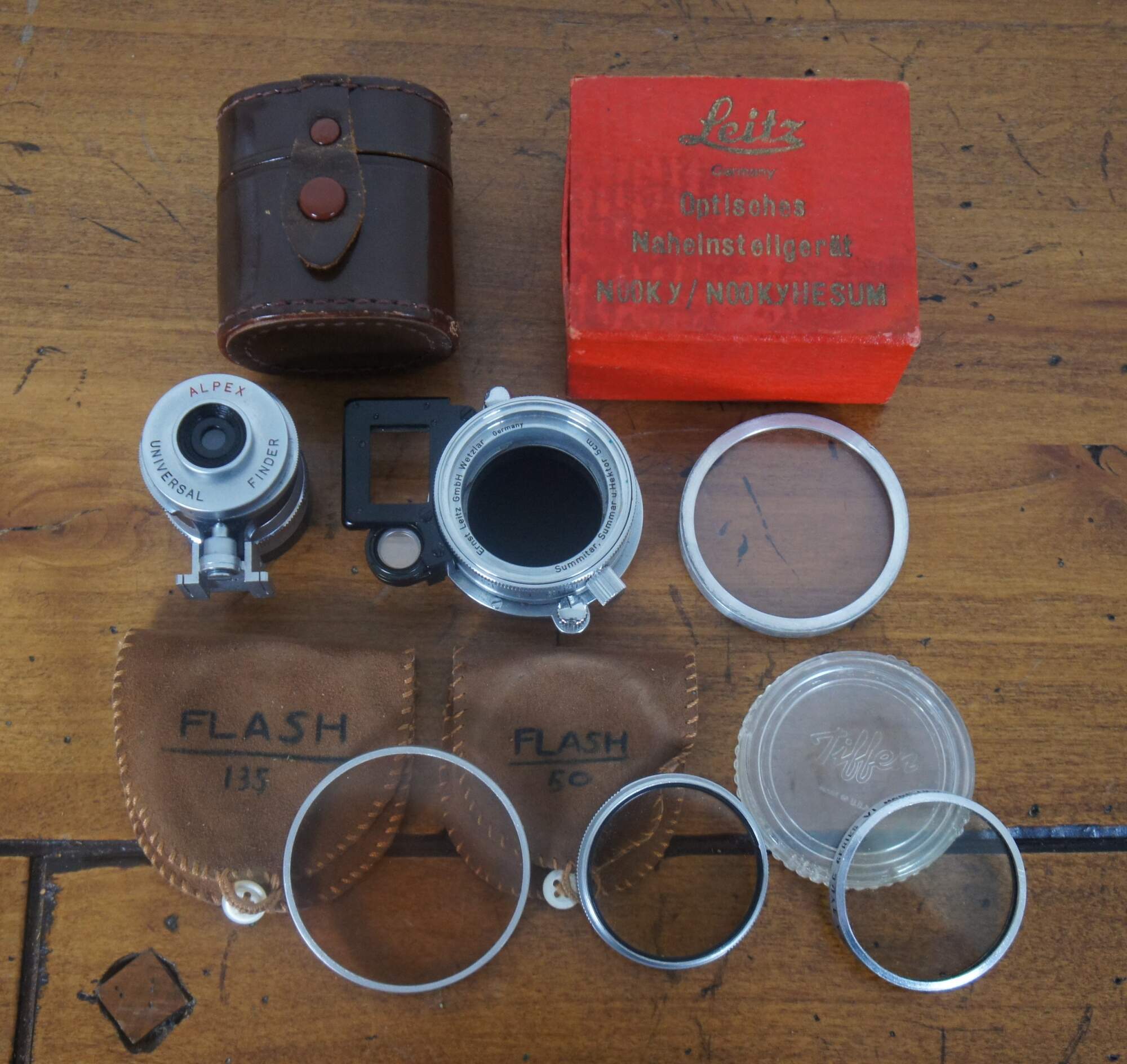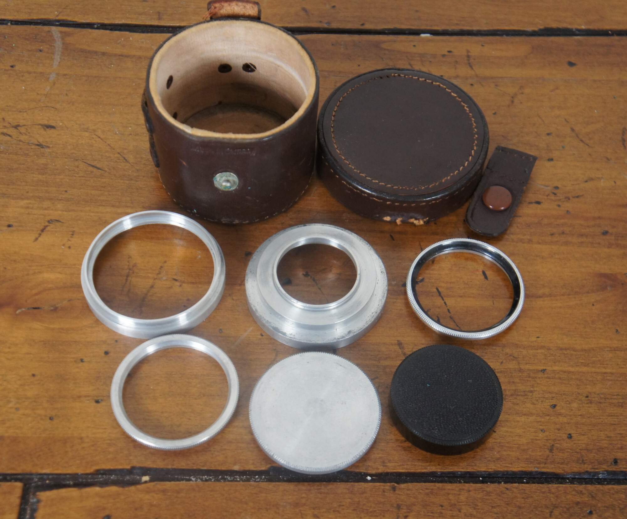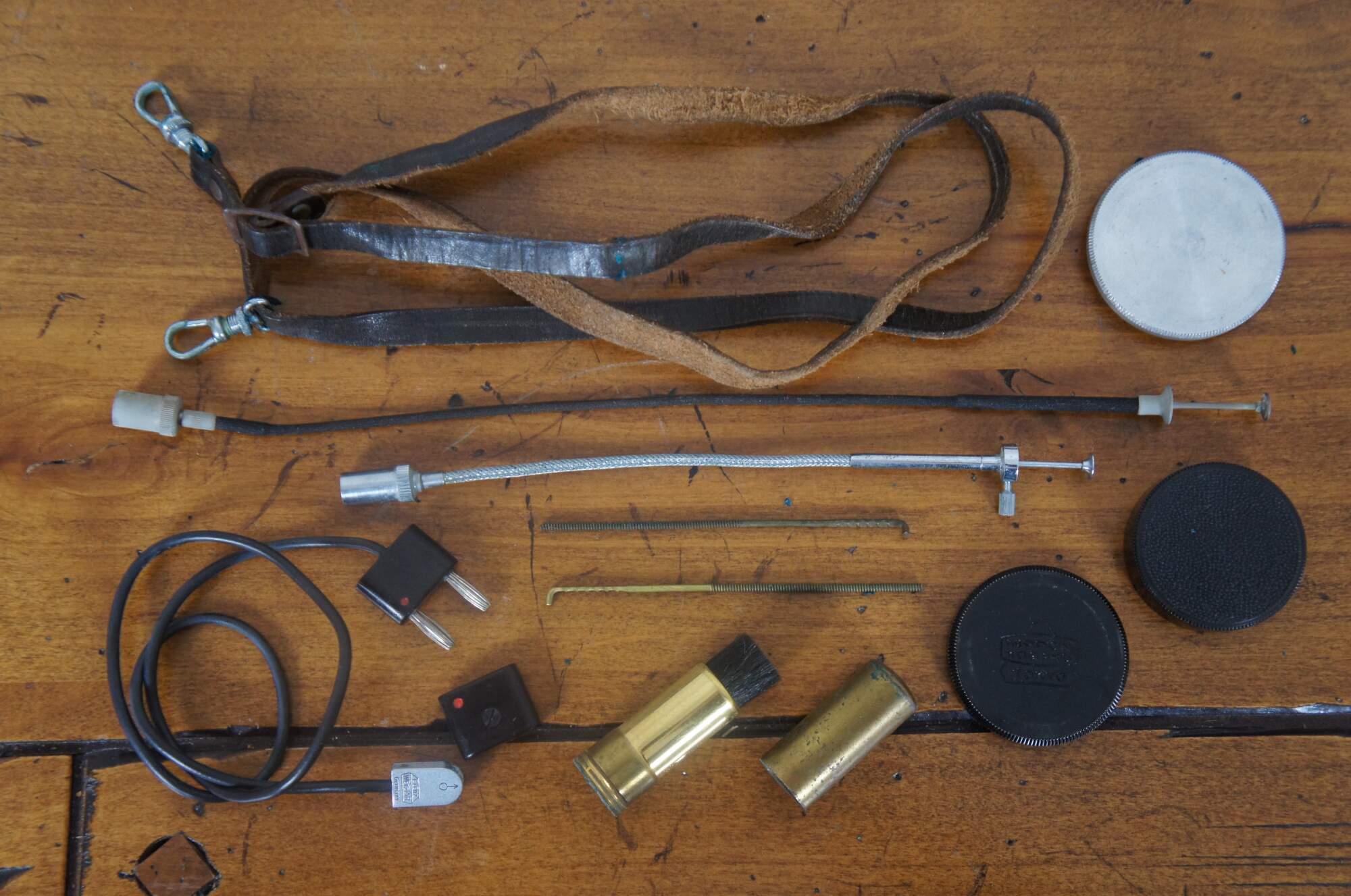 Lot of 38 assorted vintage camera accessories. Lot includes: Perrin No 211 Stereo Realist brown leather camera bag/accessory case; Bilora Biloret model 2037 telescoping tripod; Ernst Leitz Synchonblitzer flash tube and folding reflector; un-marked leather lens case; Enteco Retaining Ring Series VII, Step-Up Ring Series 6-7, and Adapter Ring Series VI No. 615; 2 additional lens adapter rings; 2 loose lens caps; General Electric Exposure Meter Type PR-3 & case; General Electric Dynacell Light Multiplier with instructions & case; Ernst Leitz GmbH Wetzlar plastic rotating shoe mount for tripod; Alpex Universal Finder & case; Ernst Leitz GmbH Wetzlar Summitar, Summar u.Hektor 5cm Optisches Naheinstellgerat Nooky/Nookyhesum & box; leather camera strap; 2 remote shutter buttons; cleaning brush; Ernst Leitz Wetzlar Synchrokabel; Tiffen 2A Type Series VI lens filter & case; Series VII Wratten Filter No. 81C lens filter & pouch; Ernst Leitz N.Y. CF lens filter & pouch; Enteco Series VII Skylight (1A) lens filter; 2 brass tools.