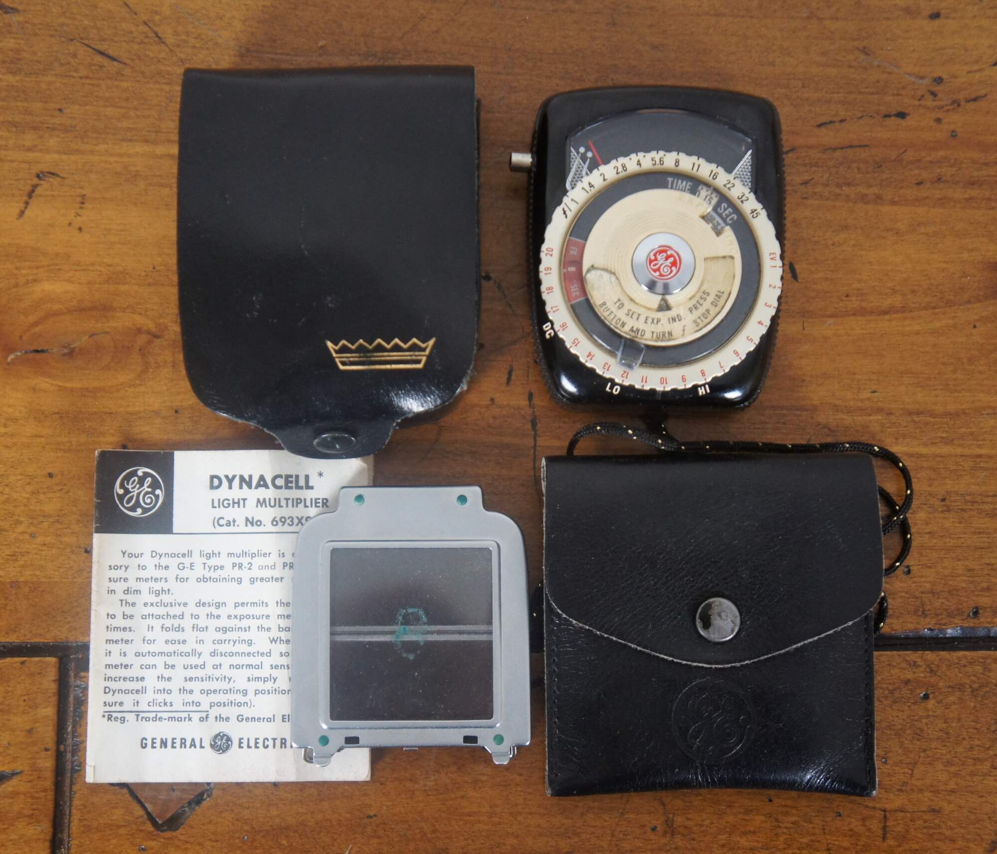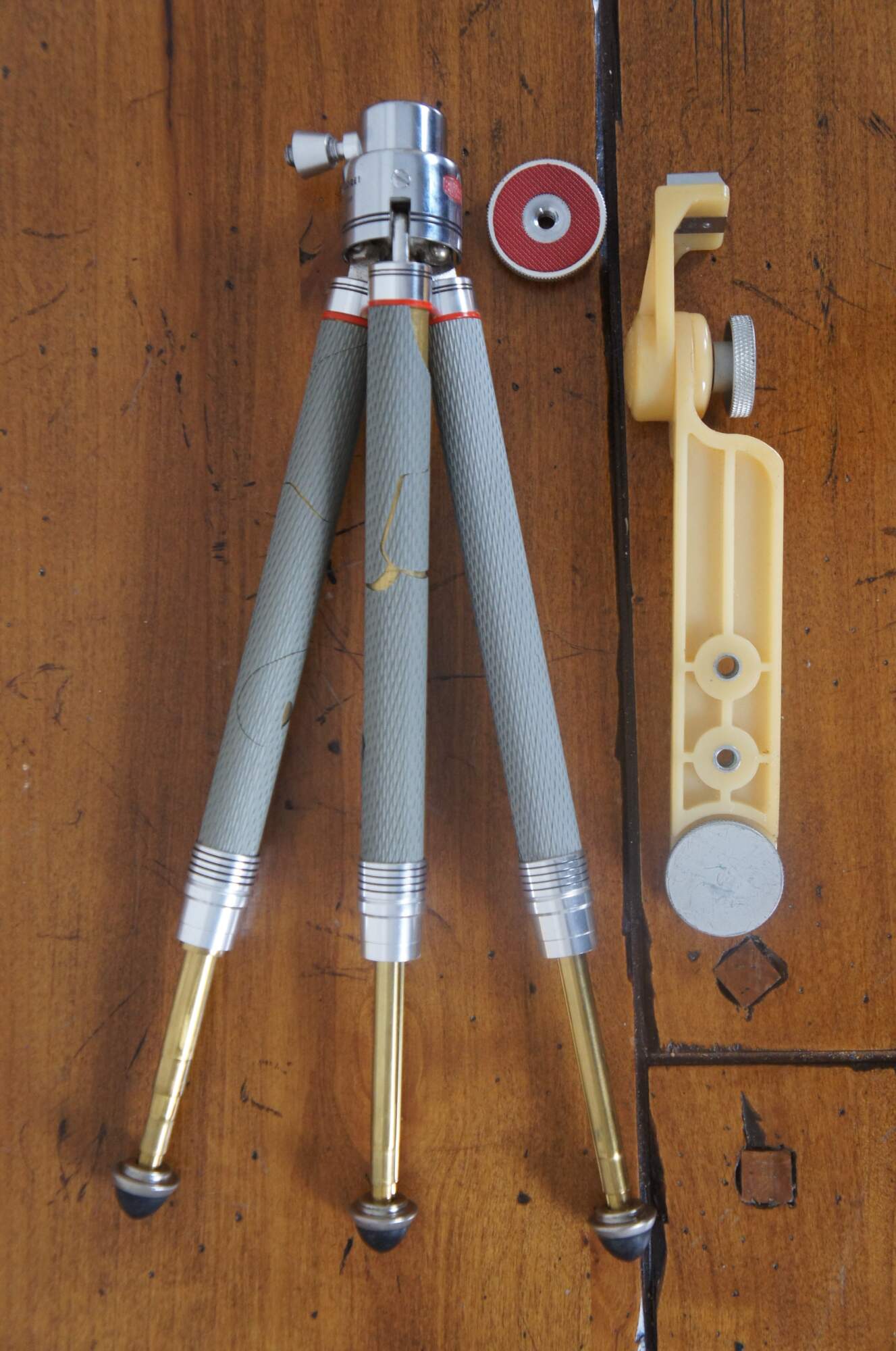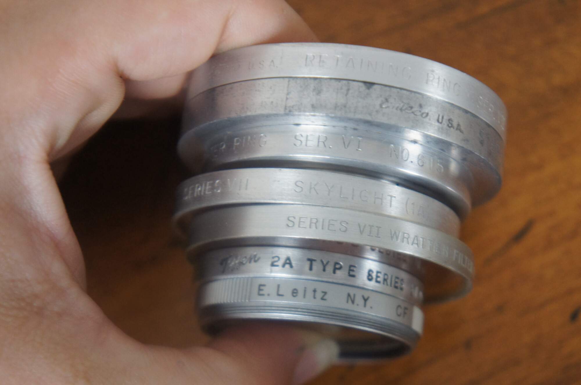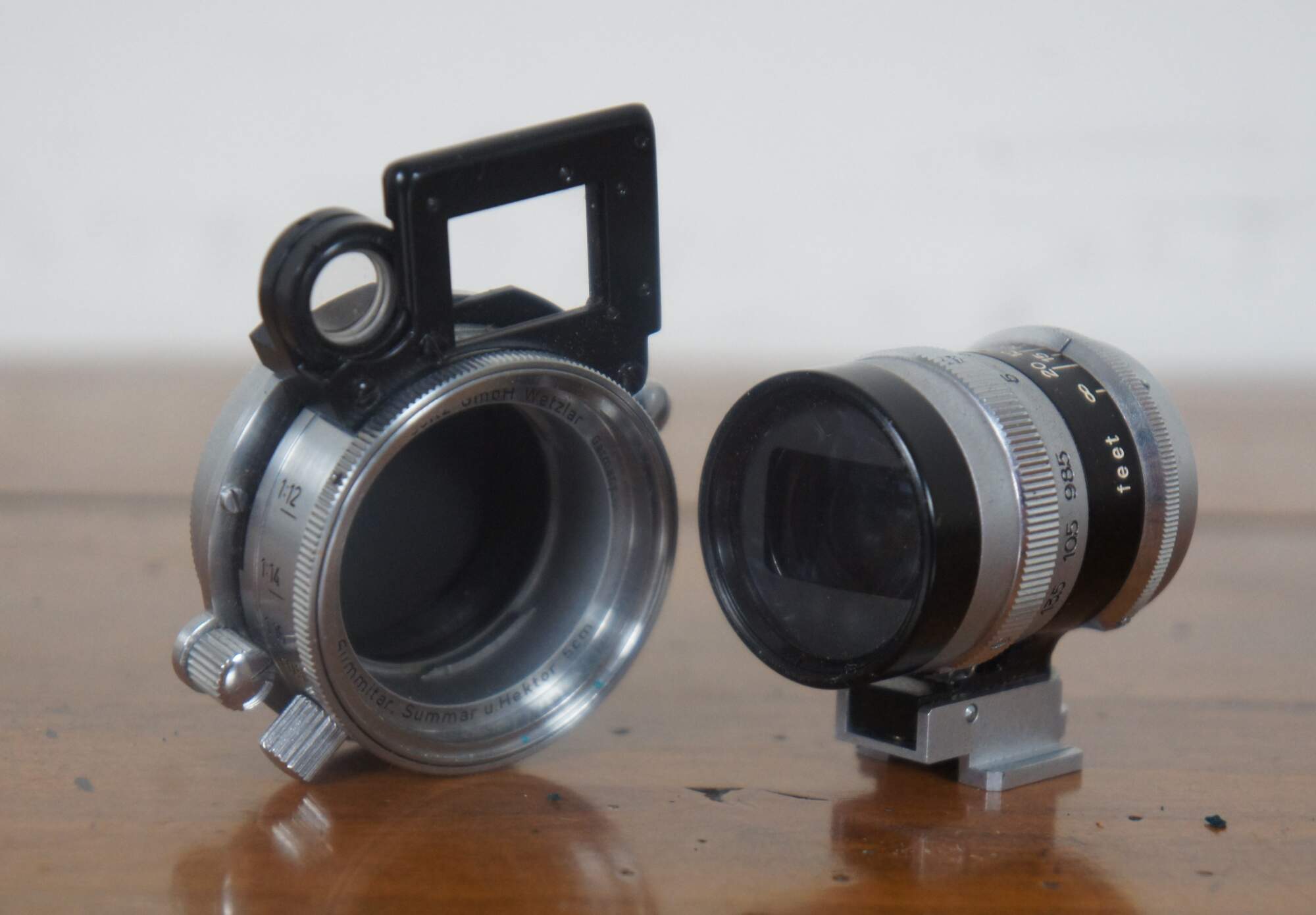 Lot of 38 assorted vintage camera accessories. Lot includes: Perrin No 211 Stereo Realist brown leather camera bag/accessory case; Bilora Biloret model 2037 telescoping tripod; Ernst Leitz Synchonblitzer flash tube and folding reflector; un-marked leather lens case; Enteco Retaining Ring Series VII, Step-Up Ring Series 6-7, and Adapter Ring Series VI No. 615; 2 additional lens adapter rings; 2 loose lens caps; General Electric Exposure Meter Type PR-3 & case; General Electric Dynacell Light Multiplier with instructions & case; Ernst Leitz GmbH Wetzlar plastic rotating shoe mount for tripod; Alpex Universal Finder & case; Ernst Leitz GmbH Wetzlar Summitar, Summar u.Hektor 5cm Optisches Naheinstellgerat Nooky/Nookyhesum & box; leather camera strap; 2 remote shutter buttons; cleaning brush; Ernst Leitz Wetzlar Synchrokabel; Tiffen 2A Type Series VI lens filter & case; Series VII Wratten Filter No. 81C lens filter & pouch; Ernst Leitz N.Y. CF lens filter & pouch; Enteco Series VII Skylight (1A) lens filter; 2 brass tools.