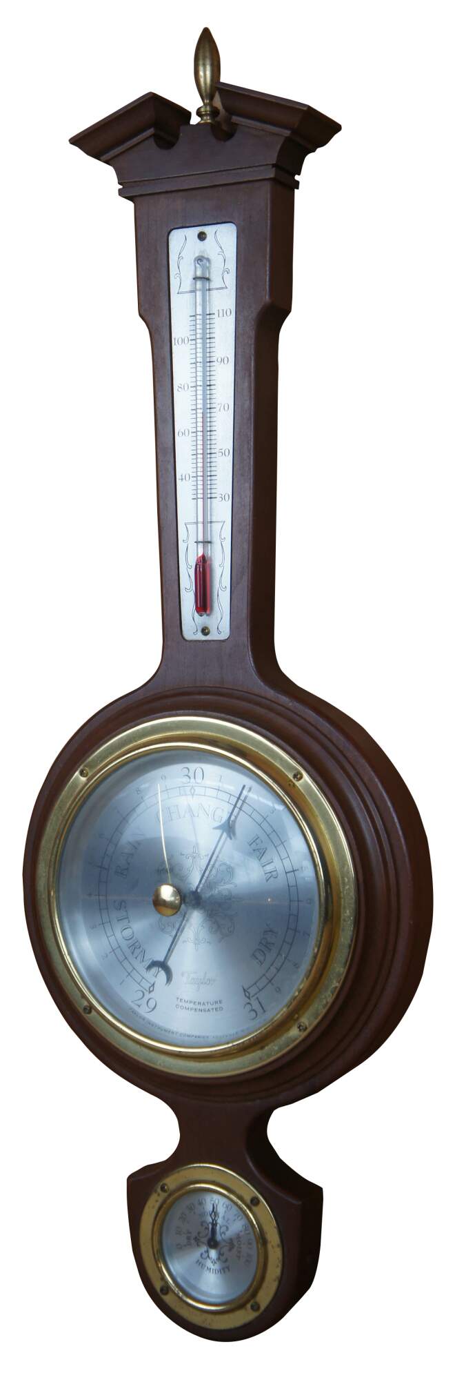 Vintage banjo style barometer/thermometer in brass and wood by Taylor with adjustable knobs.