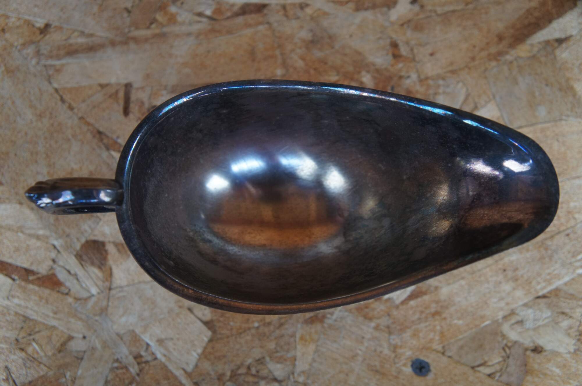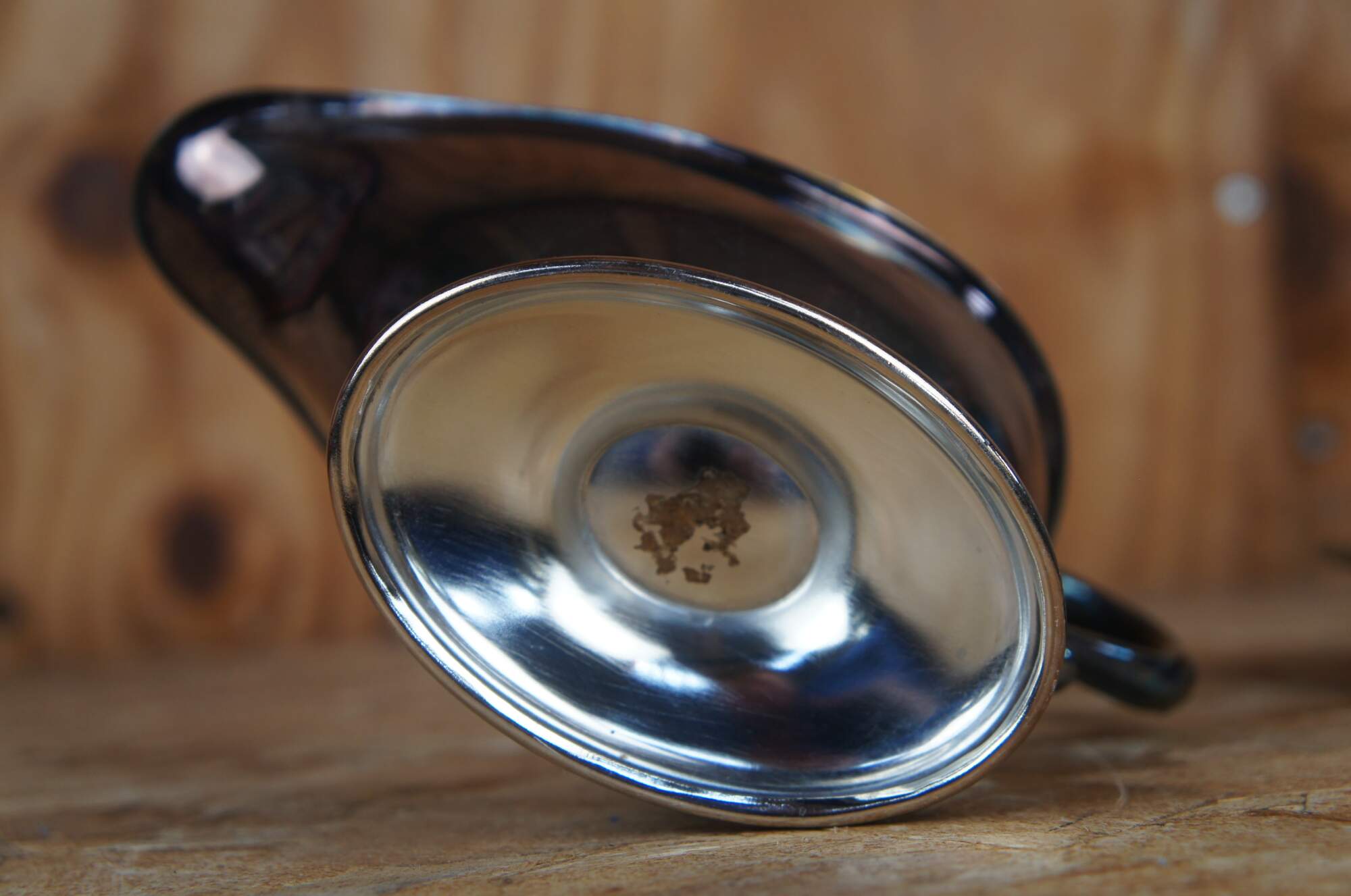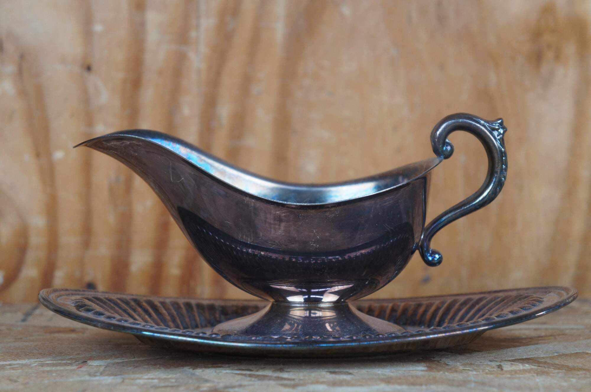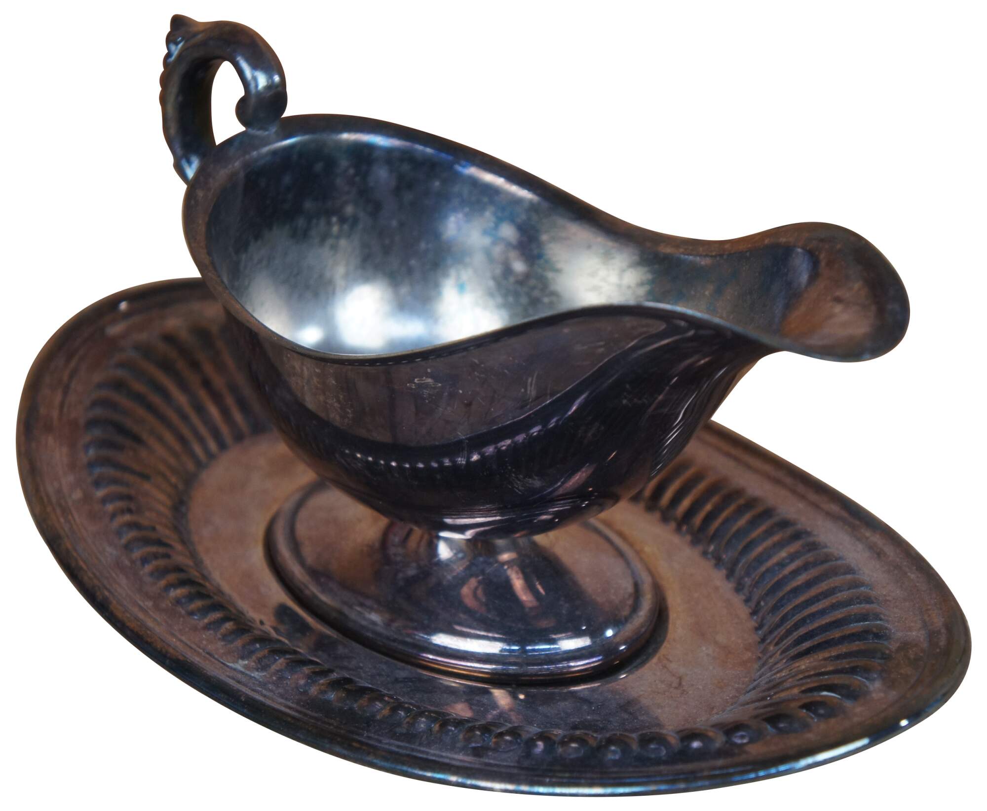 Vintage silver plate gravy/sauce boat on oval underplate tray.