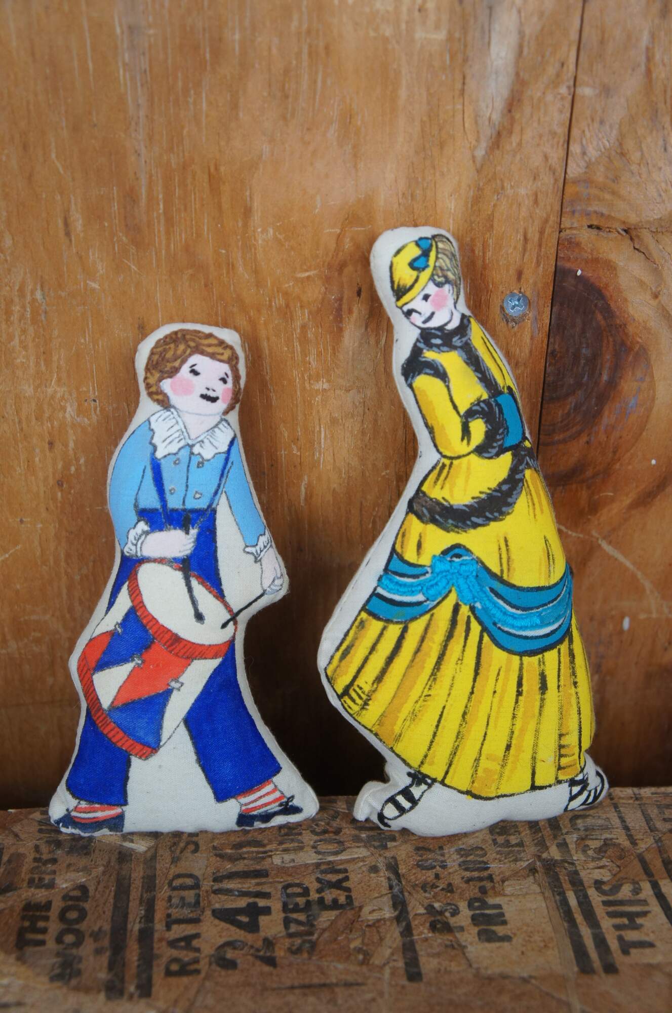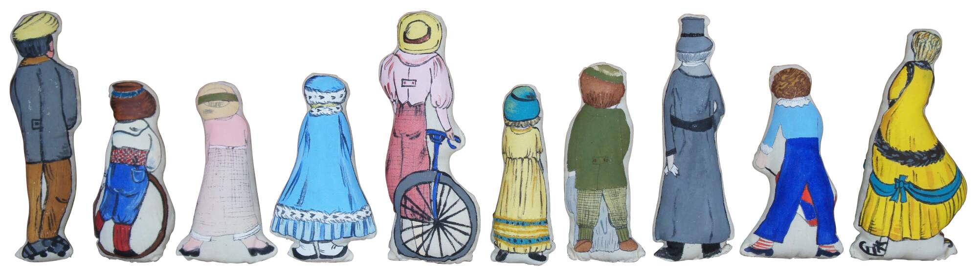 10 vintage handmade soft stuffed painted Victorian people dolls.