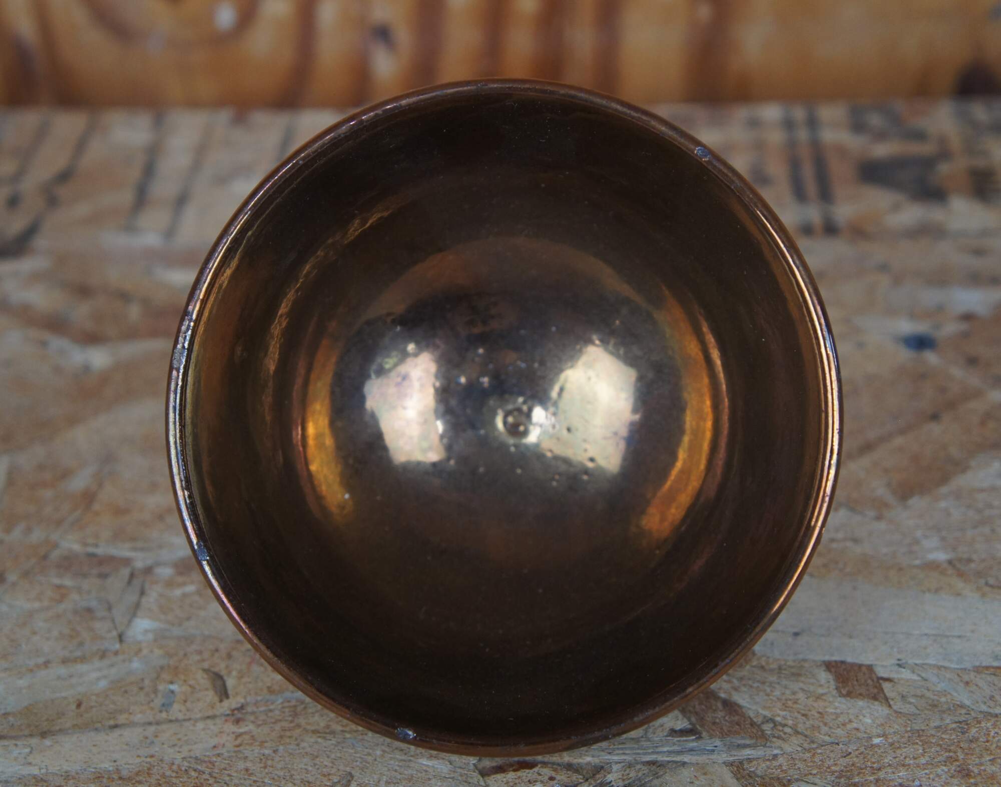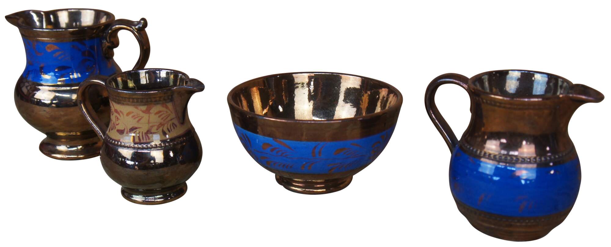 Four antique English copper lusterwares featuring three pitchers and one bowl. One in a gold / tan, the others in cobalt blue. It was made by a wide variety of potters in England from about 1820 to 1850.
