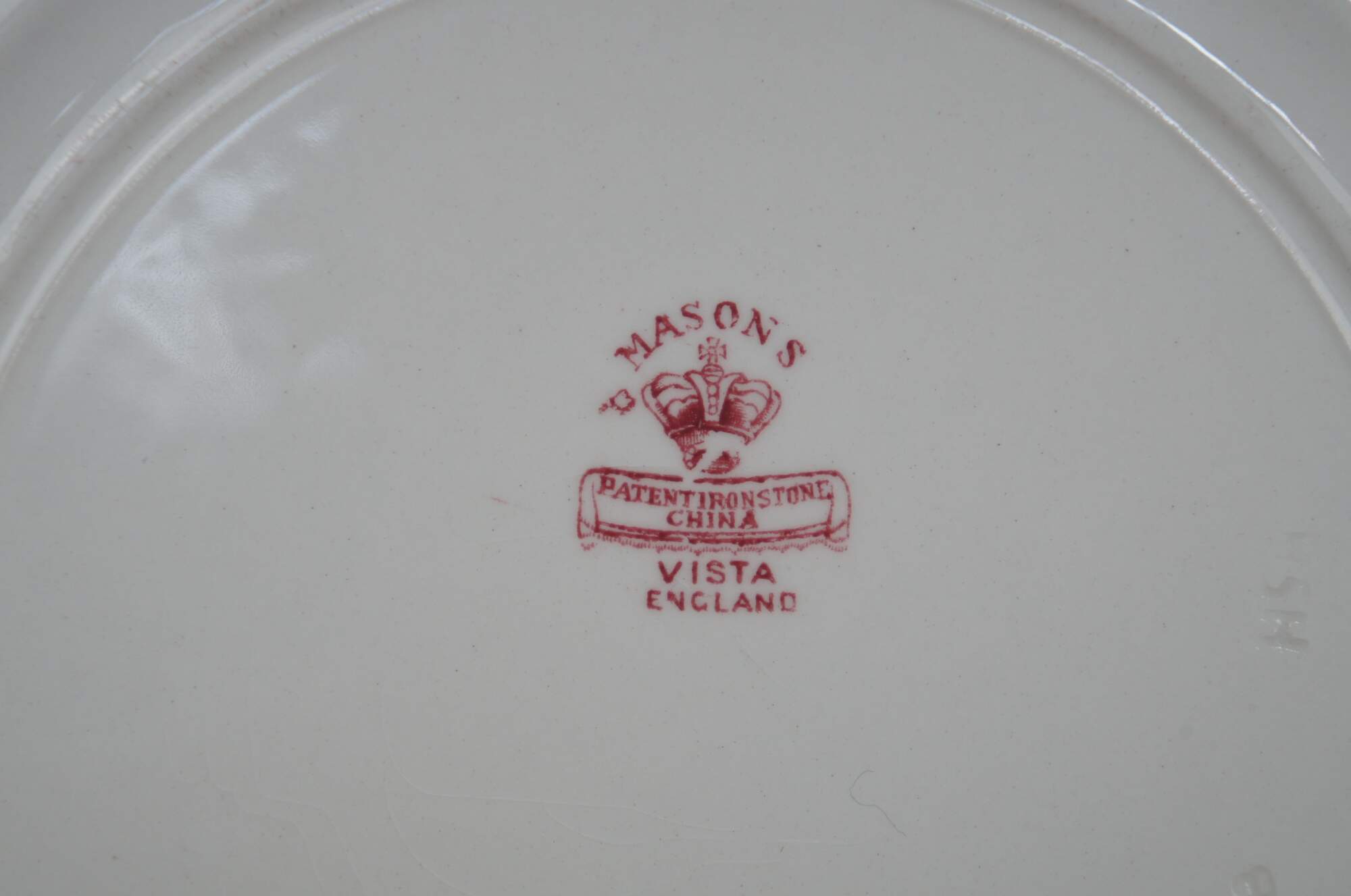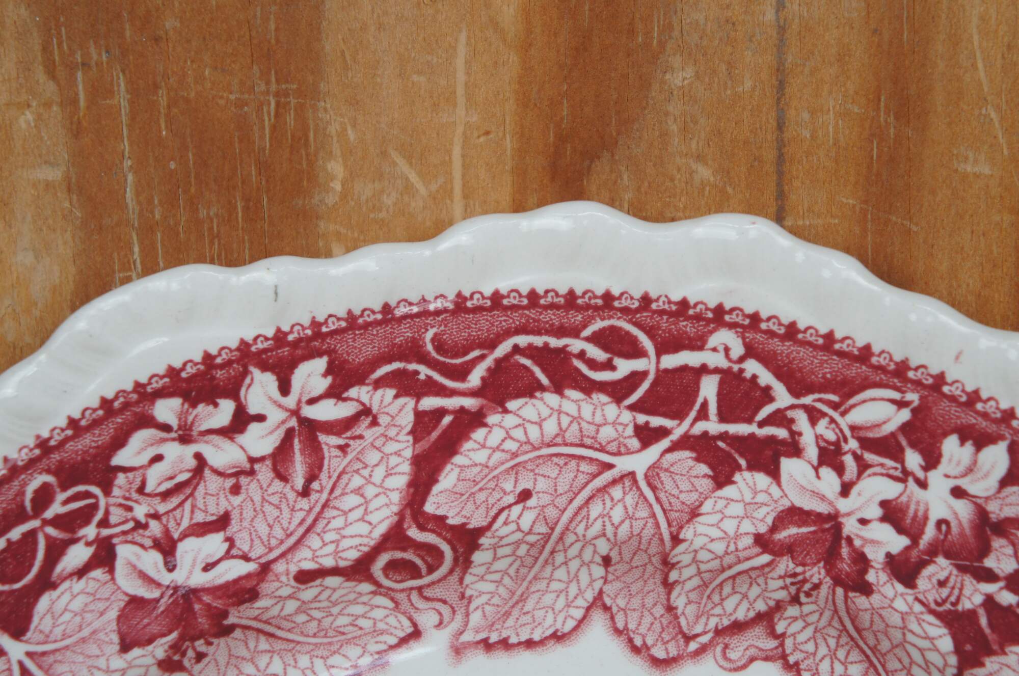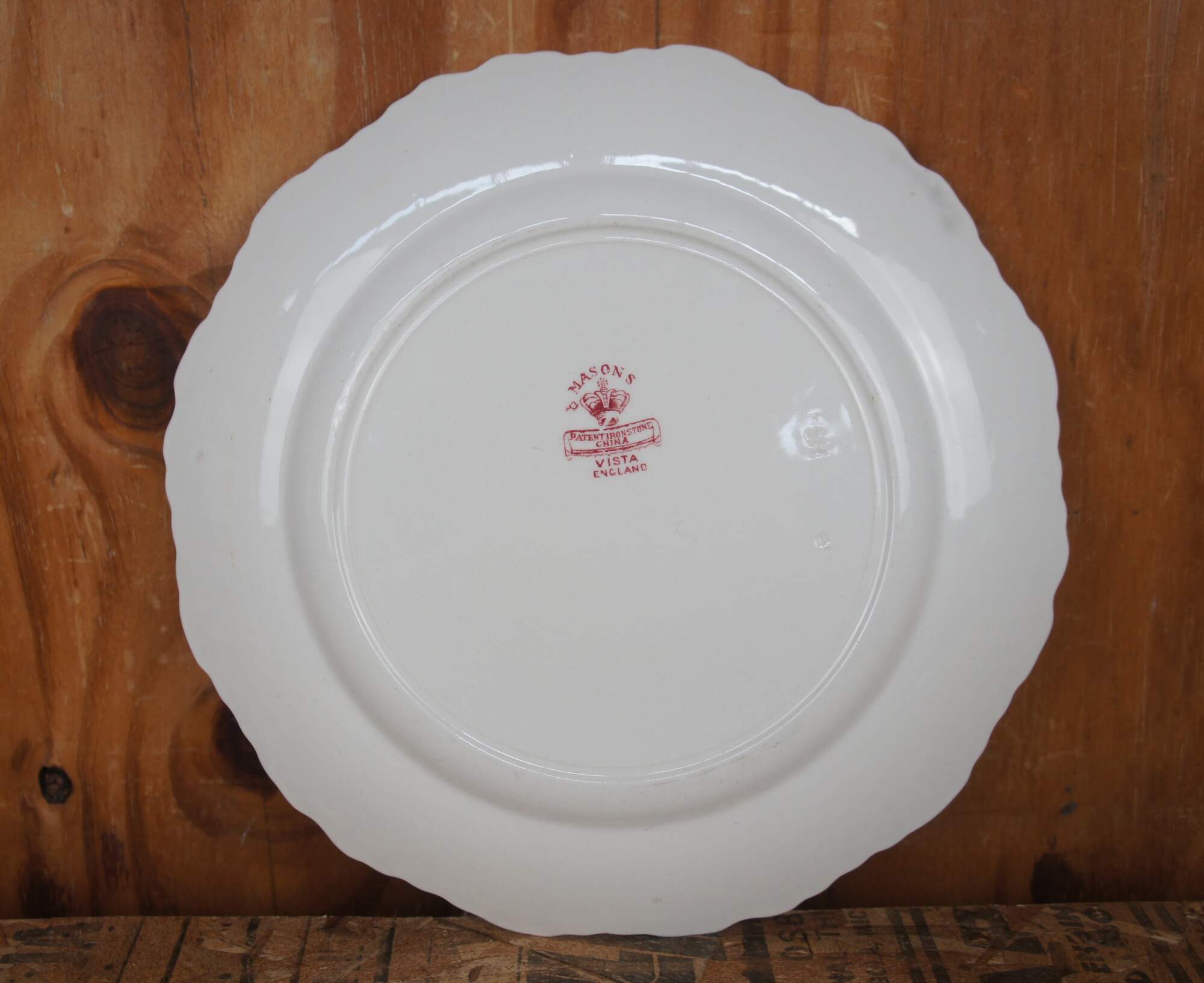 Vintage Vista England Mason’s Ironstone red transferware plate with scalloped edge, floral and leaf motif and a castle scene with figures and a dog.