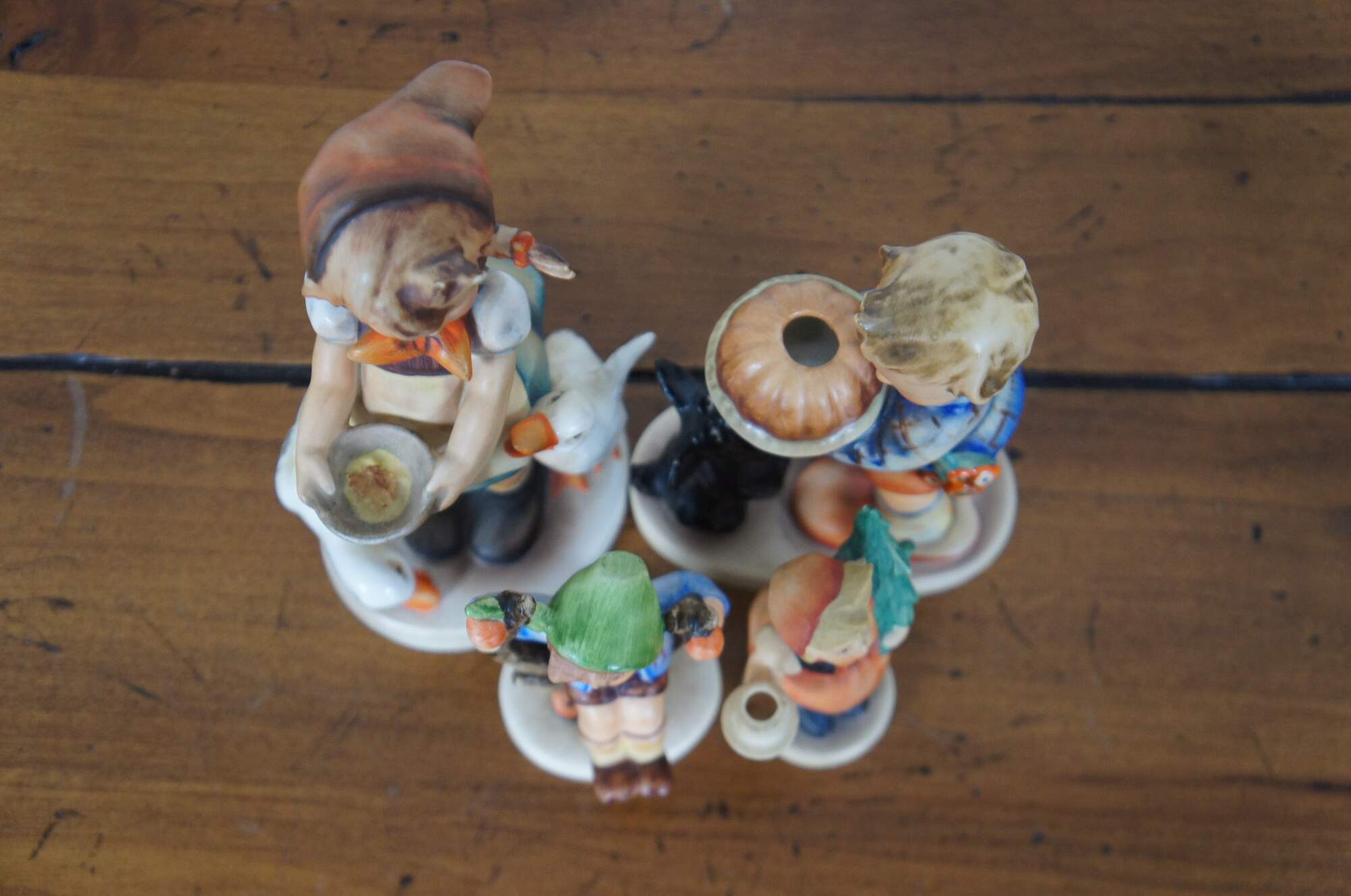 Lot of 4 assorted Goebel M.I. Hummel porcelain figurines – number 142 3/0 titled apple Tree Boy; number 197 / 1 titled Be Patient (girl feeding geese); number Mel 2 titled Girl with Fir Tree (candle holder); and number 9 titled Begging His Share (boy, dog, bunt cake) (candle holder) – made in West Germany with the stamped TMK3 Stylized Bee mark (1957-1972).