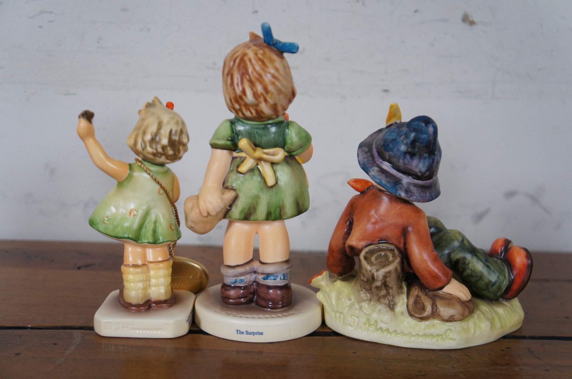 Lot of 3 Exclusive Special Edition porcelain figurines for the Goebel Collectors Club and M.I. Hummel Club – number 409 titled Coffee Break, Exclusive Special Edition No. 8 with incised production date 1976, marked MA84 by the artist; number 431 titled The Surprise, Exclusive Special Edition No. 12, with incised production date 1981, marked La88 by the artist – made in west Germany with the stamped TMK6 Missing Bee mark (1979-1990) – and number 793 titled Forever Yours, First Issue with incised production date 1996, marked Wi96 by the artist, includes original box, made in Germany with the stamped TMK7 Hummel mark (1990-1999).