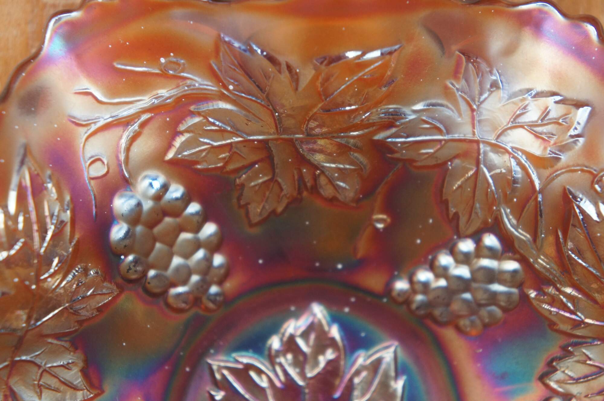 Fenton Amethyst carnival glass dish or ashtray embossed depicting grapes, vines and leaves.