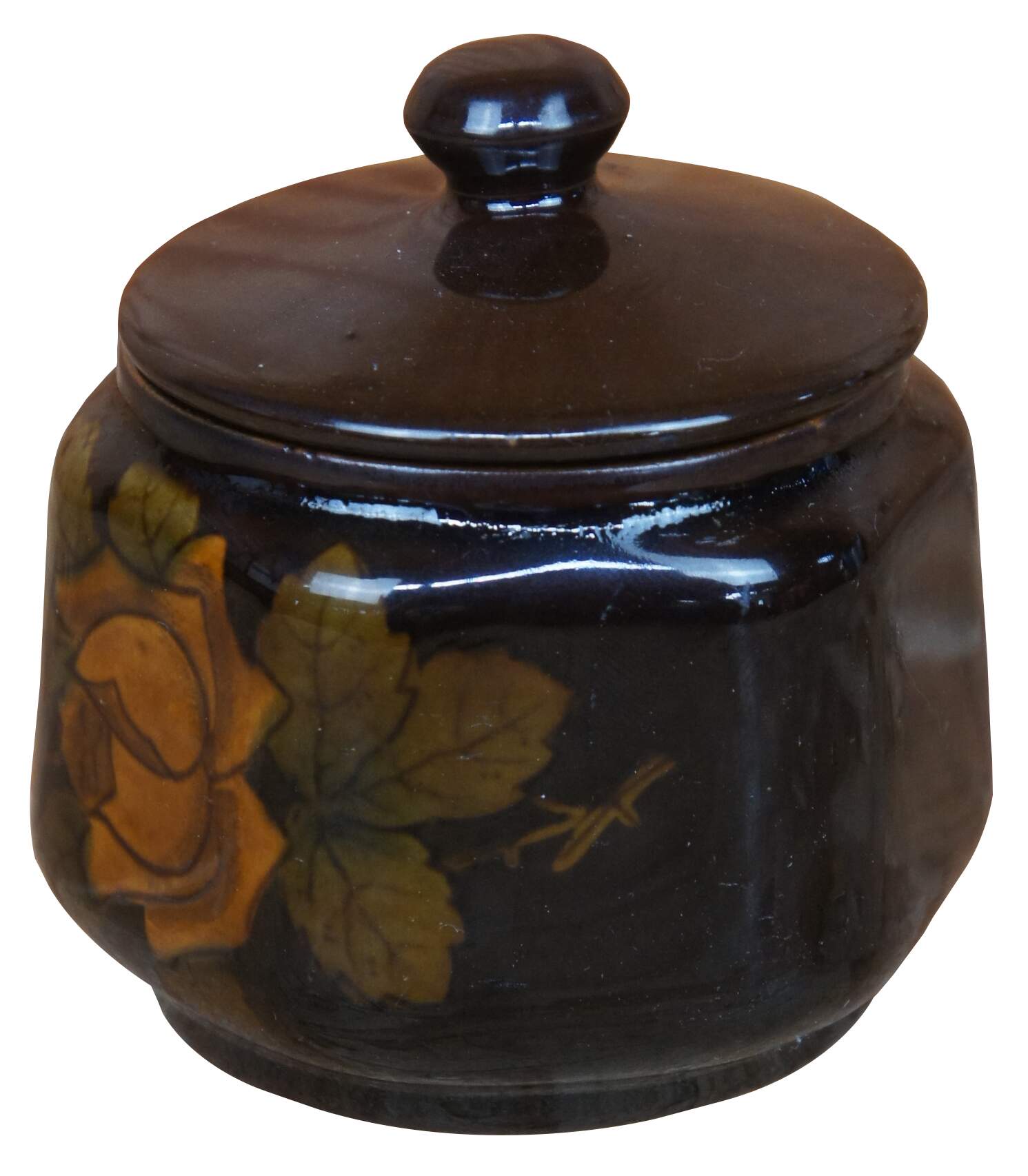 Ceramic dish with lid depicting a rose in tones of brown. Marked 980 on underside