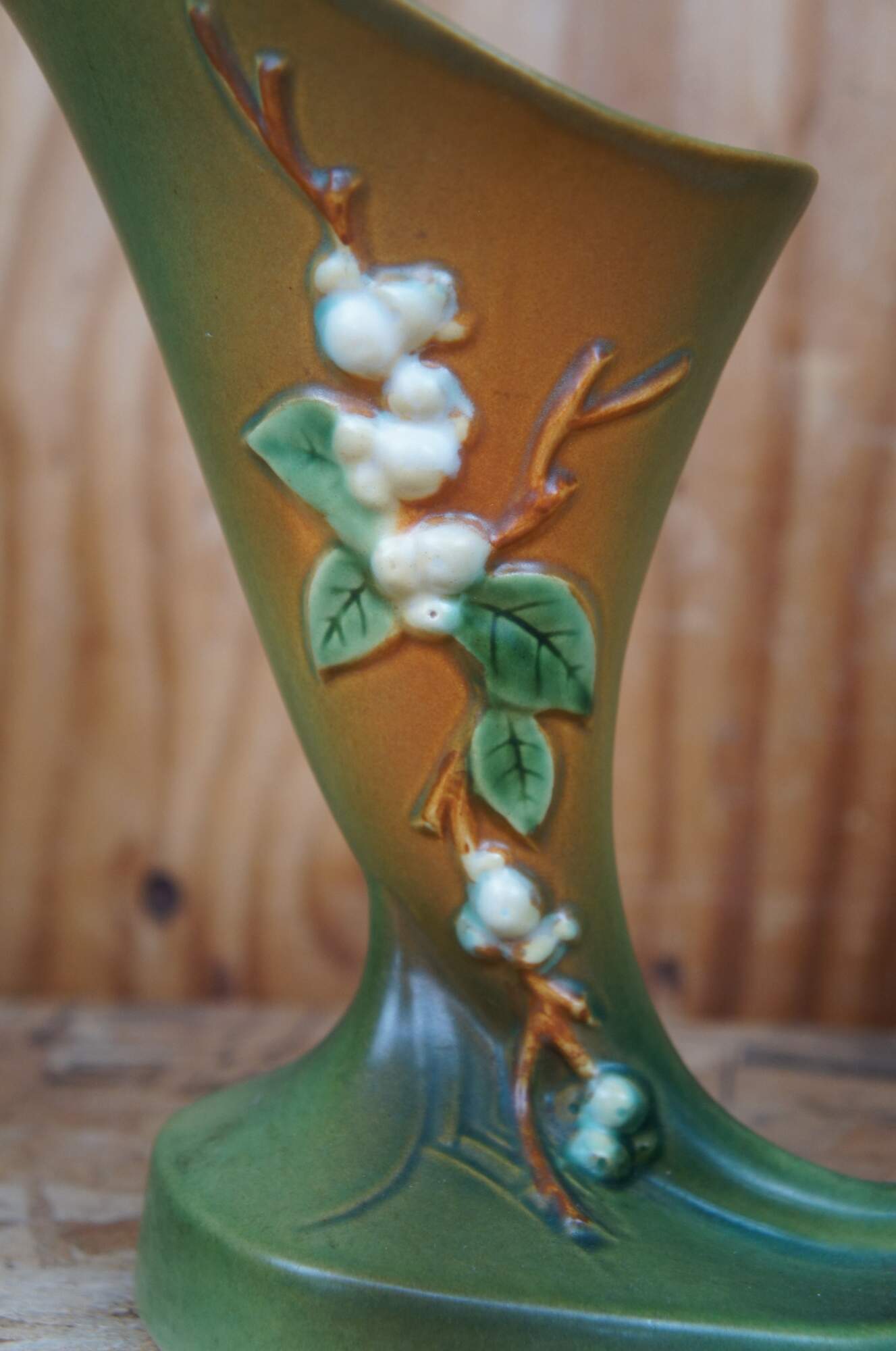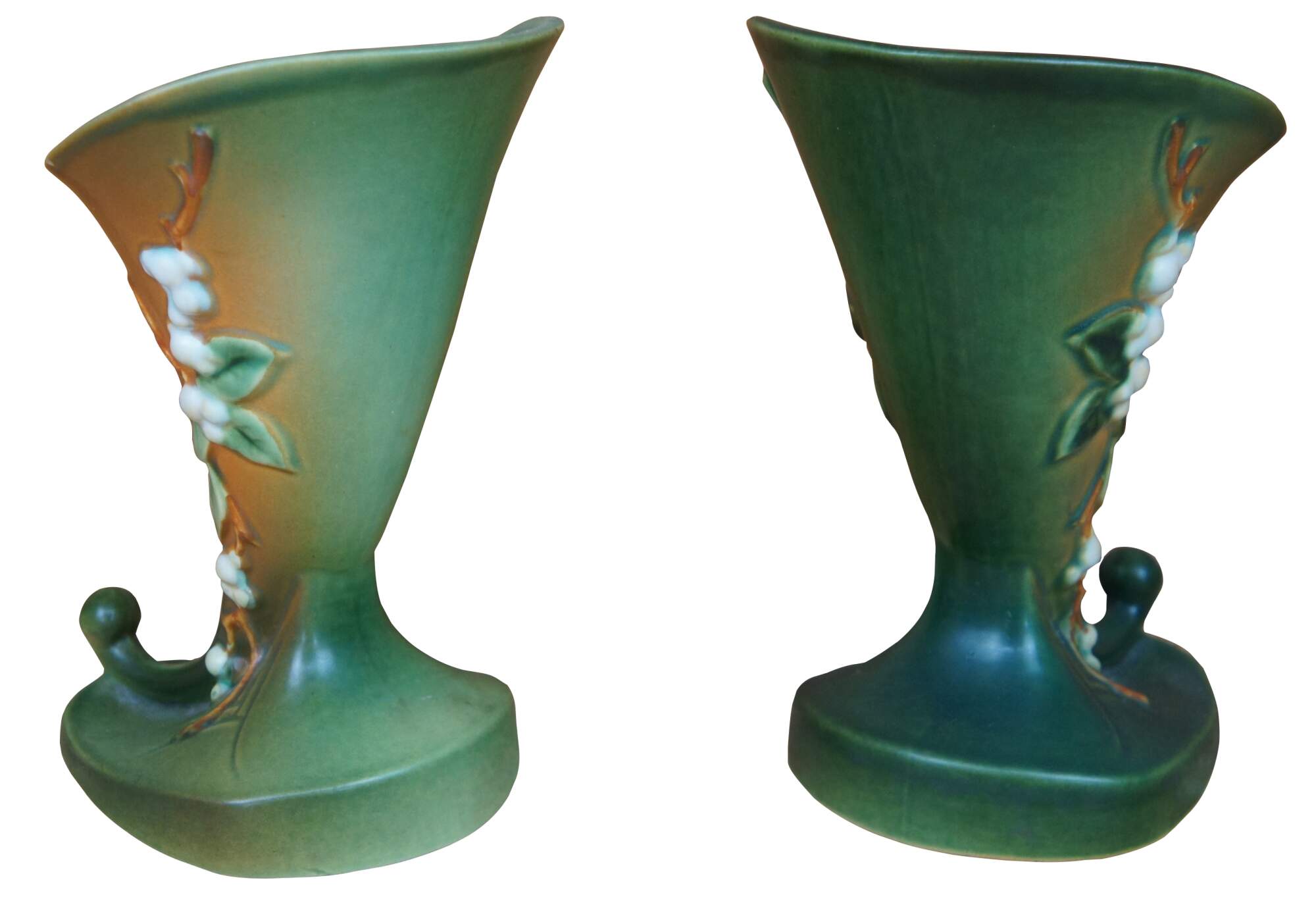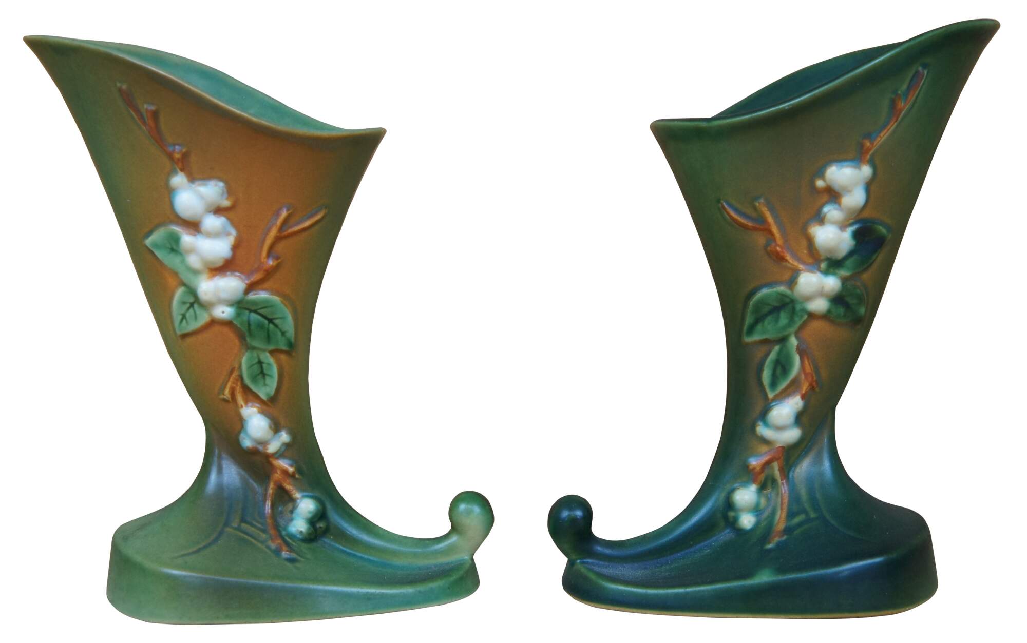 Pair of matching Roseville pottery in a cornucopia vase shape in green with Snowberry pattern numbered 100-8”.