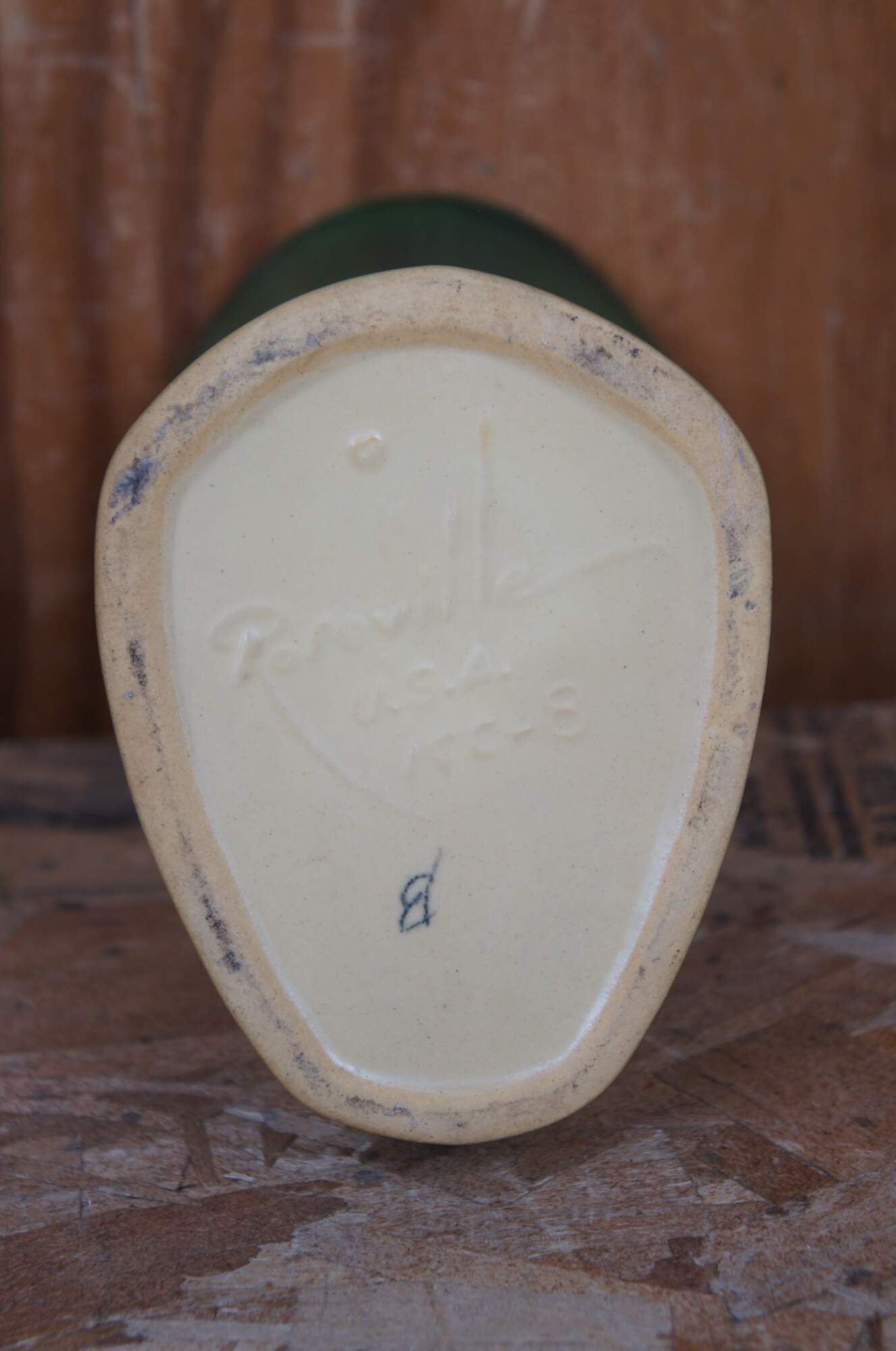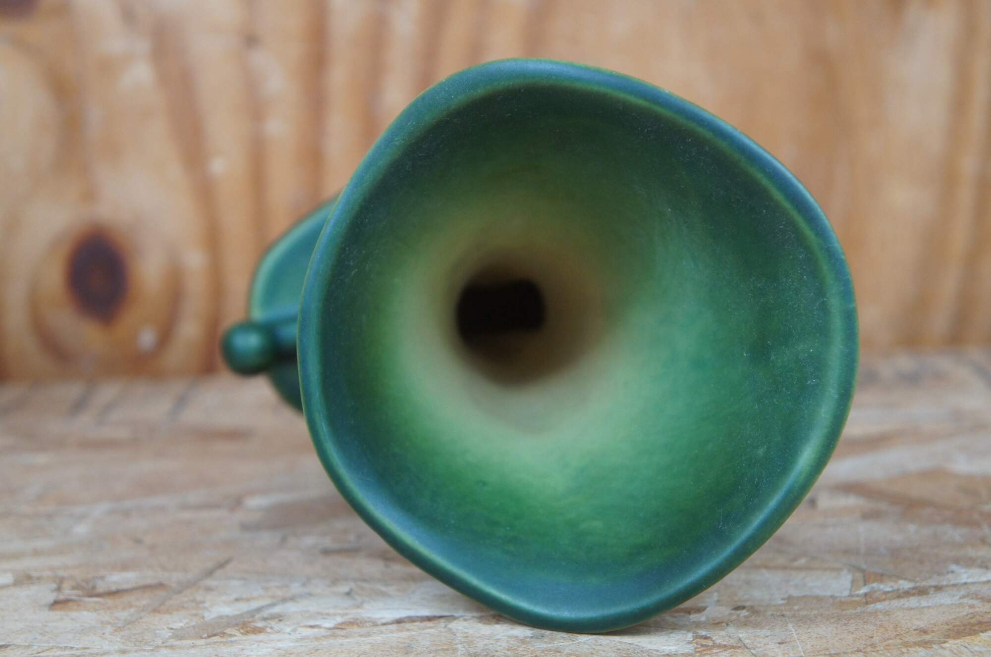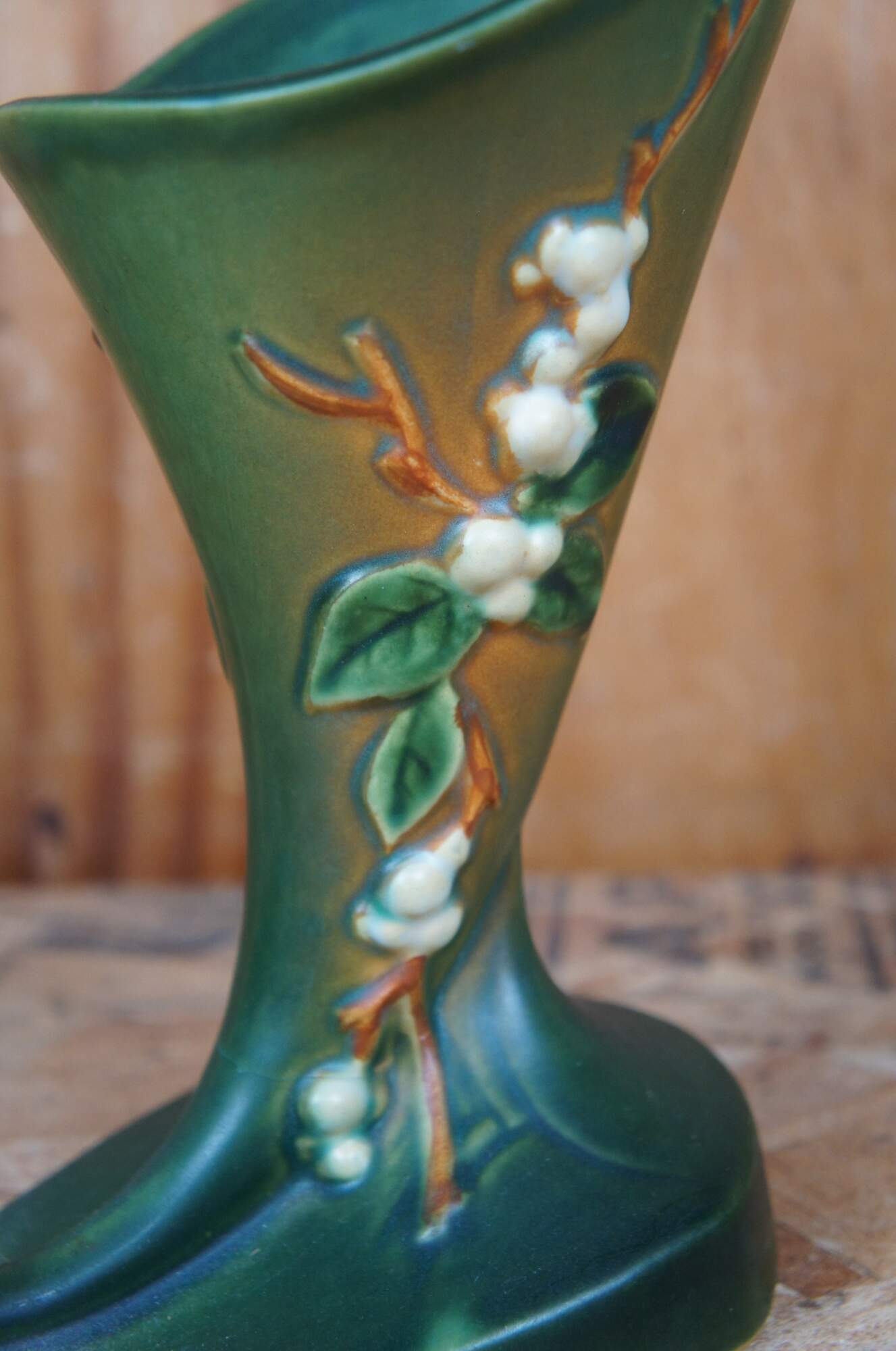 Pair of matching Roseville pottery in a cornucopia vase shape in green with Snowberry pattern numbered 100-8”.