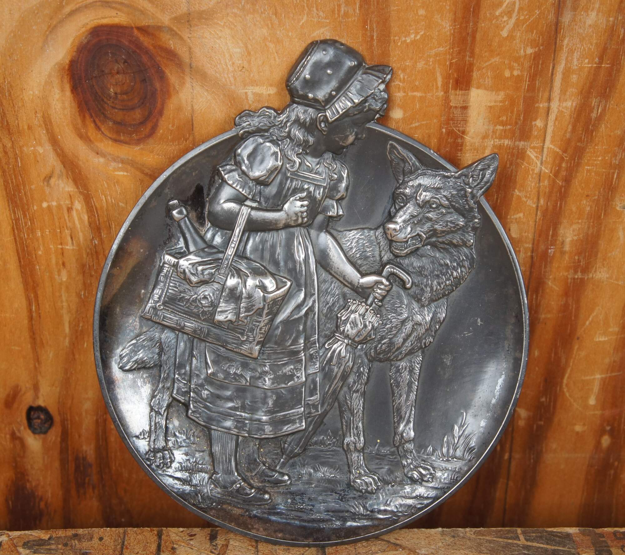 2 metal wall hanging plaques. One features red riding hood with a wolf and the other shows a european boy holding a basket of cats besides a golden retriever.