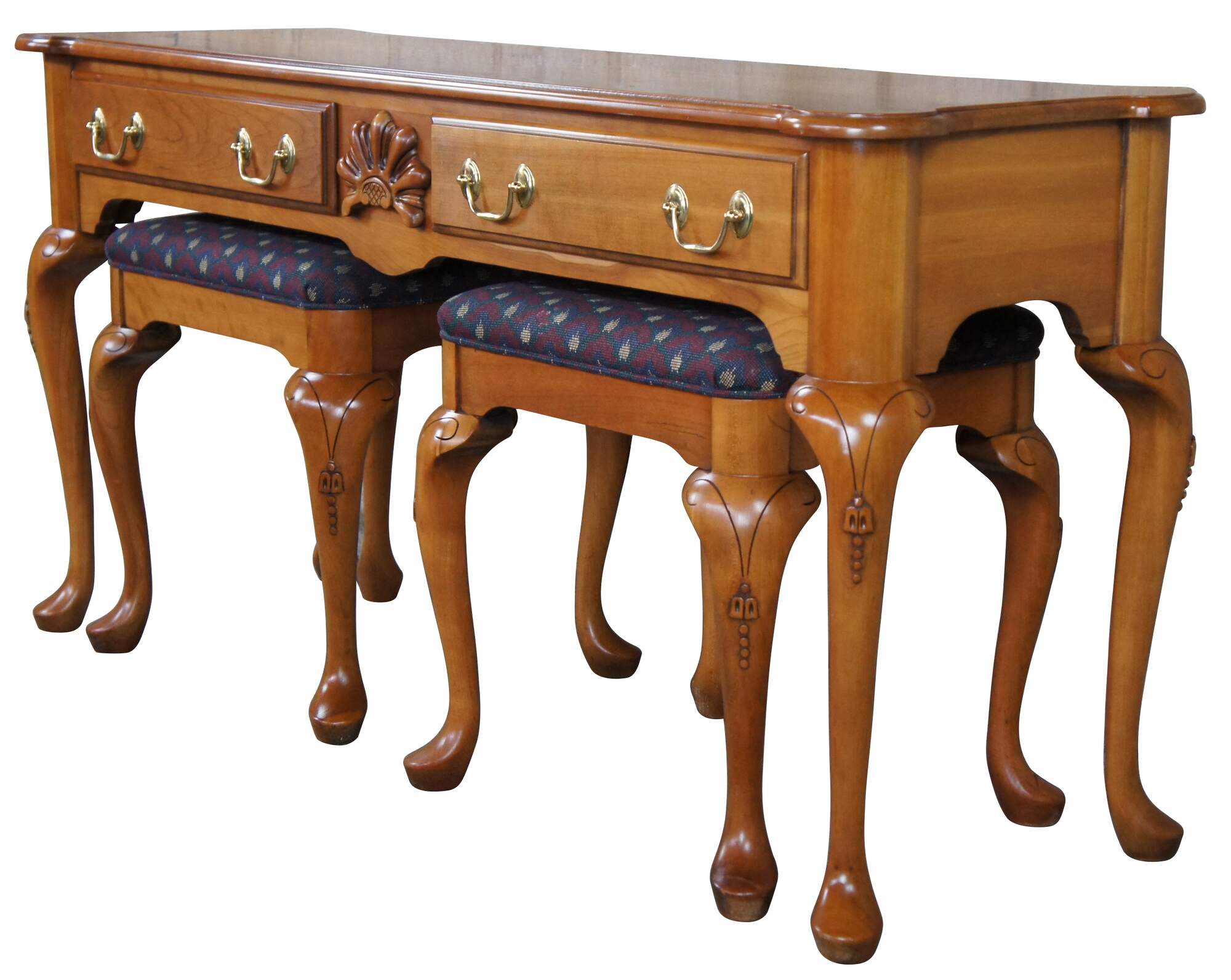 Harden Furniture American Cherry Sofa Table & Stool Set, circa 1980s. Features a rectangular form with scalloped shell carving flanked by two dovetailed drawers with brass bail hardware. The table is supported by long cabriole legs with carved knees. Includes matching stools with maroon, blue, gold and green diamond patterned fabric.