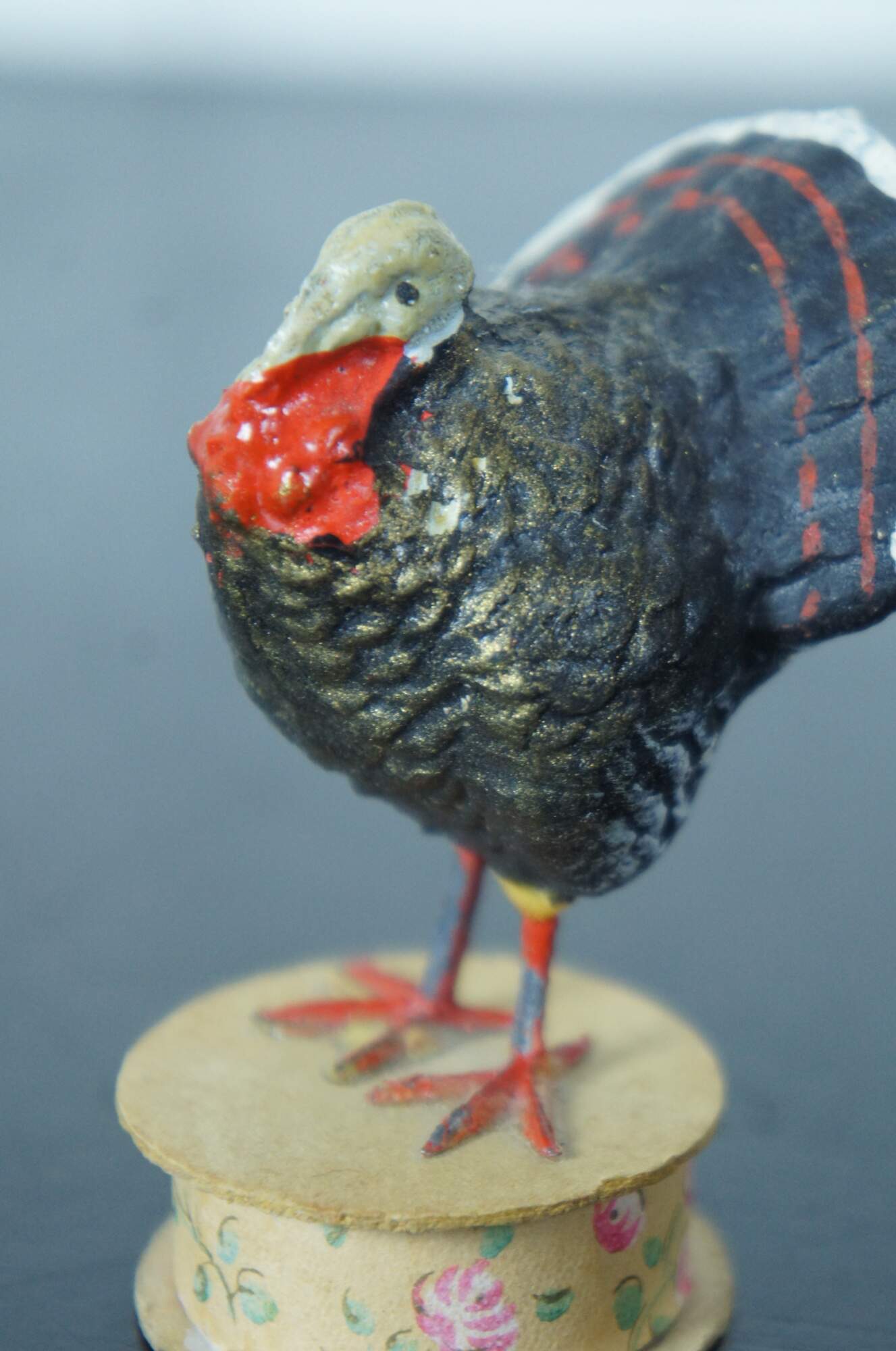 Lot of three antique German composition and paper mache Thanksgiving turkey candy containers, two matching and one standing on a box base.