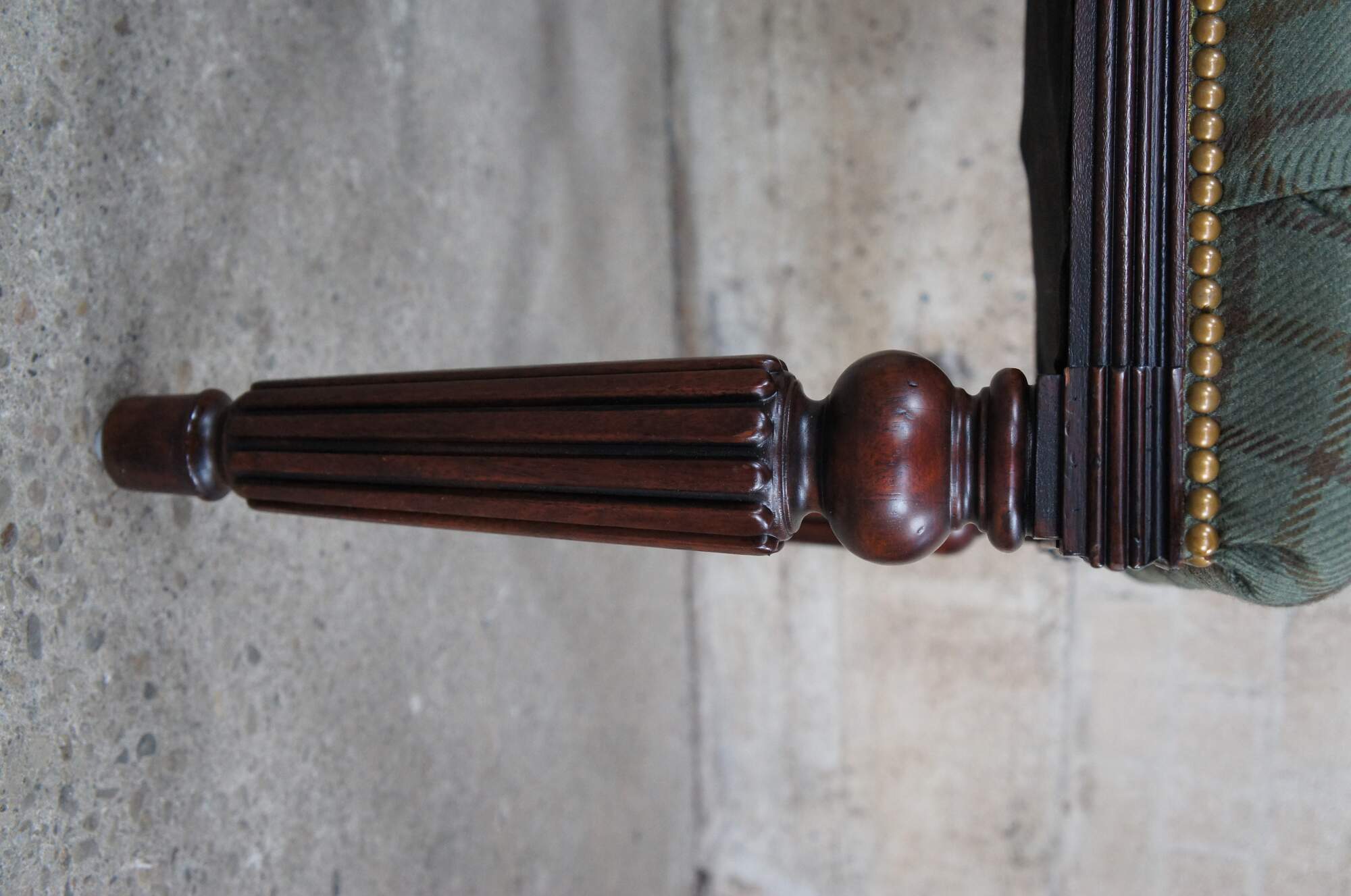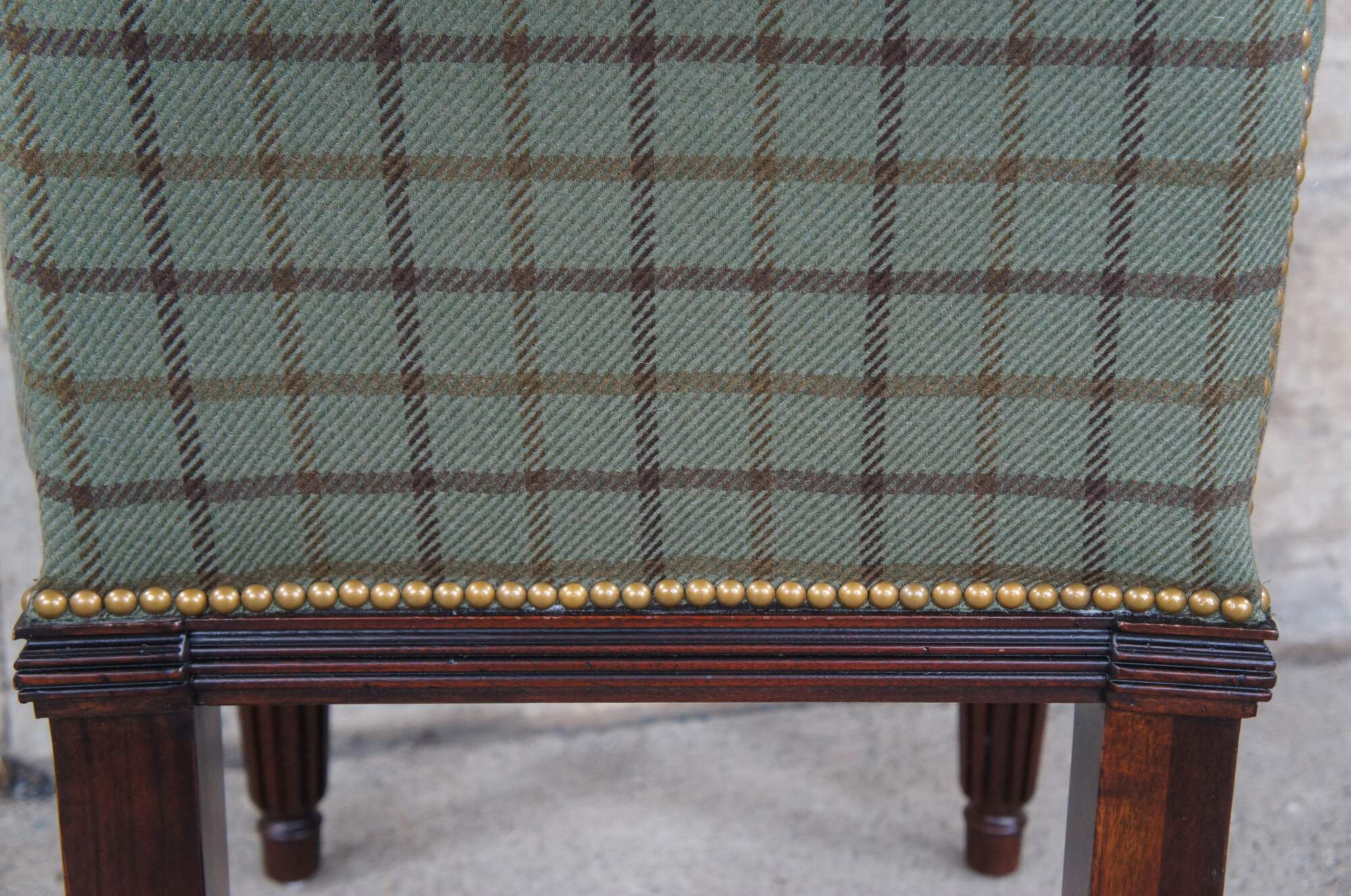 Traditional Ralph Lauren Chair. Features shaped tall backs, tufted green plaid wool upholstery with nail head trim and brass handle along the back. Supported by turned mahogany reeded legs with real splay legs
