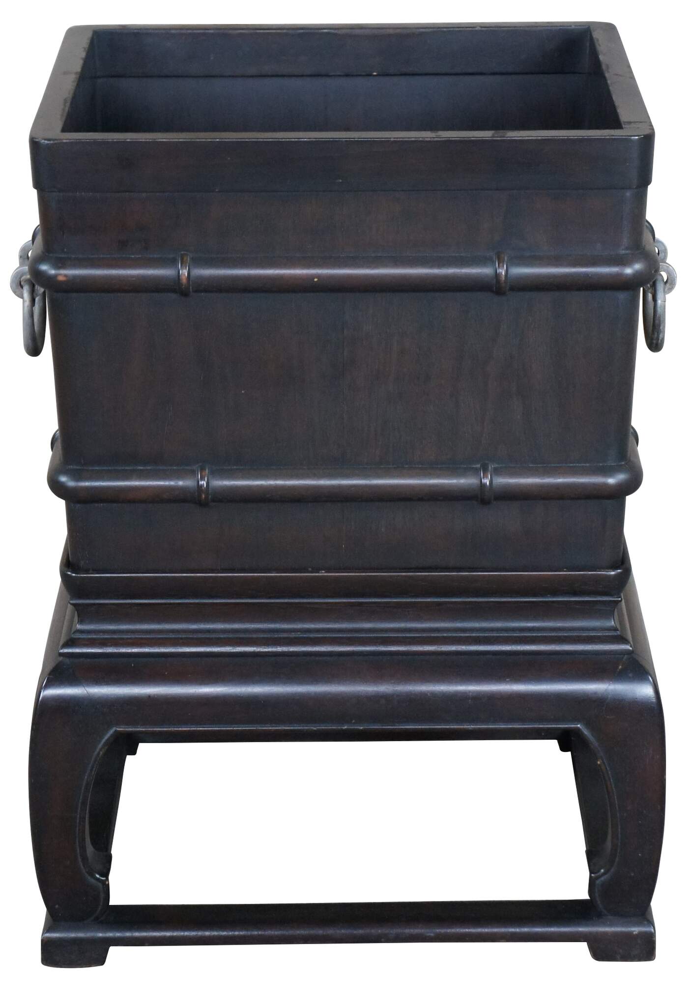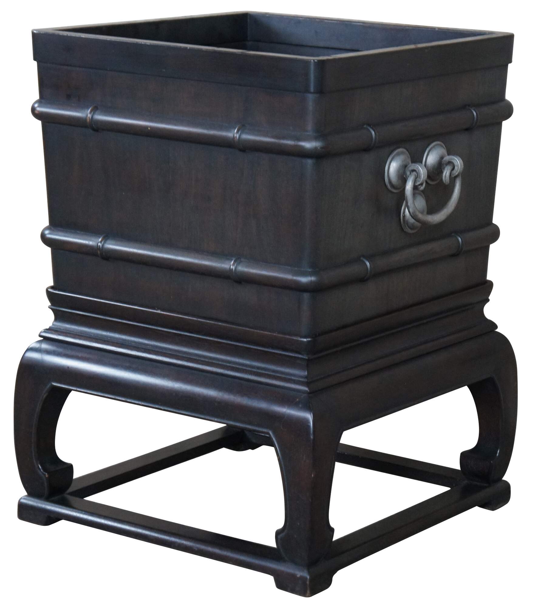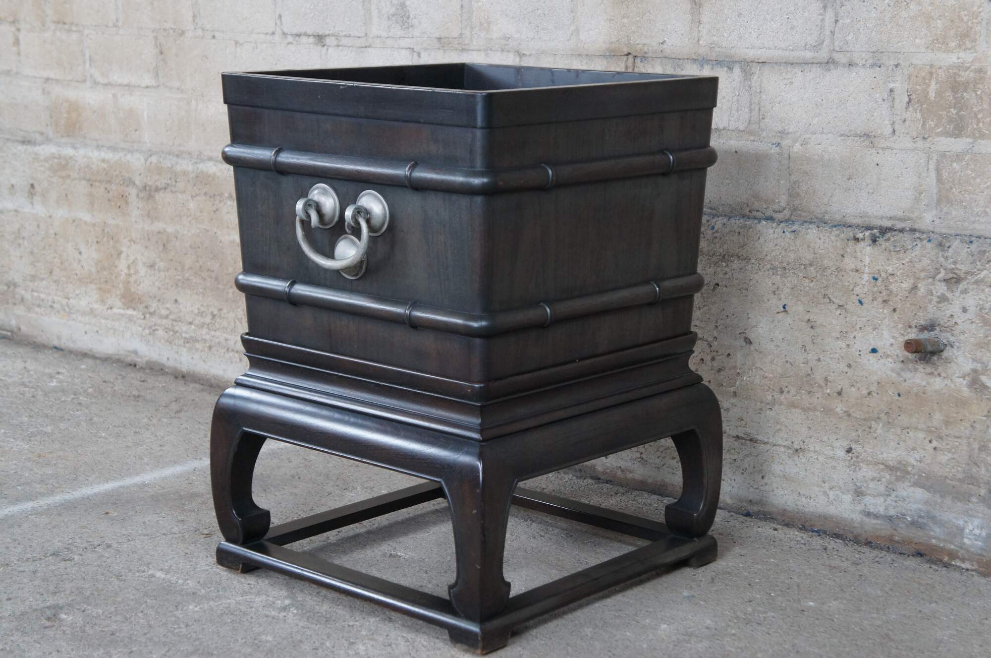 A rare and extraordinary Baker Furniture Far East Collection planter on stand. Made from dark walnut with bamboo form trim and elegant silver drop pulls.