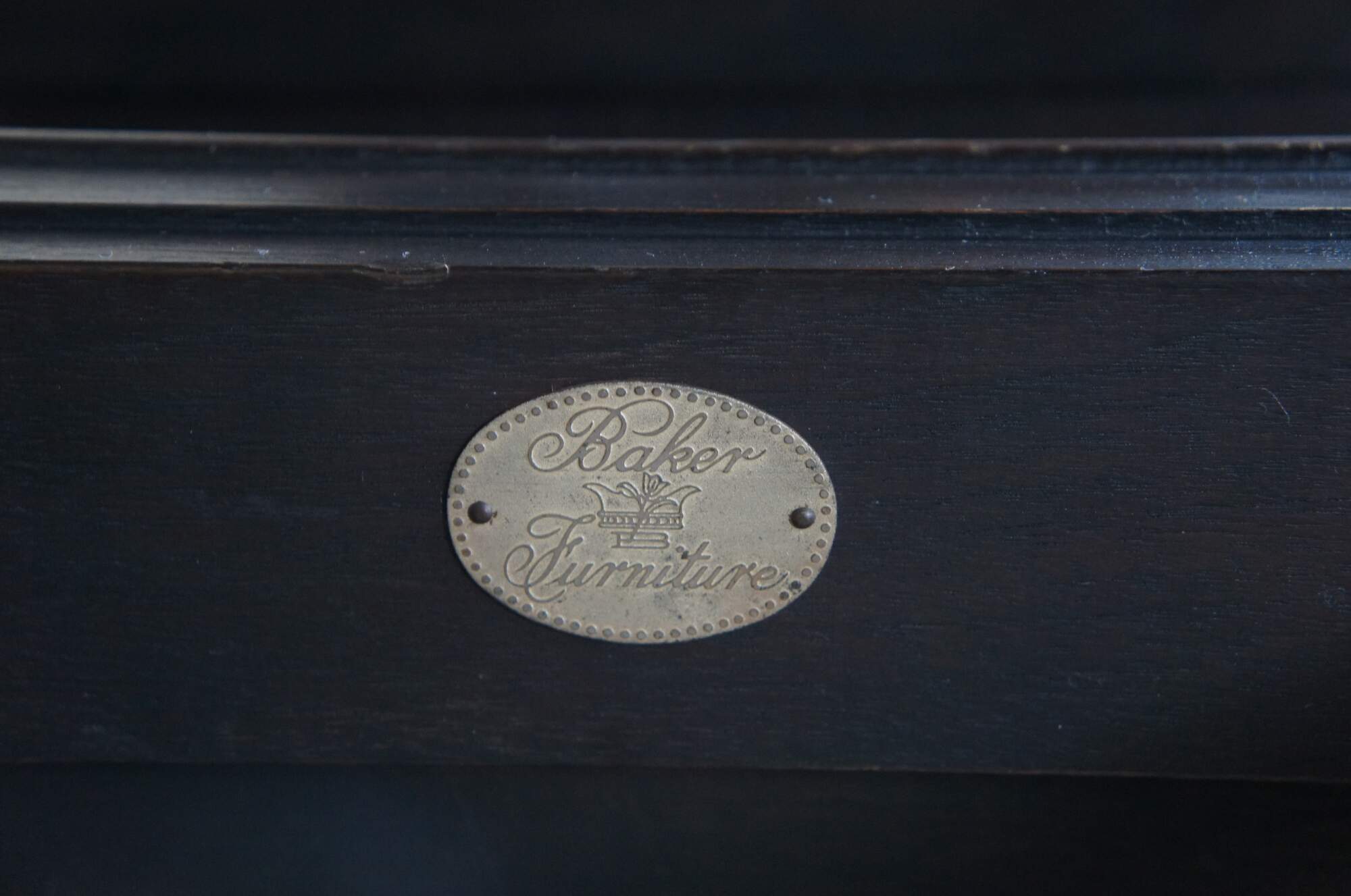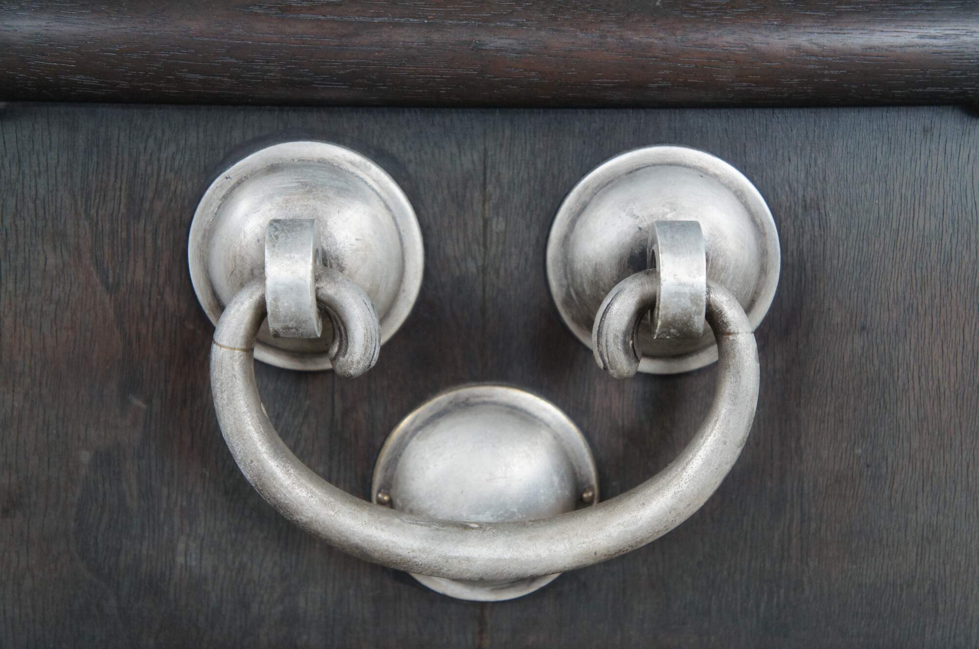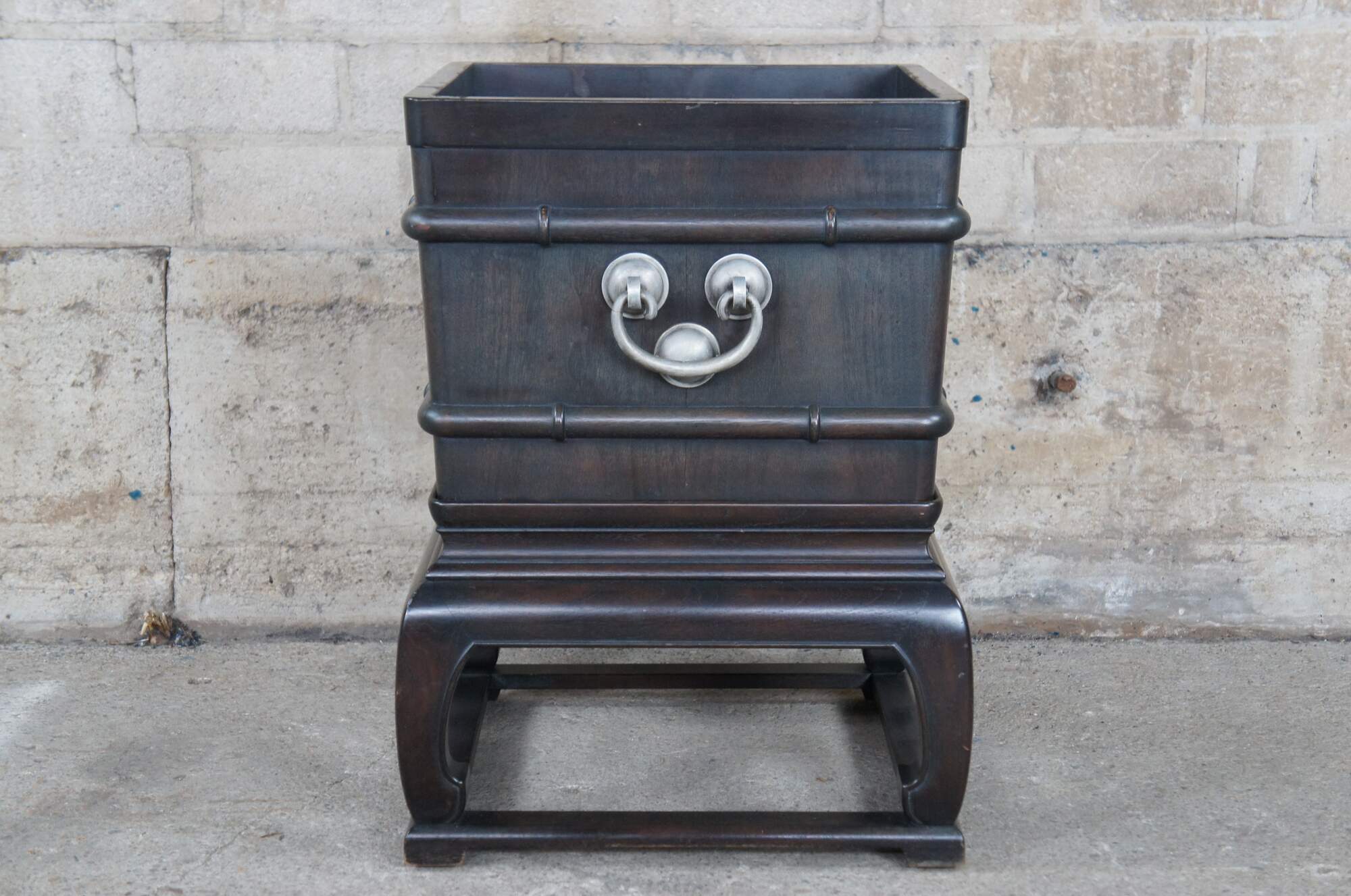 A rare and extraordinary Baker Furniture Far East Collection planter on stand. Made from dark walnut with bamboo form trim and elegant silver drop pulls.