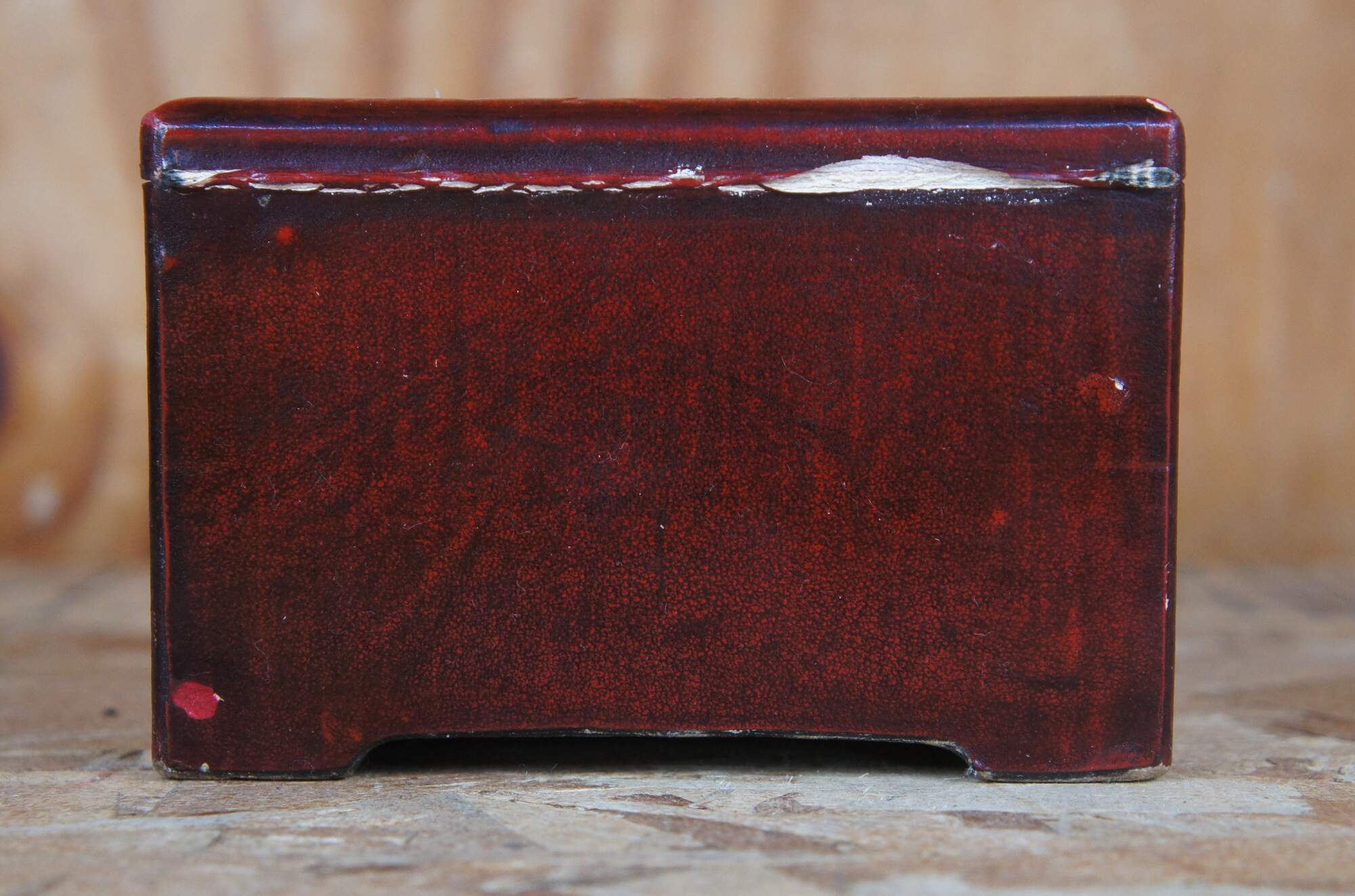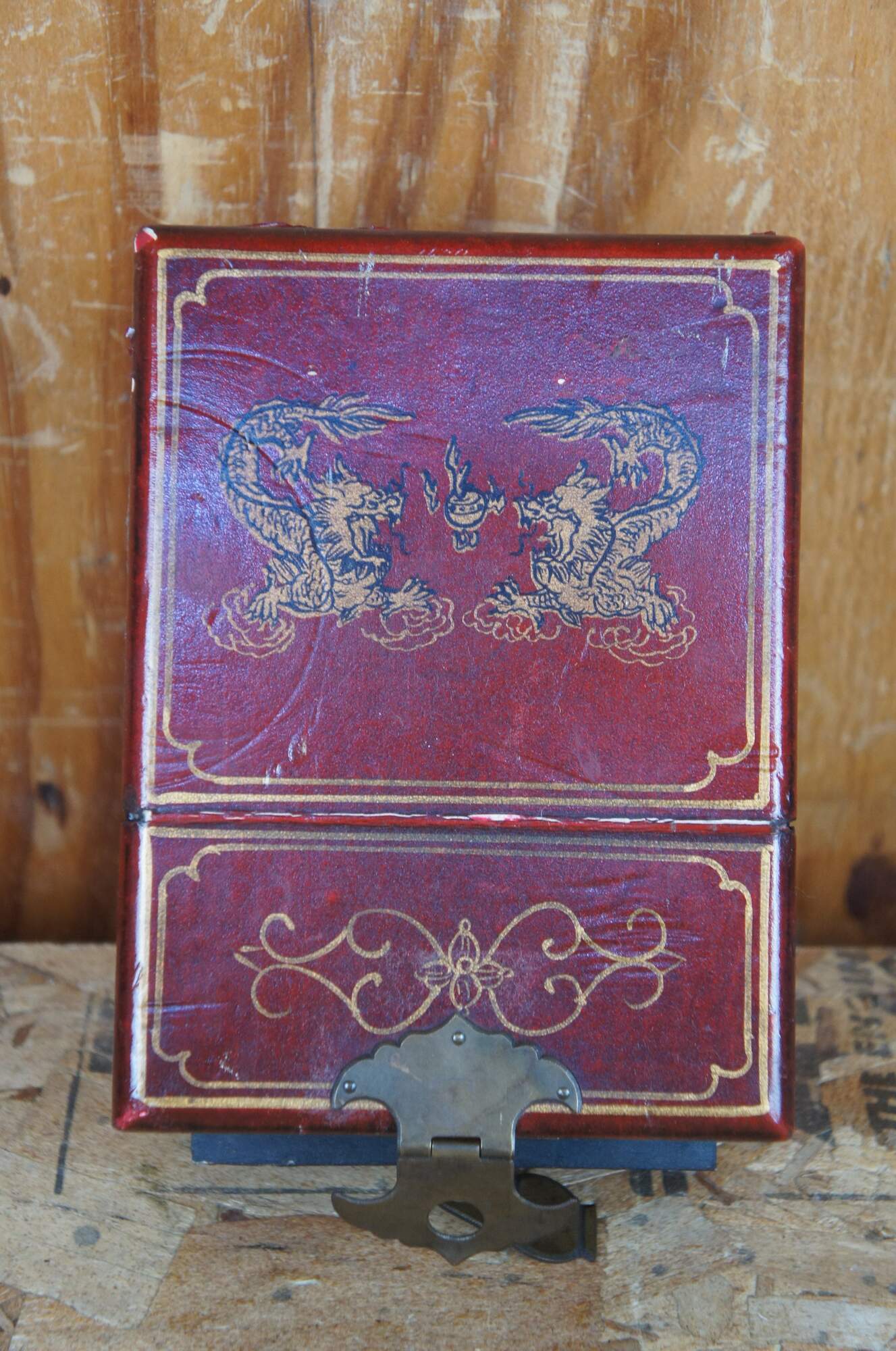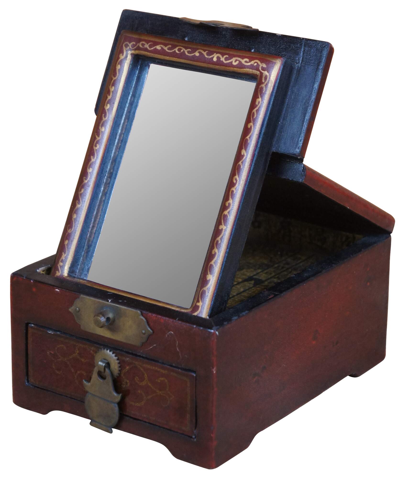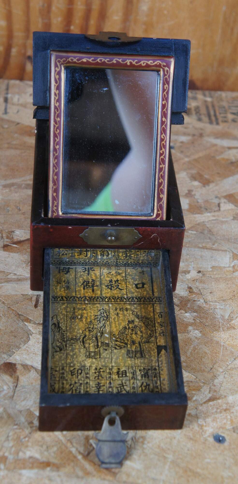 Antique Chinese chinoiserie flip top shaving or jewelry / vanity / cosmetics box with a mirror and drawer lined with paper depicting Maxims for the well Governed Household and Hundreds of Chinese Surnames.