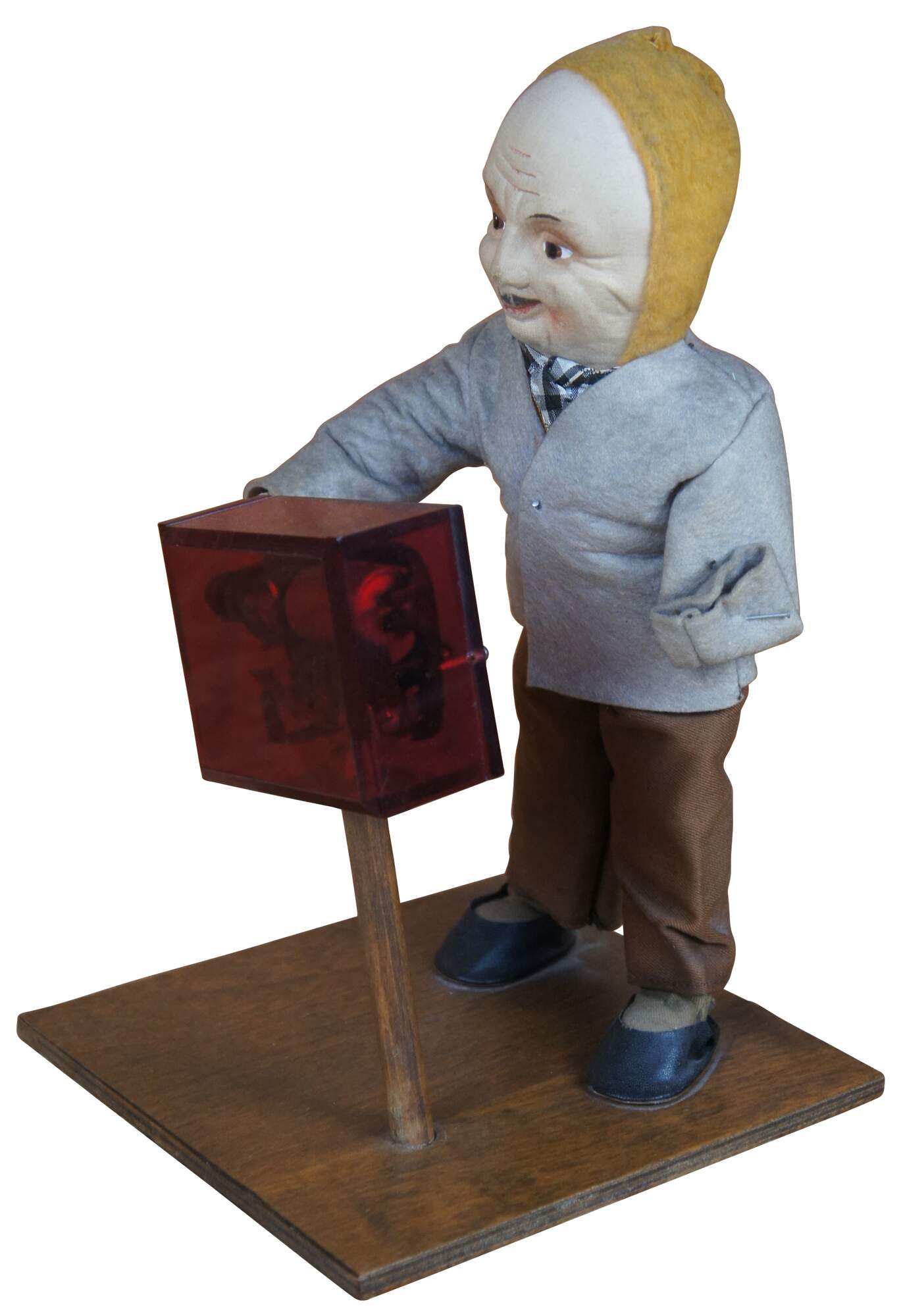 Stuffed folk art doll figurine featuring an old man with one arm turning a musical organ grinder that plays God Bless America.