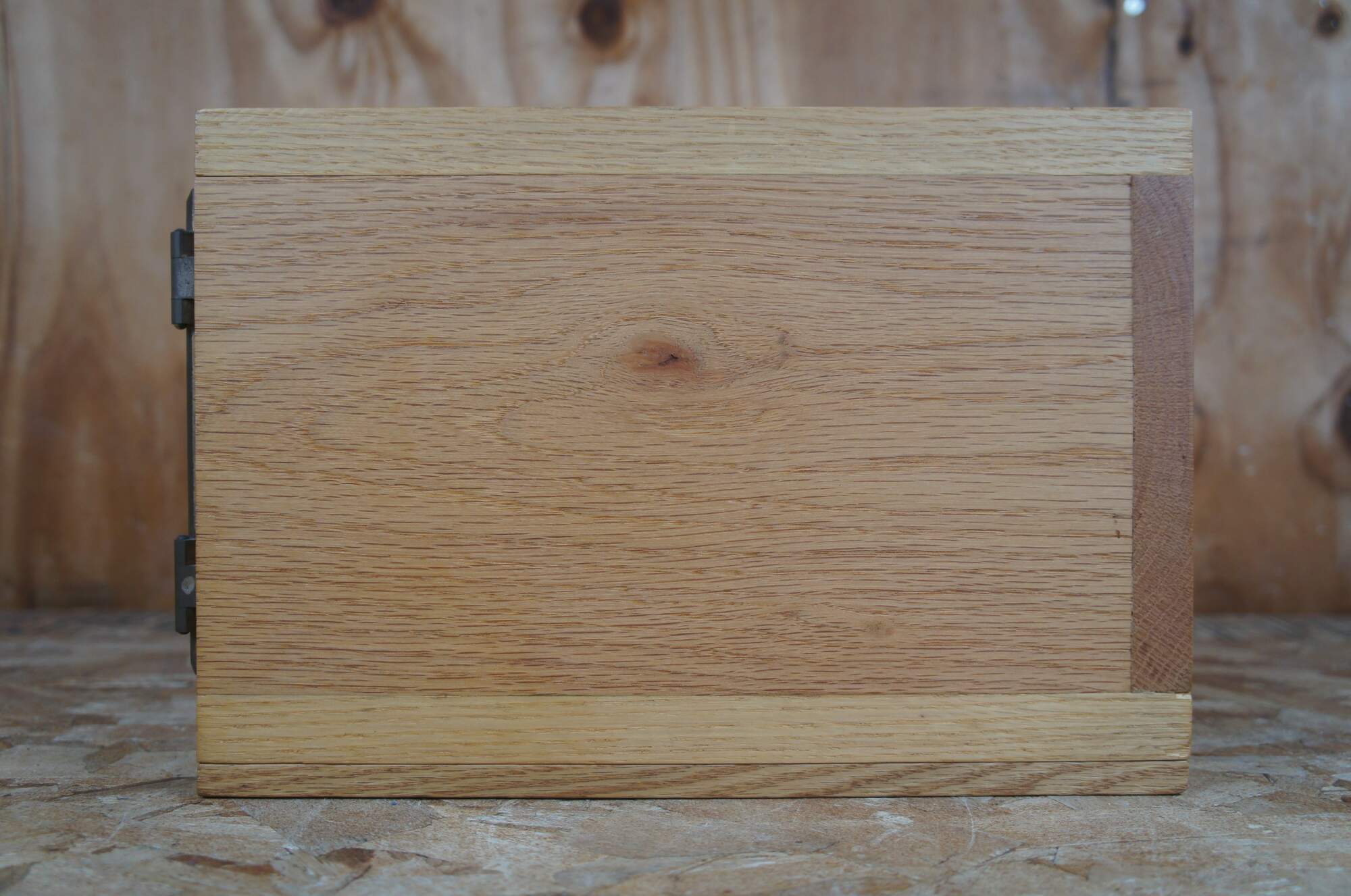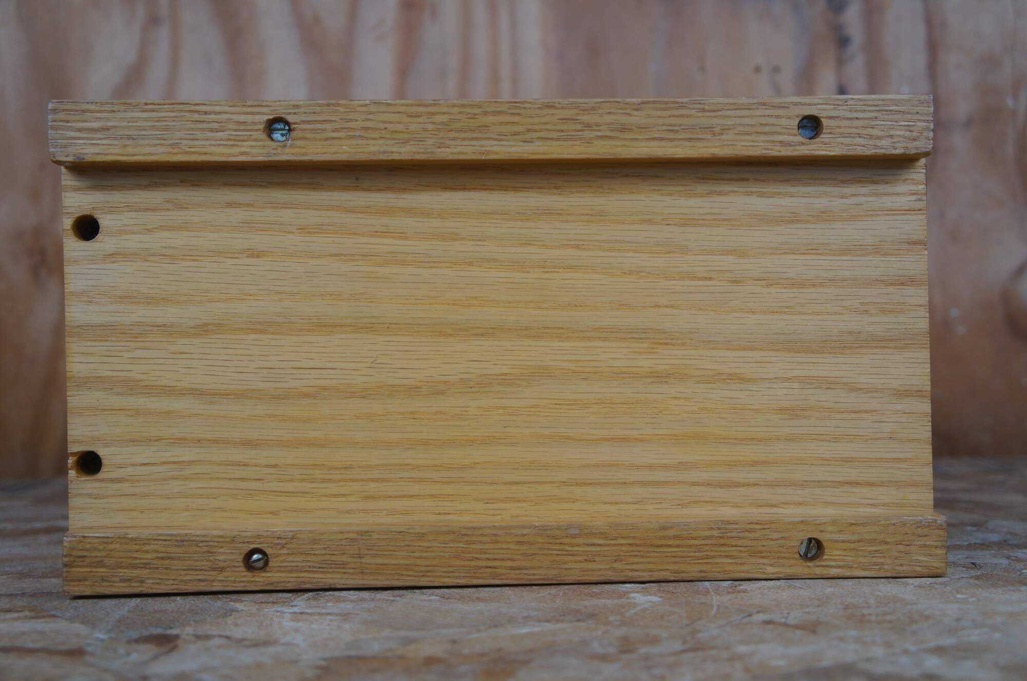 Mid Century Post Office box or bank box made of oak wood with brass greek key and starburst style door with small glass door marked 225.
