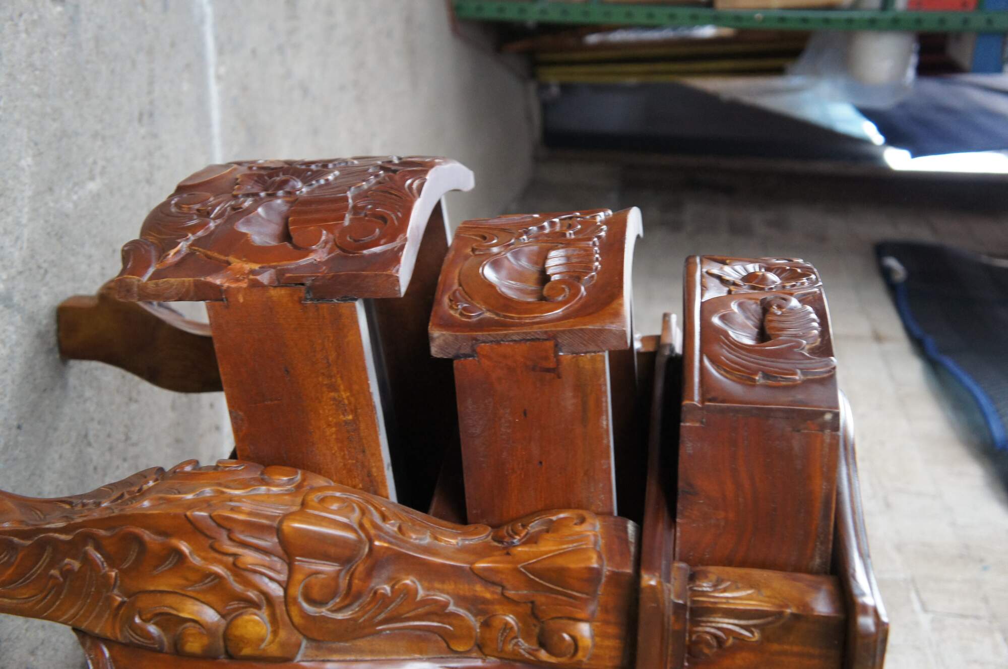 An elegant solid mahogany bedside or accent table. Rococo form with intricate floral and foliate carving. Features a serpentine top with three dovetailed drawers.