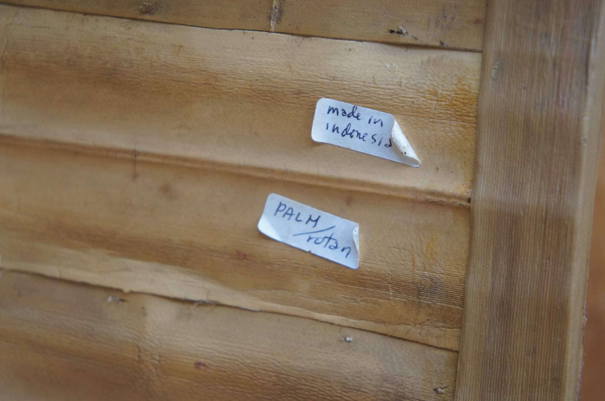 These boxes are known for their stability, which is due to their scaffold of bamboo, which supports the lontar (pandanus palm leaf) walls, base and top. Both the tops and sides of the boxes are reinforced with strips of bamboo, which are also ornamental. The fronts of the boxes are decorated with small white shells in patterns that are curvilinear and non-pictorial in character. The boxes are very light and easy to move around, yet they are strong enough to stand on.
