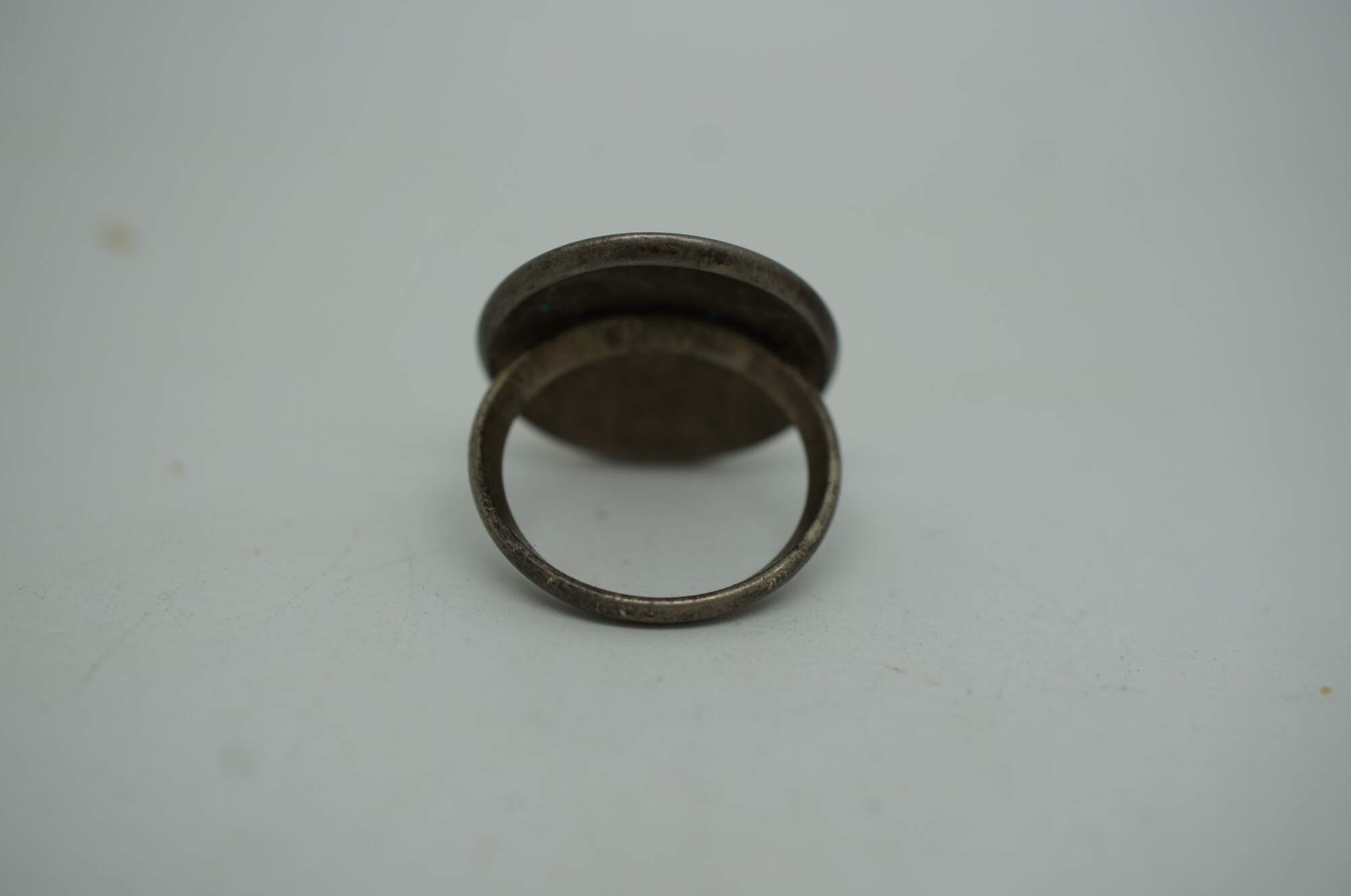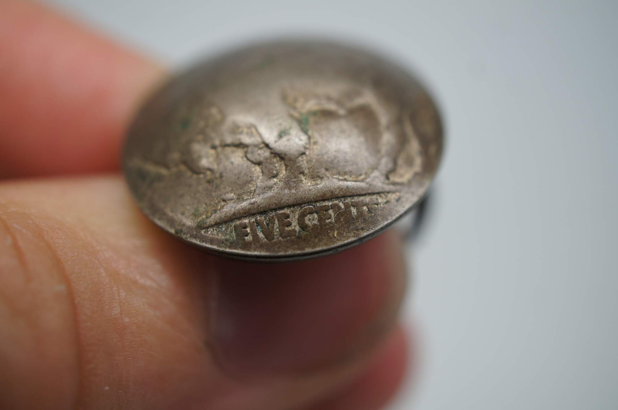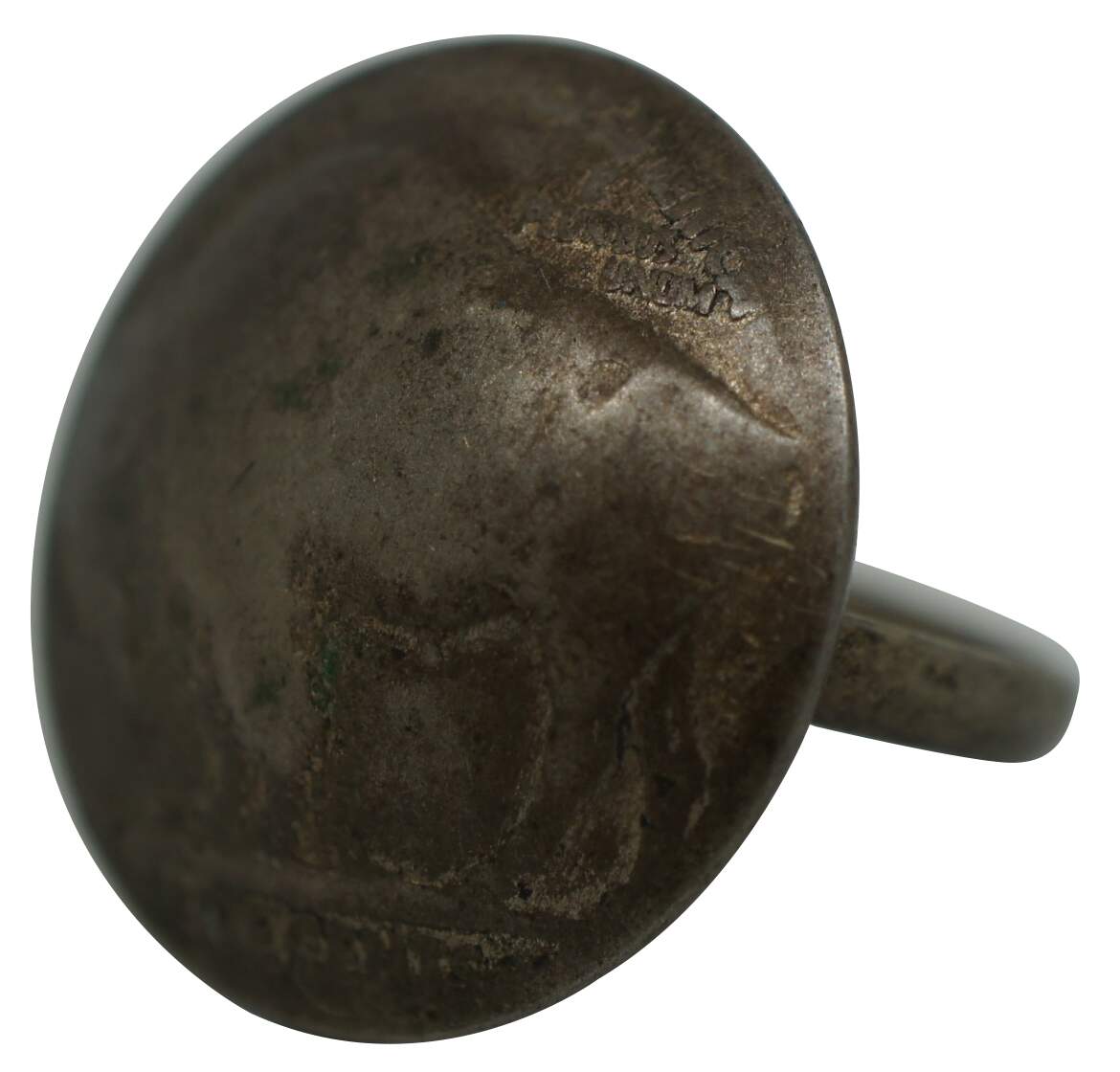 Antique ring made from an American Five Cent Buffalo or Indian Head nickel; buffalo side faces out; year not distinguishable from wear.