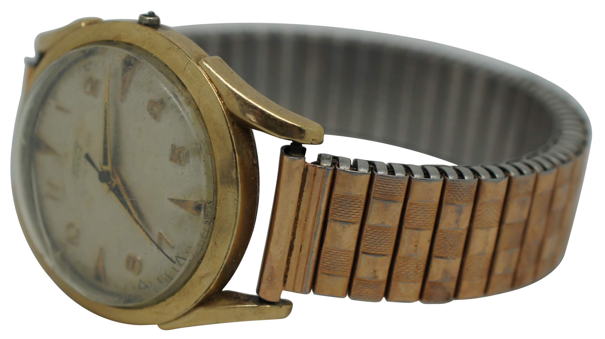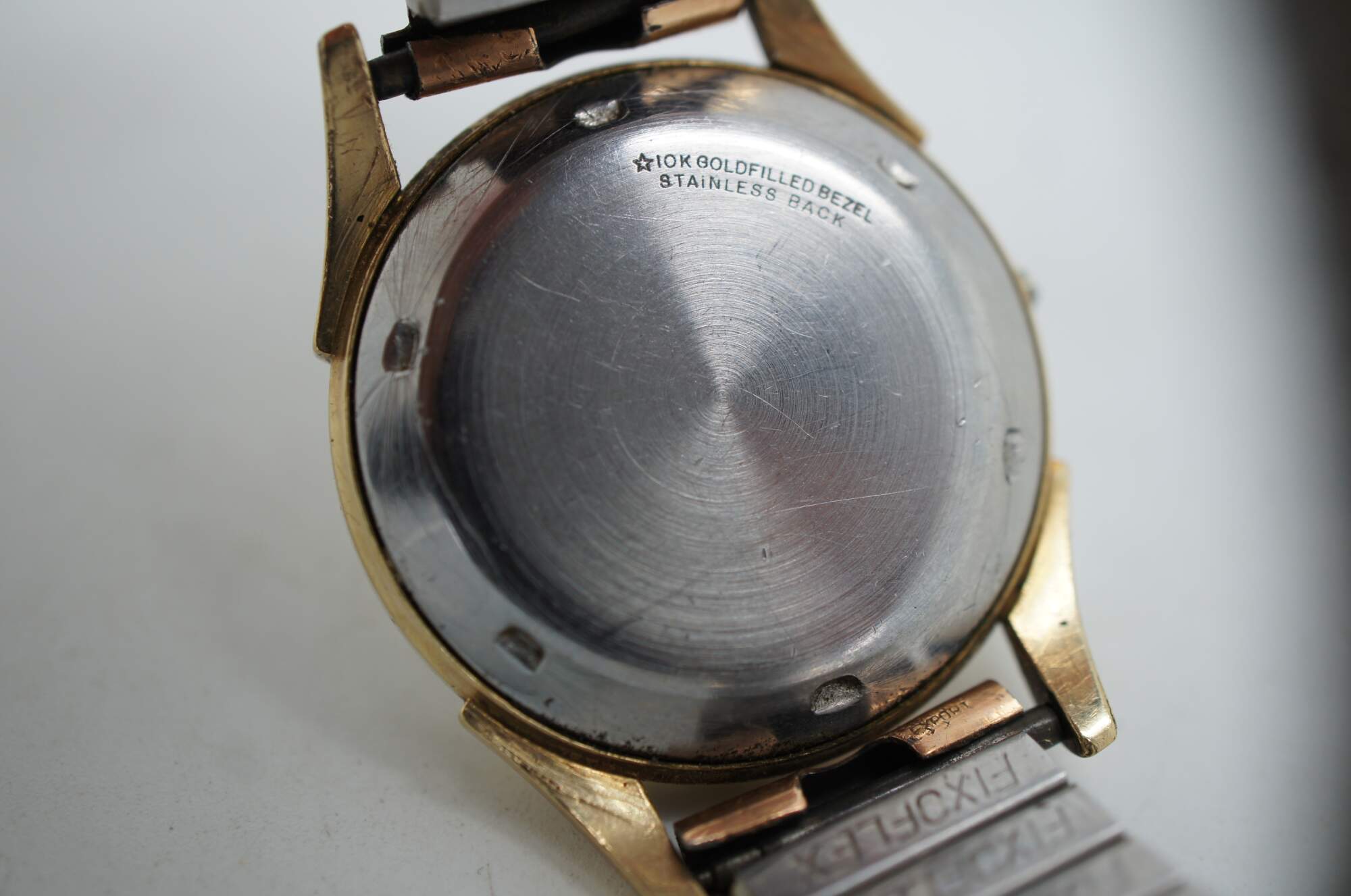 Vintage mid century Tissot Automatic wrist watch with 10k gold filled bezel and stainless back, with a Fixoflex expansion band.