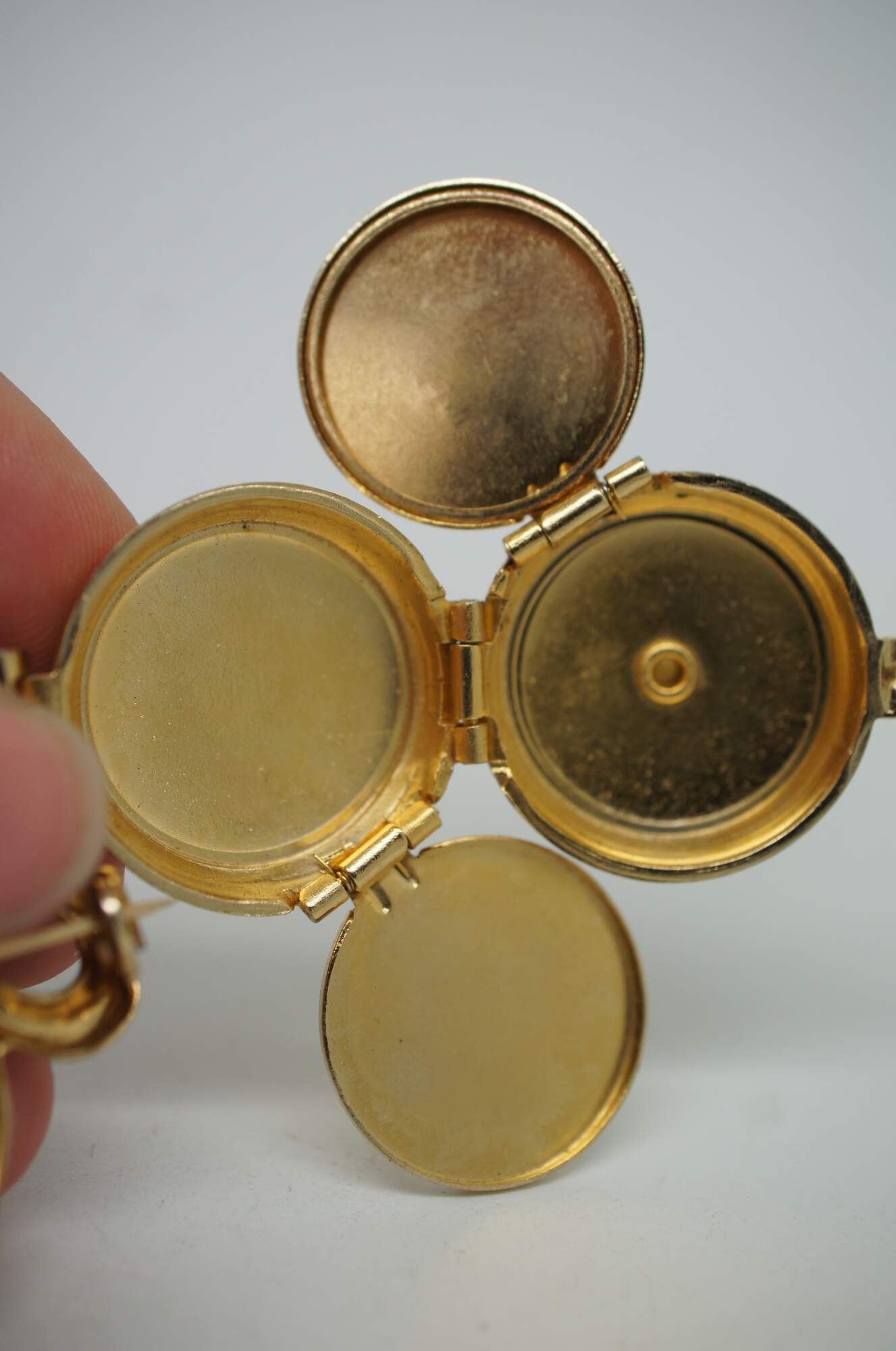 Vintage Coro golden brooch or pin in the shape of a fleur de lis mounted with a solitaire faux pearl, from which hangs a round locket, simply decorated with a flowering shape in pearls on a black lacquered ground, which springs open to reveal spaces for four miniature photographs.