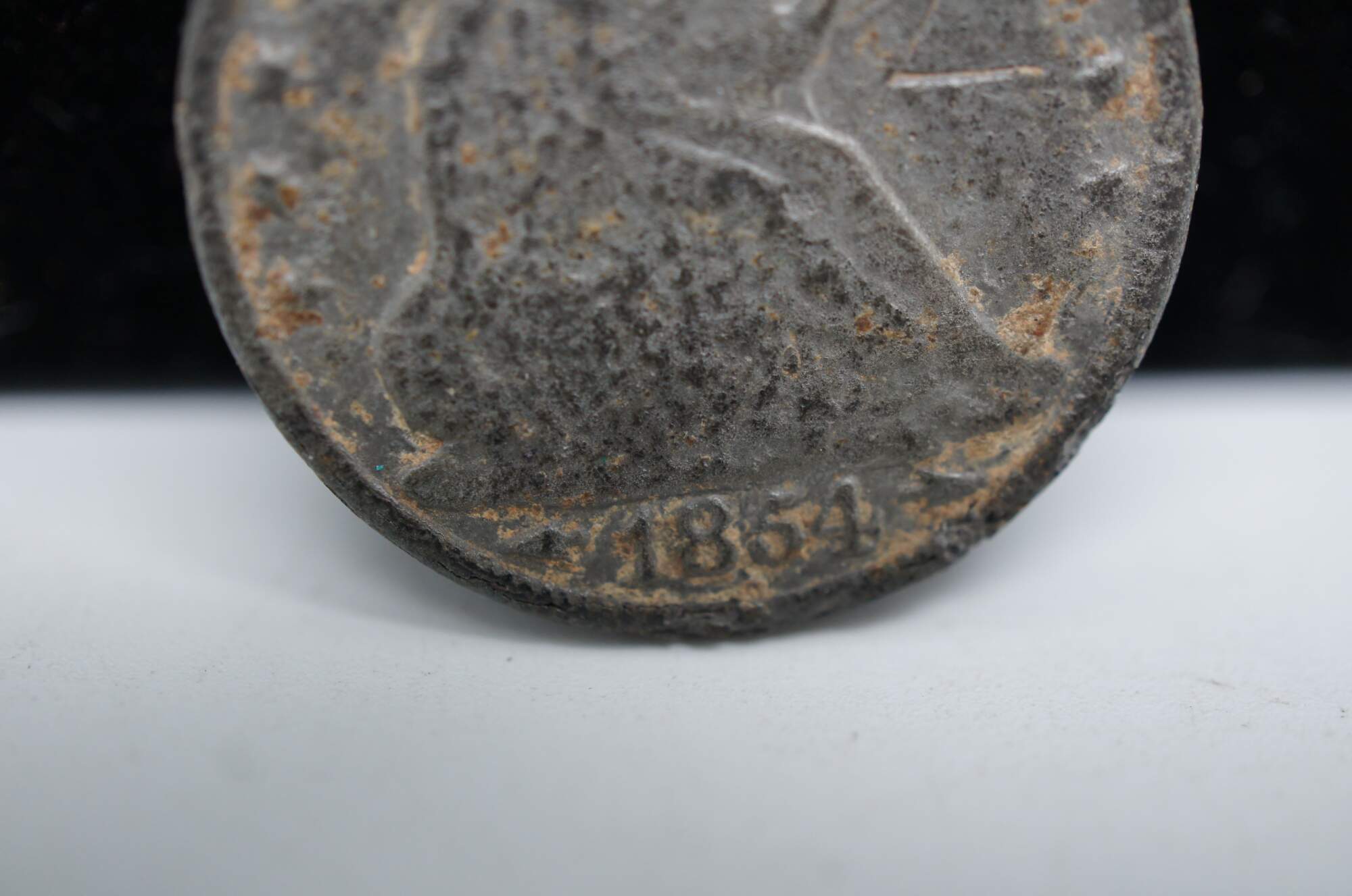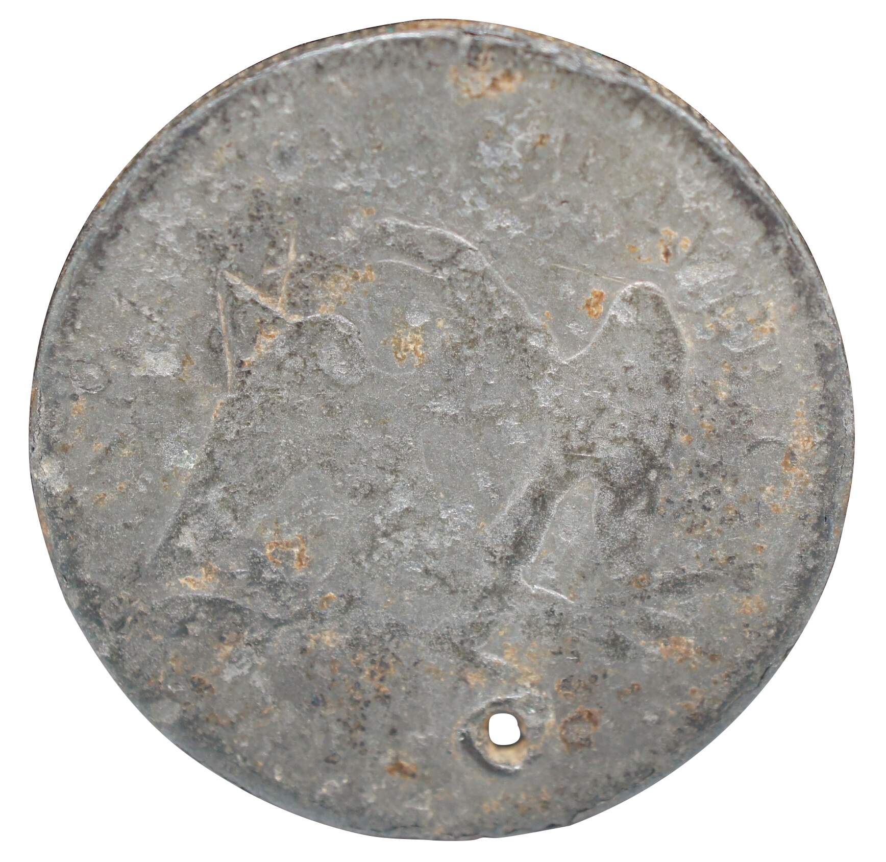 A collectors curiosity piece – 1854 Seated Liberty half dollar coin with drilled hole for wear as a token or charm. Purported by envelope it came in with to be counterfeit, supported by the spots of what appears to be rust on the surface.
