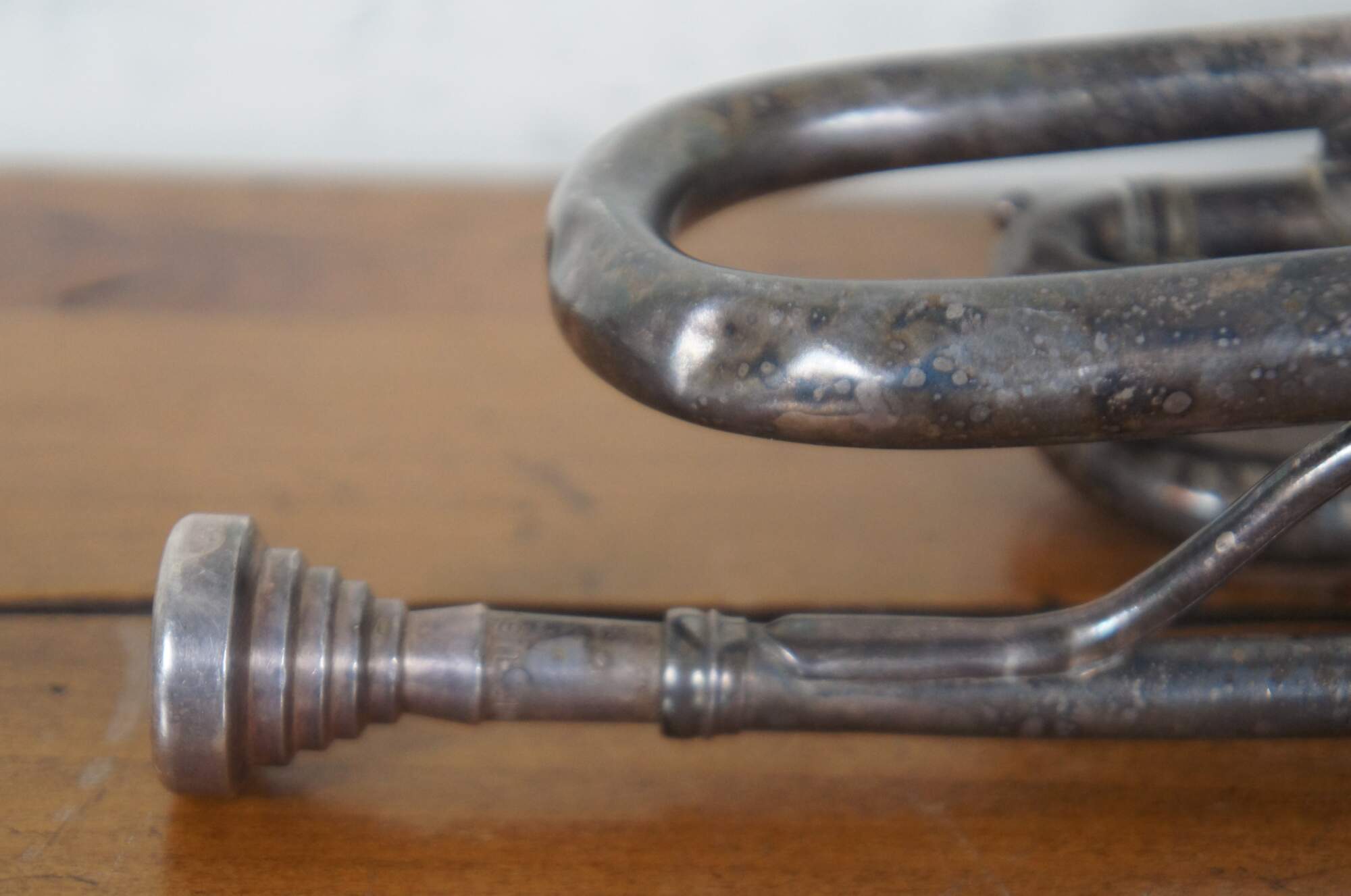 Antique student cornet circa 1939, Indiana model (featuring the earlier “Superlative” design) with Indian head by the Indiana Band Instruments Company. Features mother of pearl inlays on the buttons and E-Z-Tone mouthpiece. “The Martin Band Instrument Company was incorporated in early 1906 following the death of the family patriarch, John Henry Martin, in late 1905. He had previously formed the J. H. Martin Band Instrument Company in 1904 but there are no known
