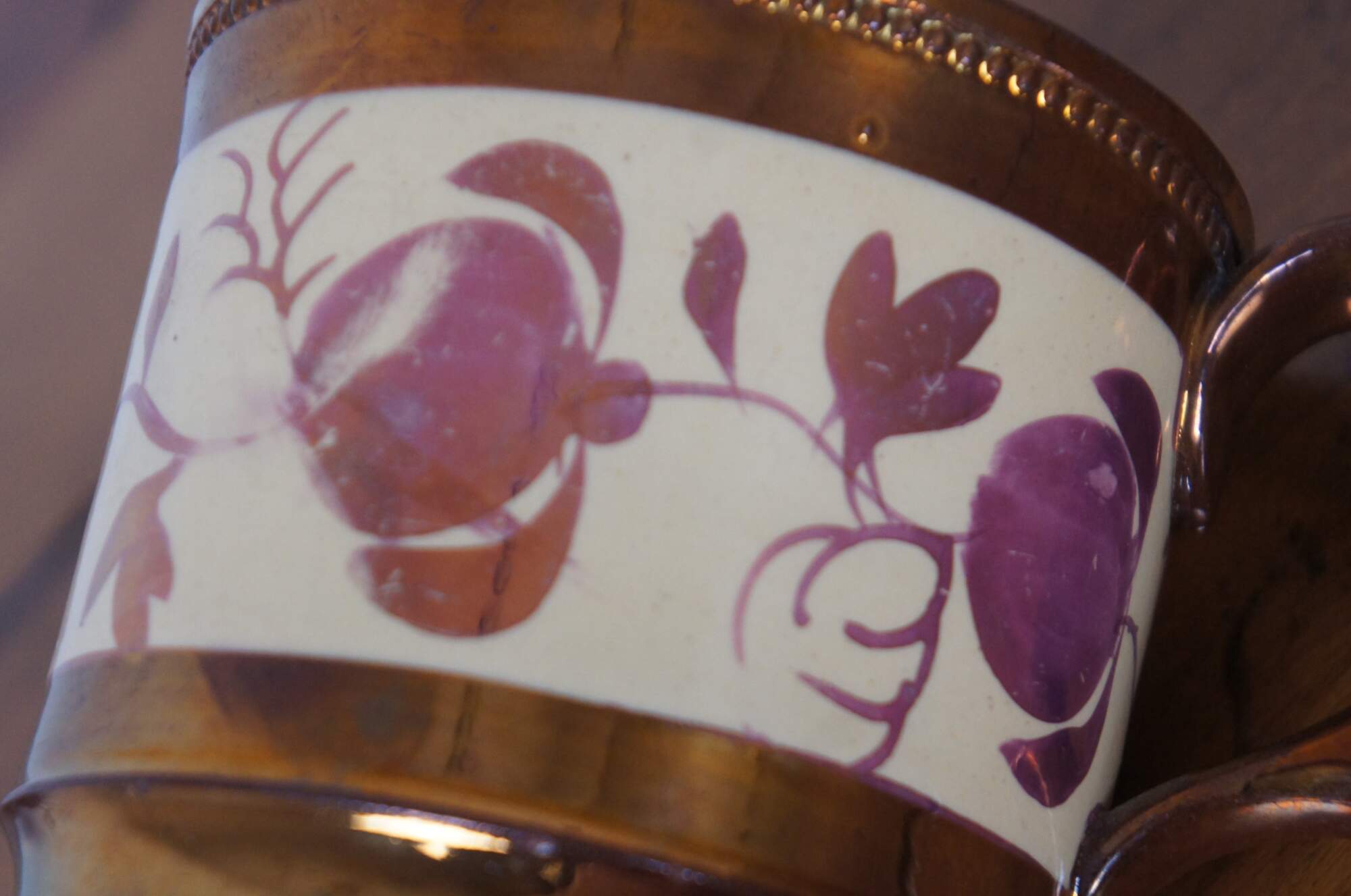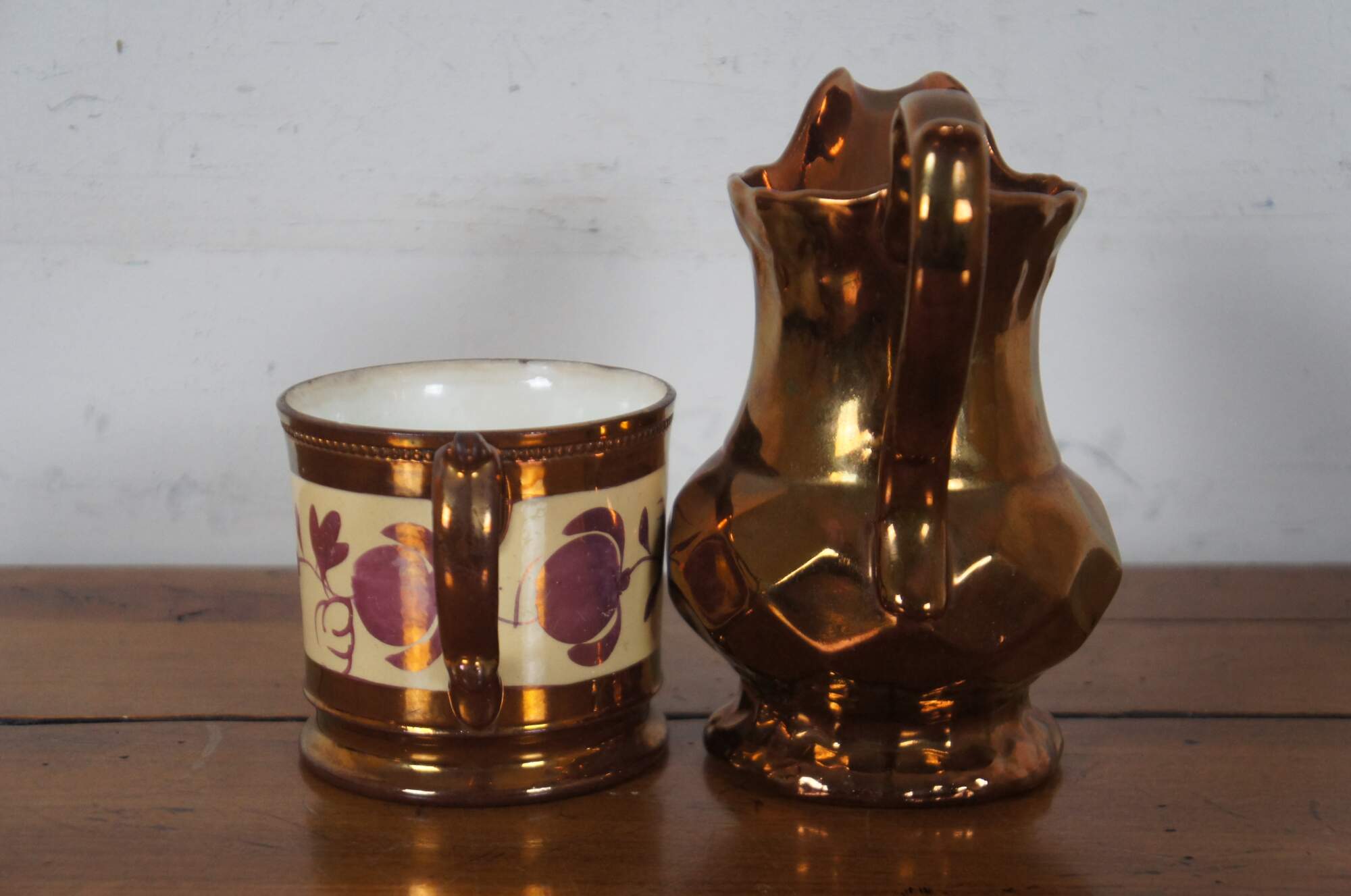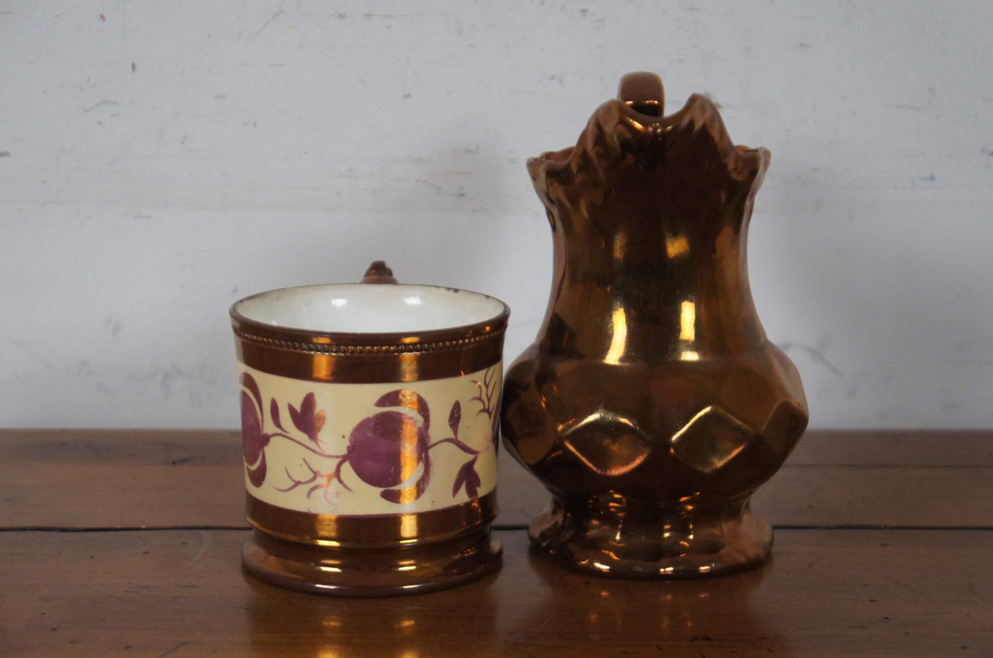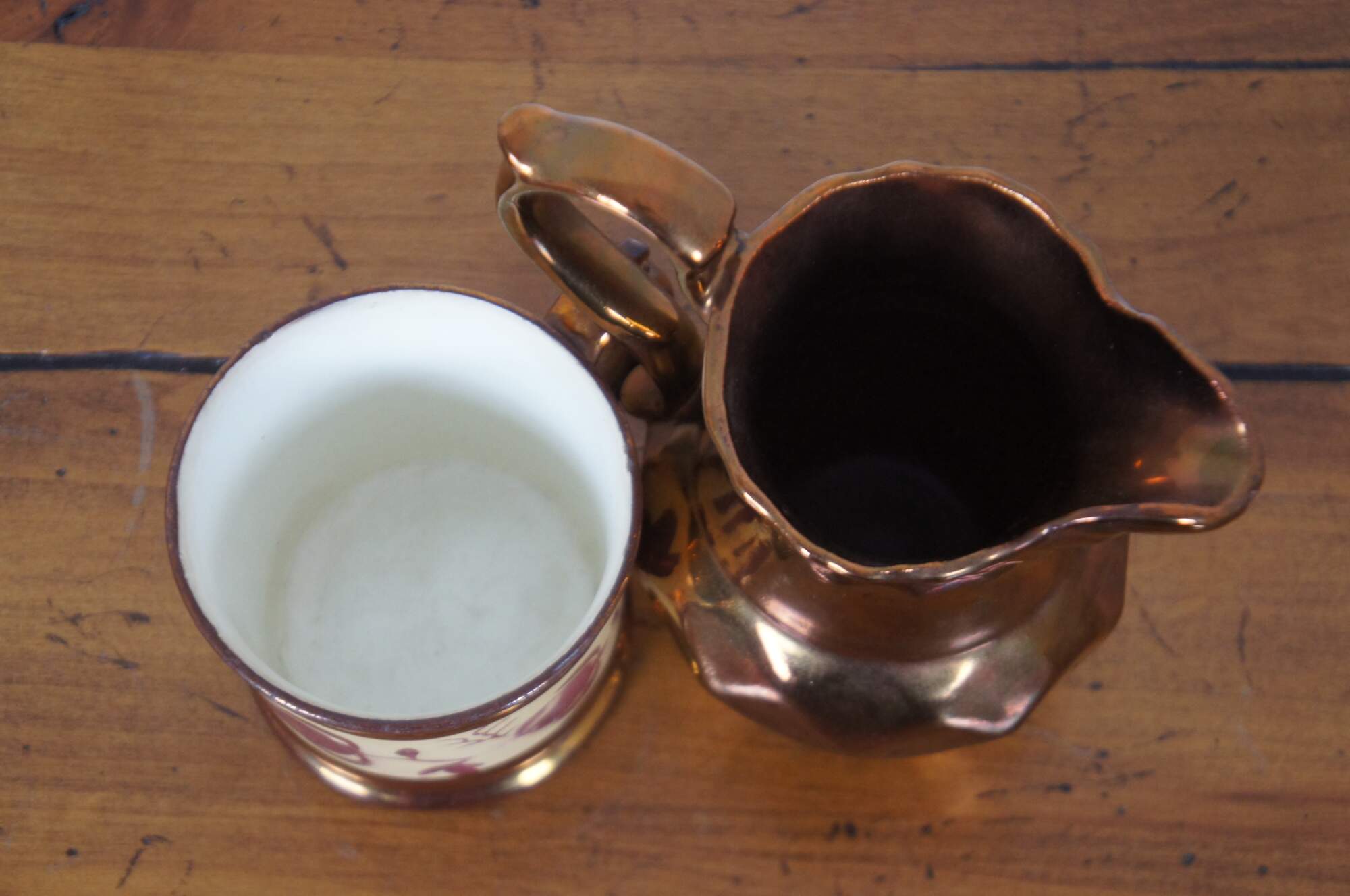 Antique 19th century copper lustre ware porcelain water pitcher with a diamond design around the middle, paired with a large mug with a cream colored band around the middle accented with a pink lustre vine of roses. “Lustreware or Lusterware (respectively the spellings for British English and American English) is a type of pottery or porcelain with a metallic glaze that gives the effect of iridescence. It is produced by metallic oxides in an overglaze finish, which is given a second firing at a lower temperature in a ""muffle kiln"", or a reduction kiln, excluding oxygen.