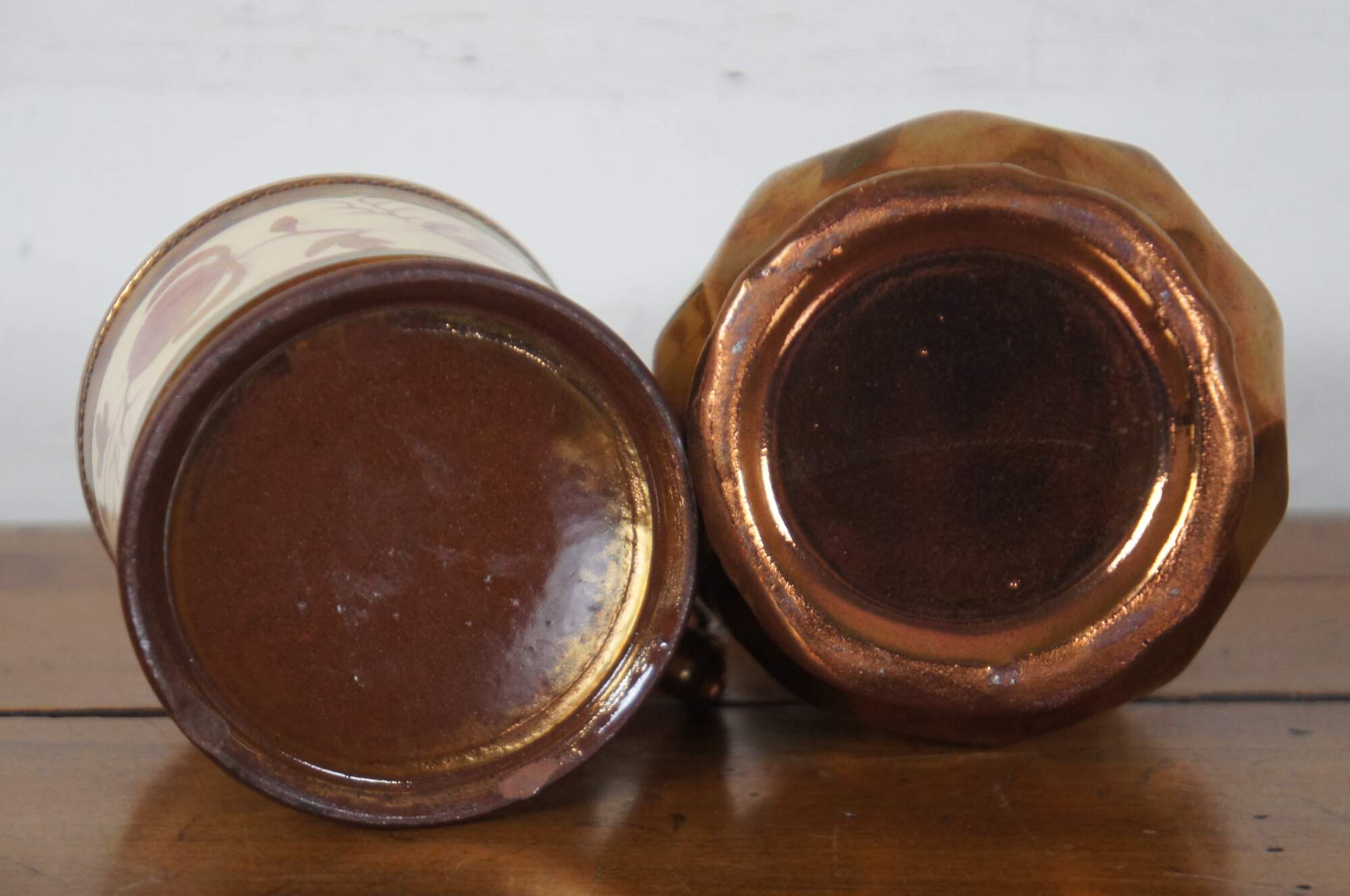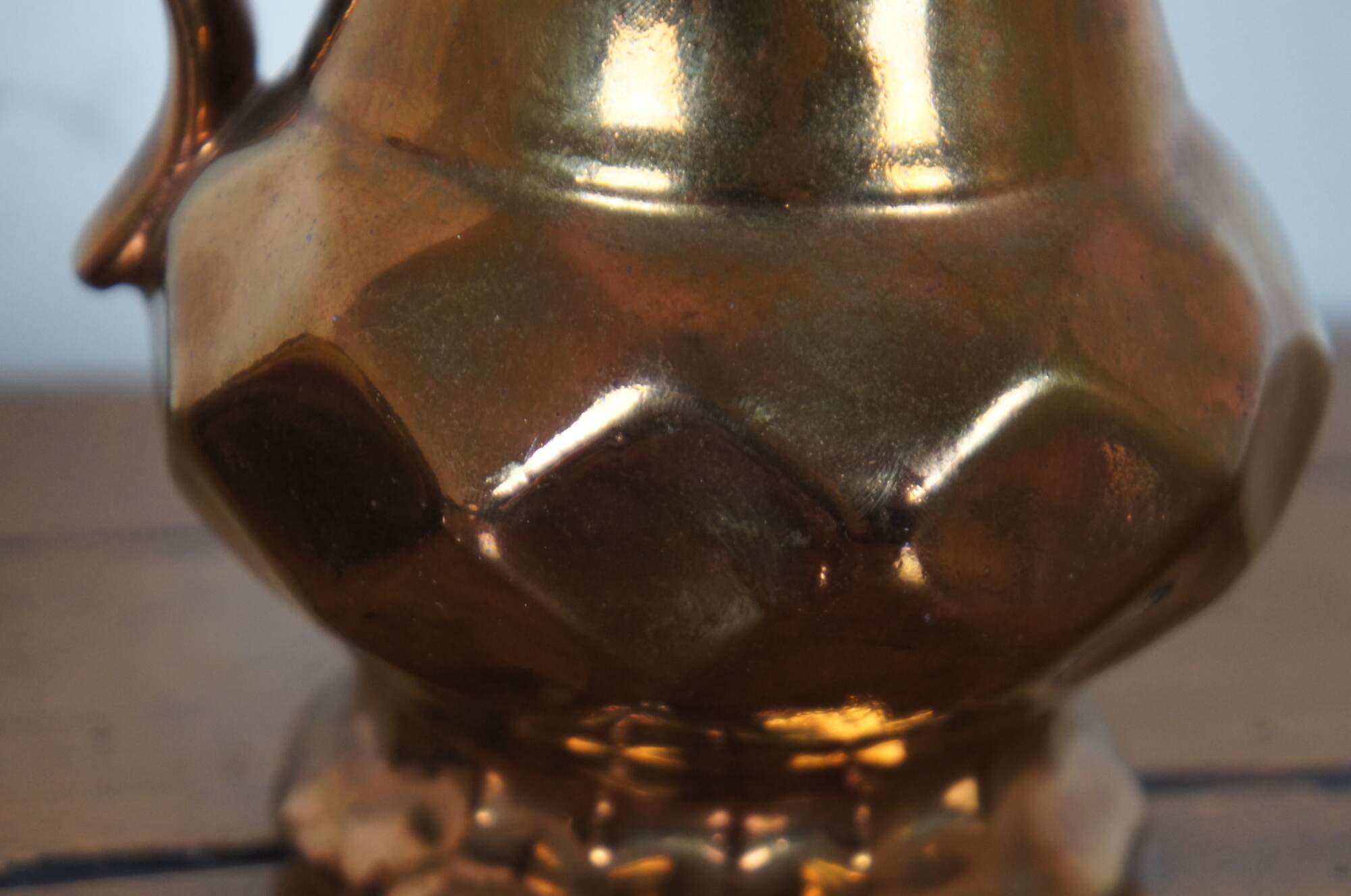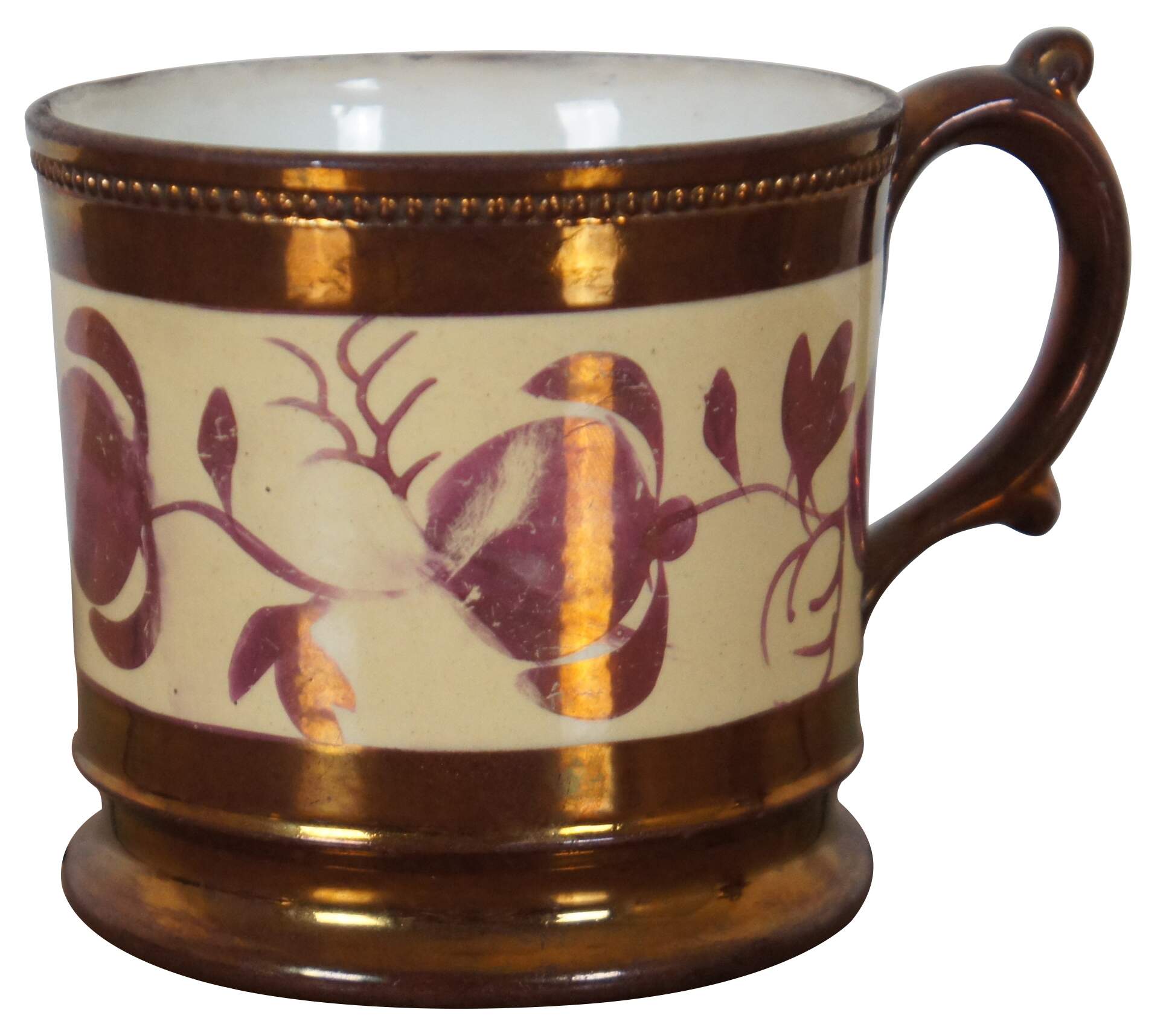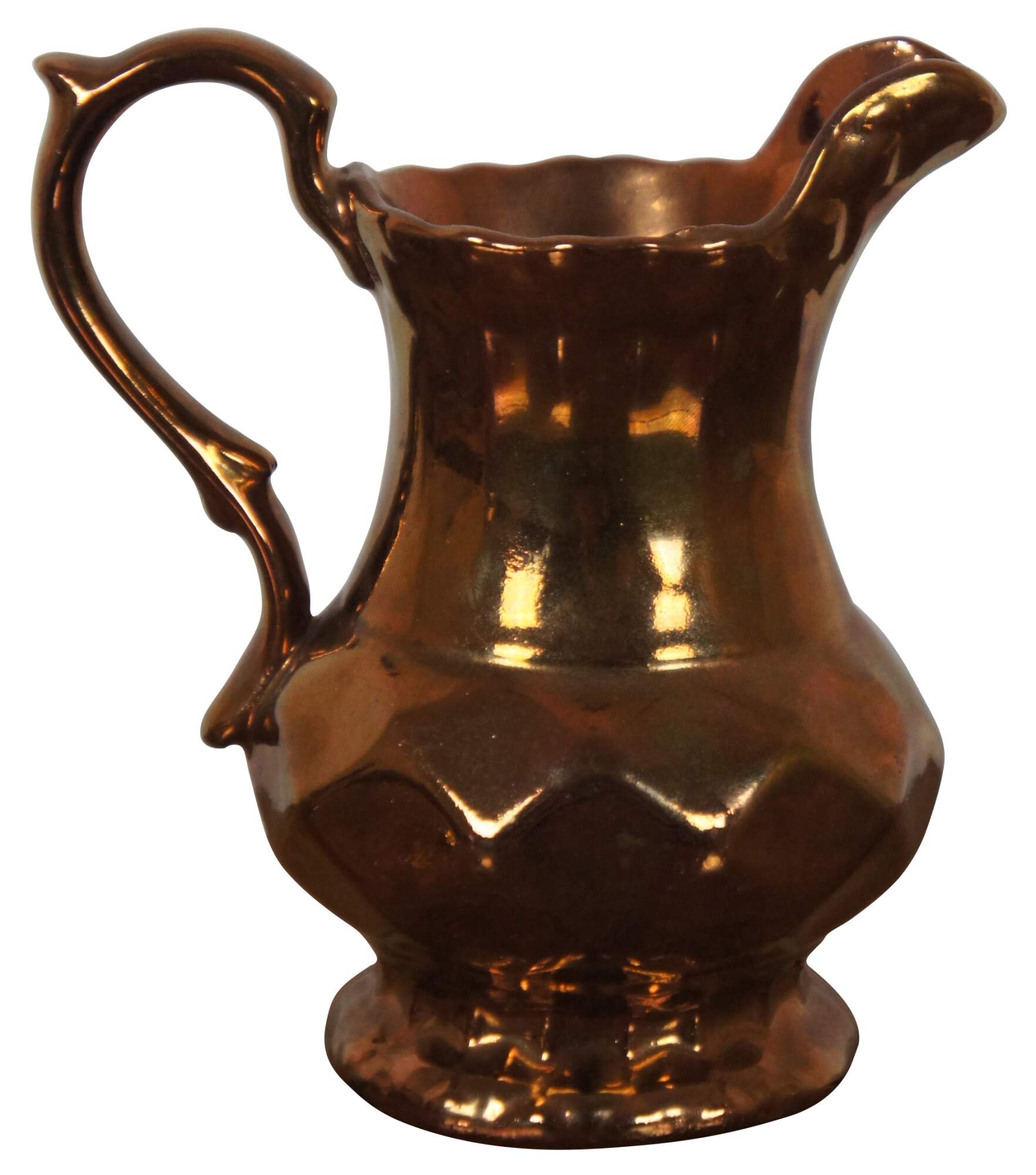 Antique 19th century copper lustre ware porcelain water pitcher with a diamond design around the middle, paired with a large mug with a cream colored band around the middle accented with a pink lustre vine of roses. “Lustreware or Lusterware (respectively the spellings for British English and American English) is a type of pottery or porcelain with a metallic glaze that gives the effect of iridescence. It is produced by metallic oxides in an overglaze finish, which is given a second firing at a lower temperature in a ""muffle kiln"", or a reduction kiln, excluding oxygen.