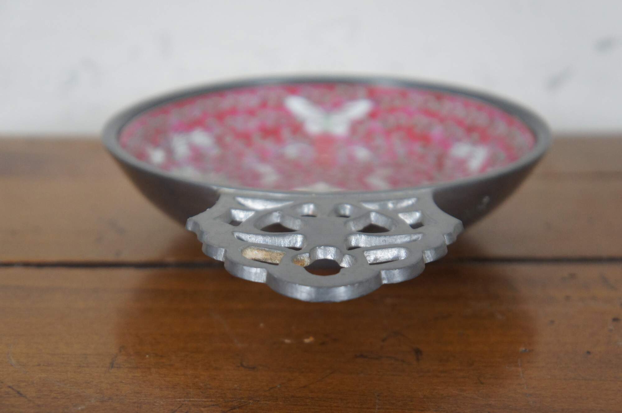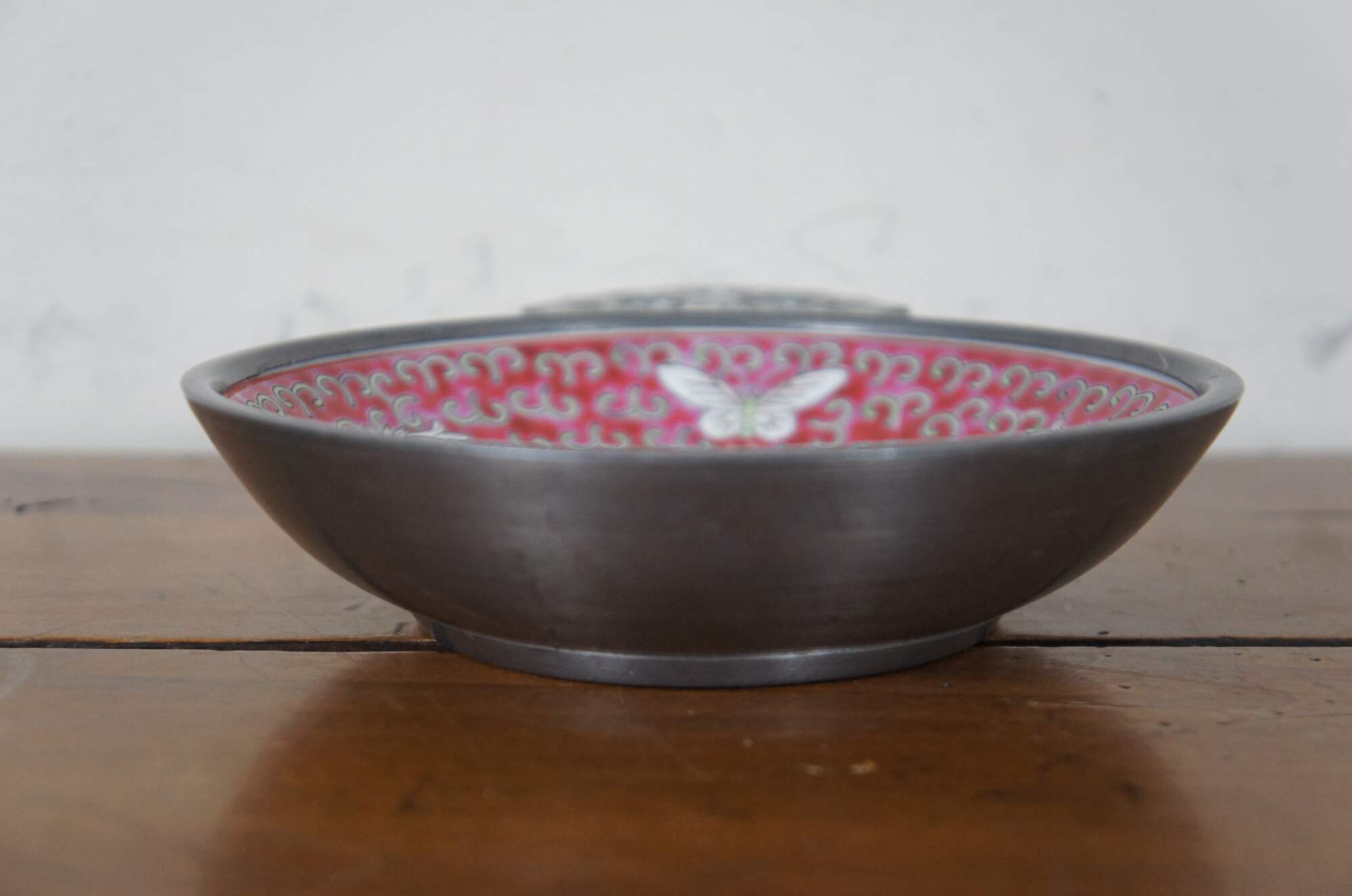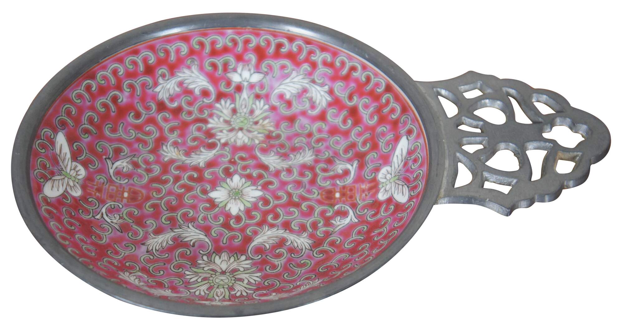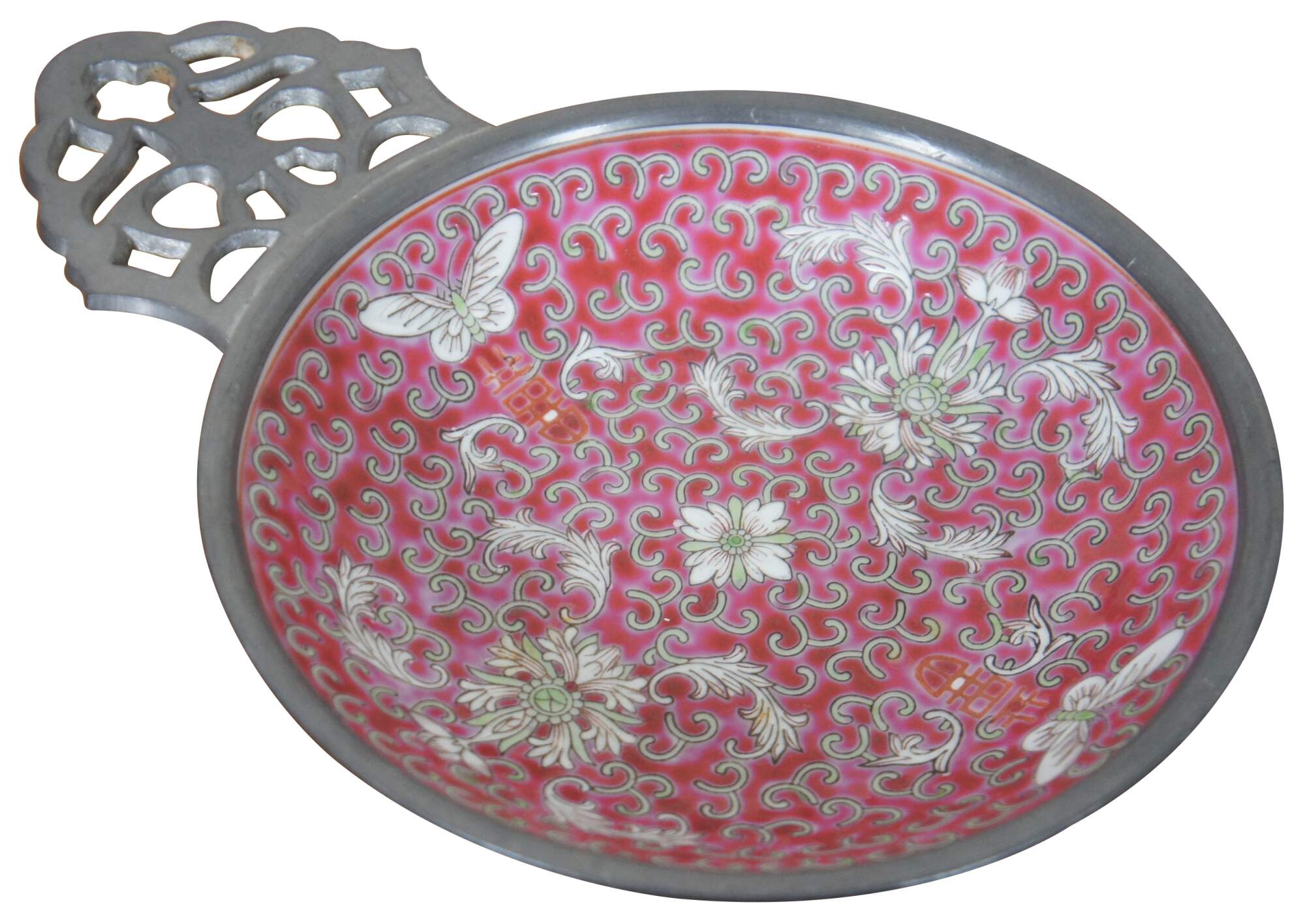 Vintage Hong Horizons canton ware hand painted cloisonne double happiness / marriage porcelain bowl, dish or wall plaque featuring butterflies, lotus flowers, chrysanthemums and a plum flower. Made in Hong Kong and Jingdezhen.